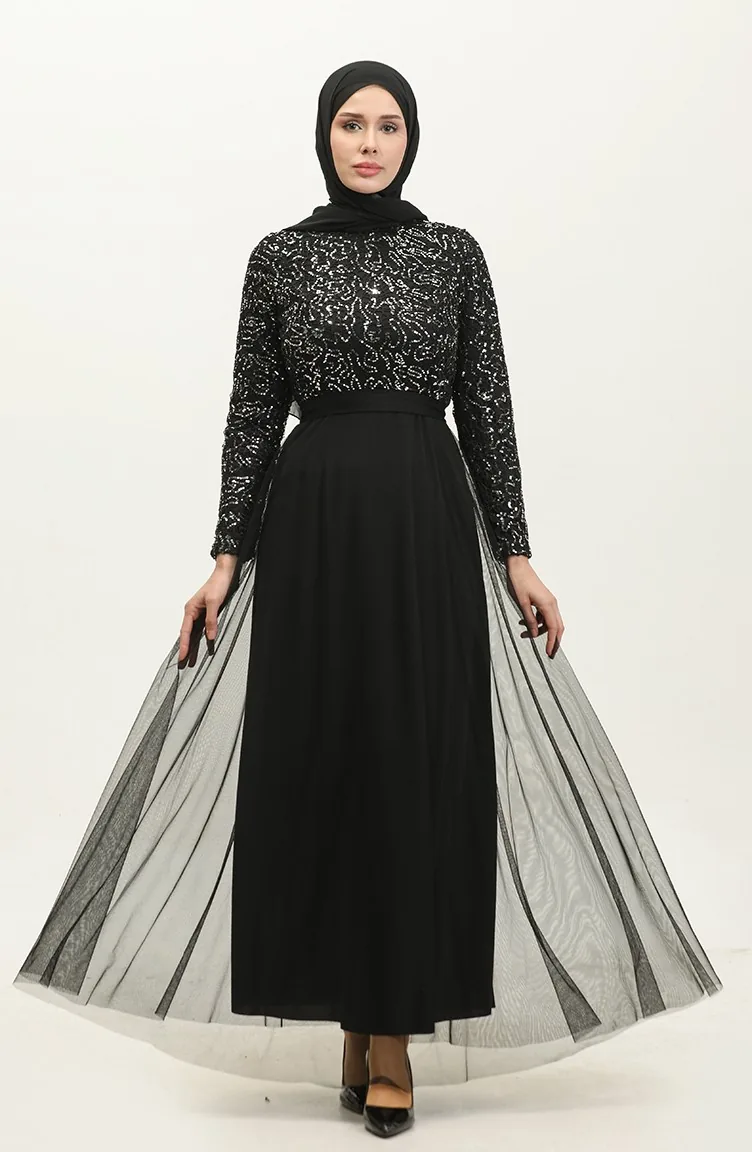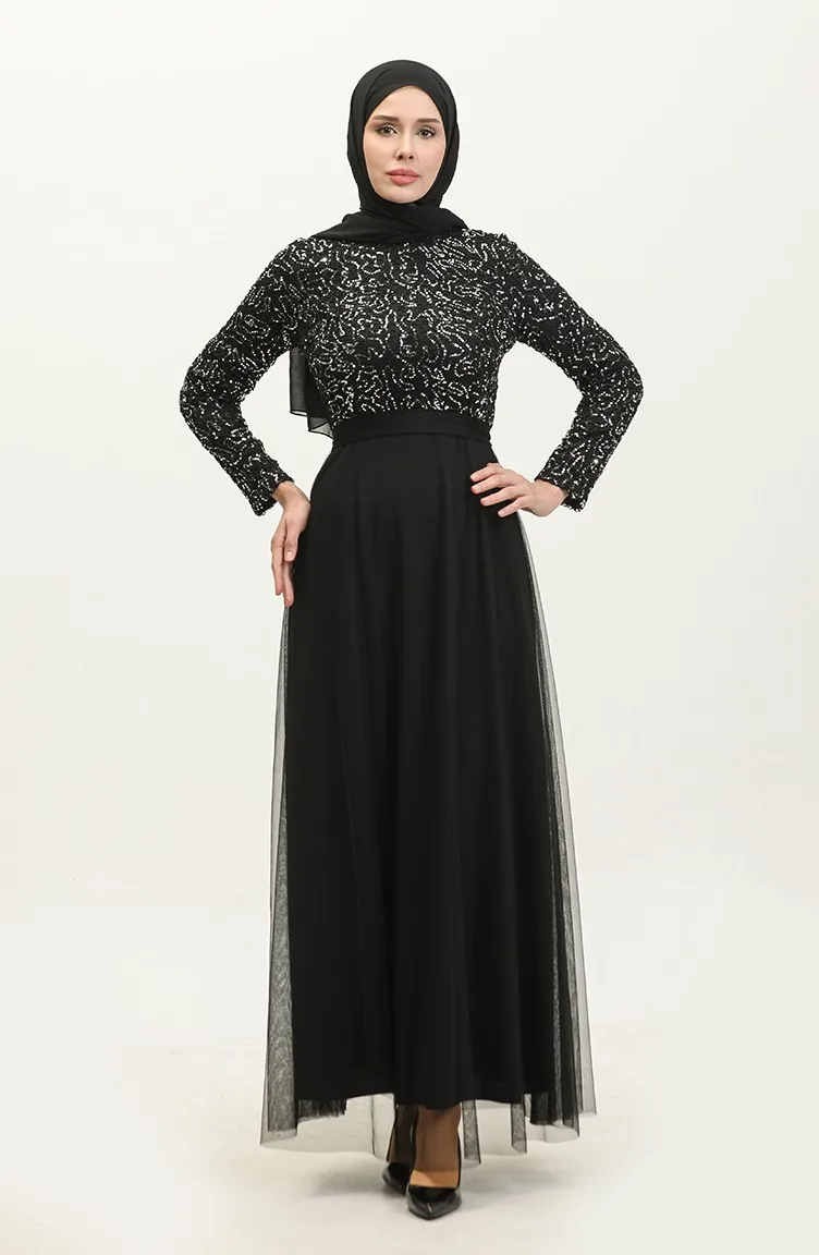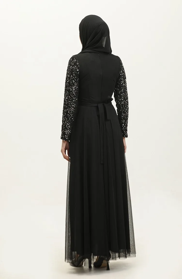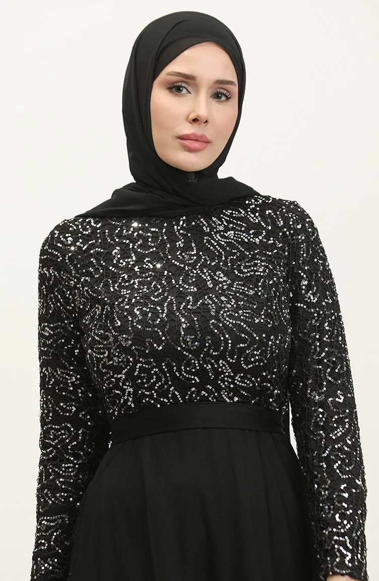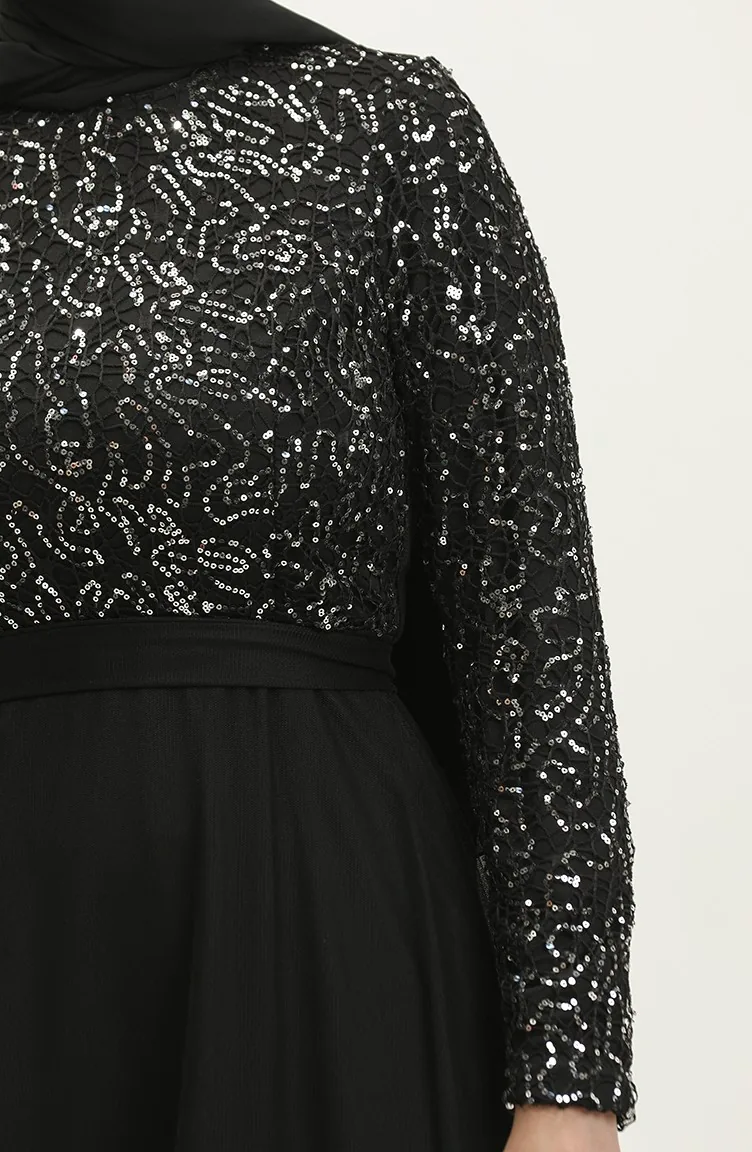 Dantelli Kuşaklı Abiye Elbise 5353A-04 Siyah Gümüş