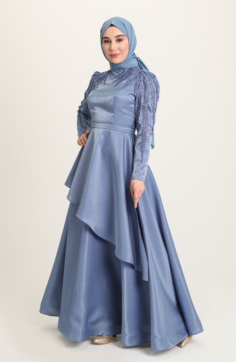 Gülşen Krep Saten Tesettür Abiye Elbise 4958-02 İndigo