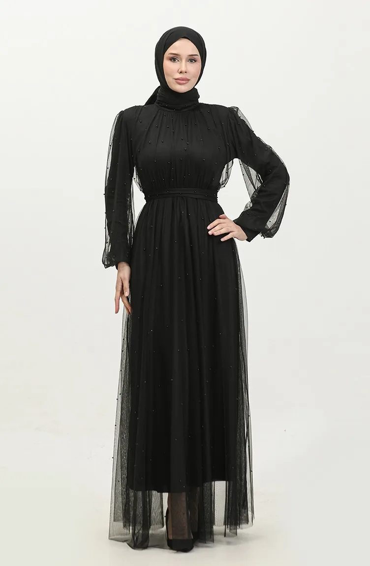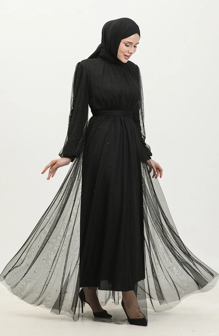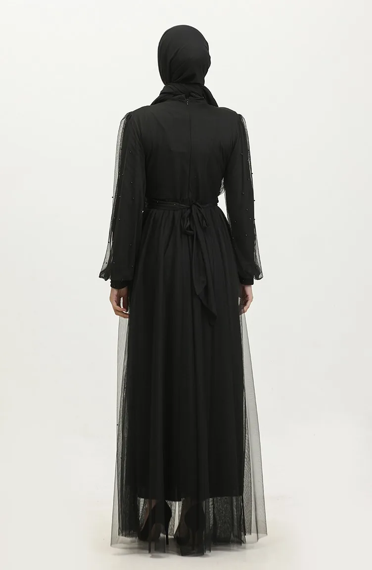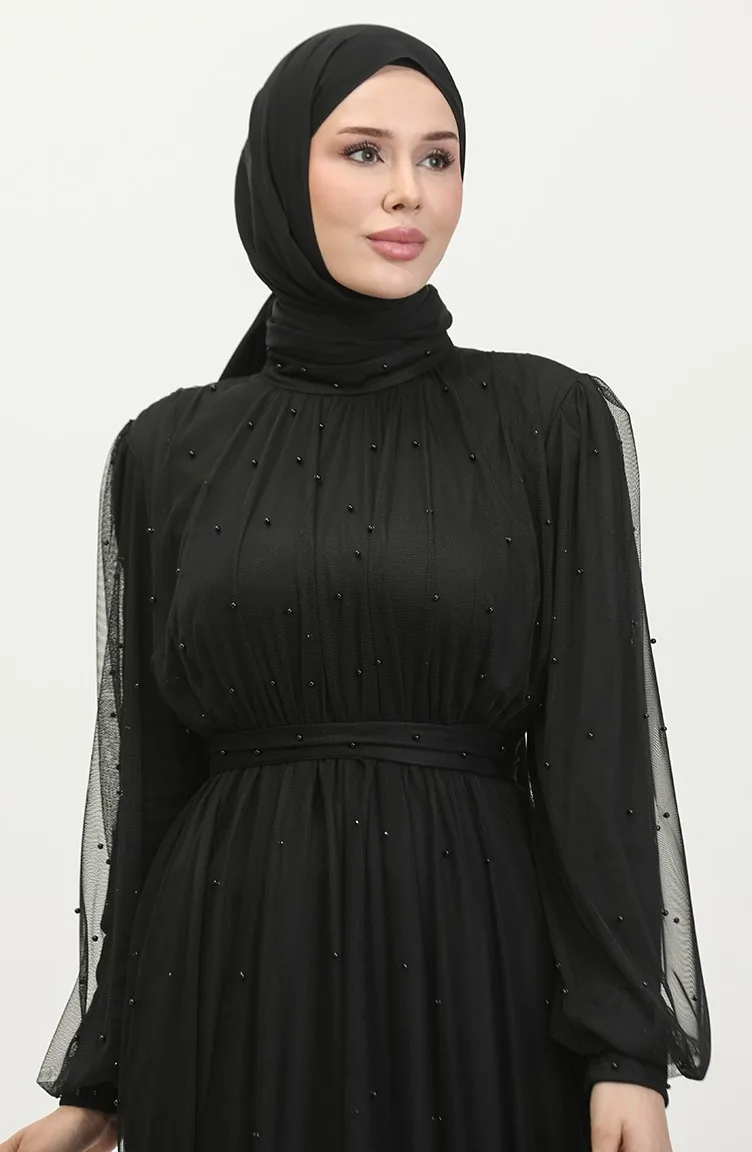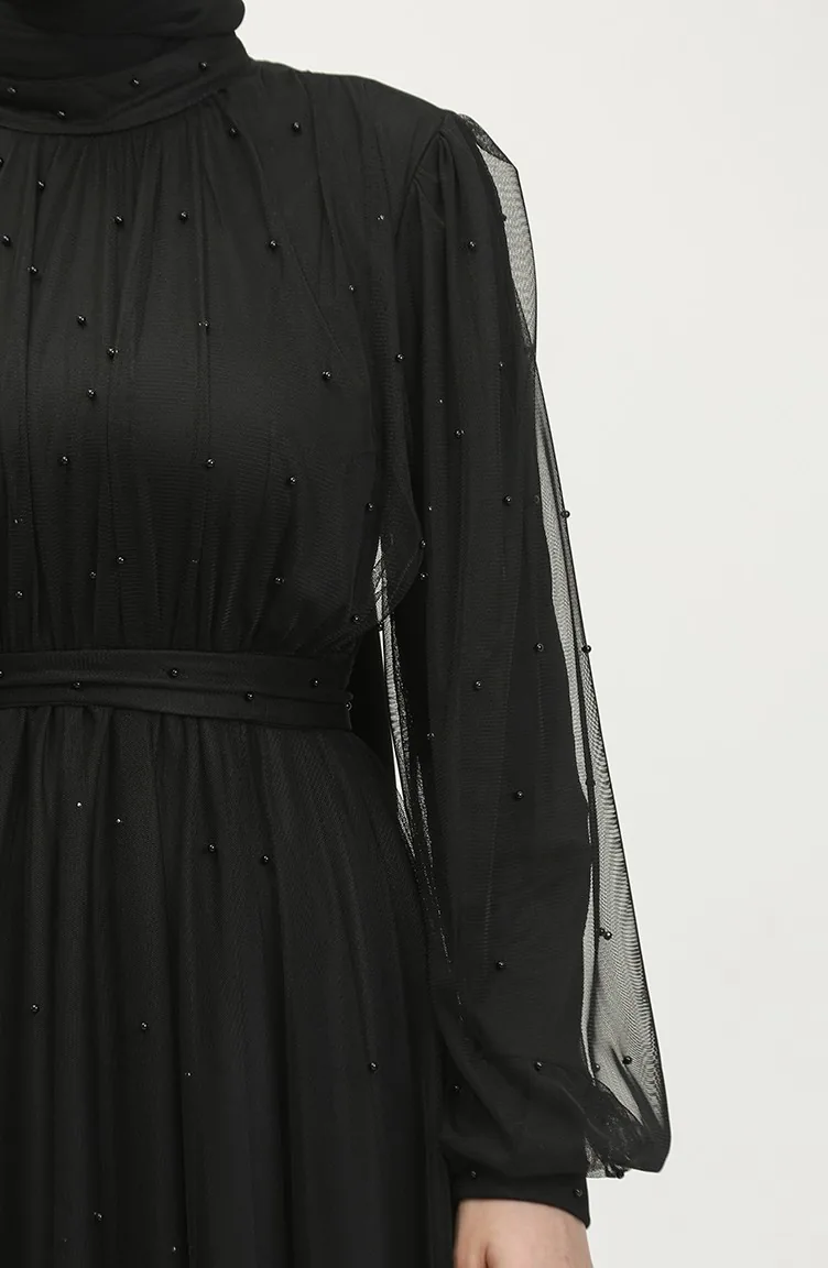 İncili Tül Abiye Elbise 6233-03 Siyah