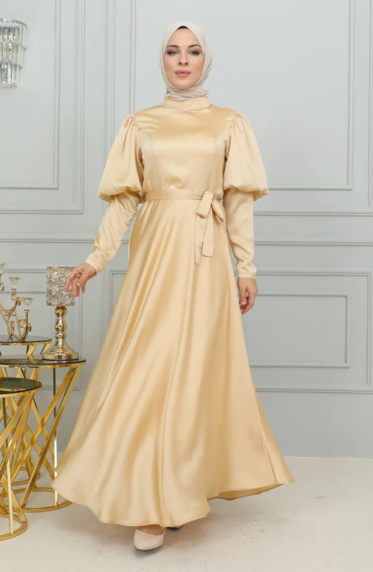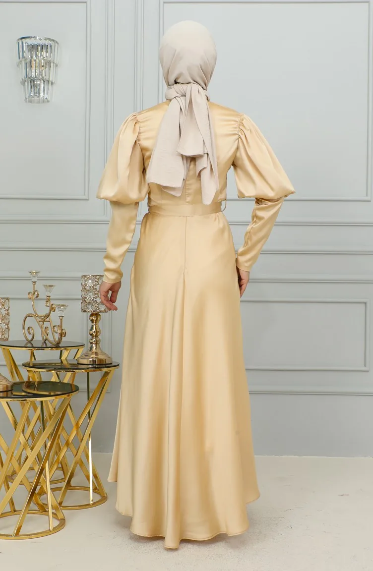 Kol Detaylı Kuplu Abiye Elbise 6084-03 Gold