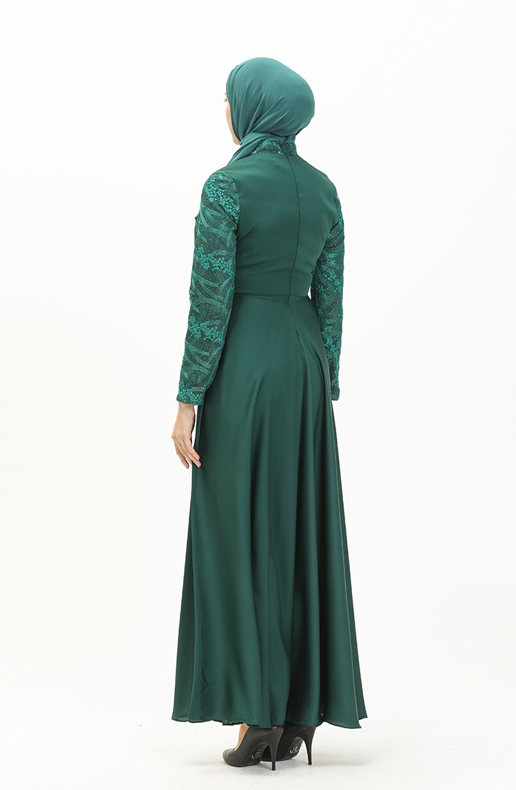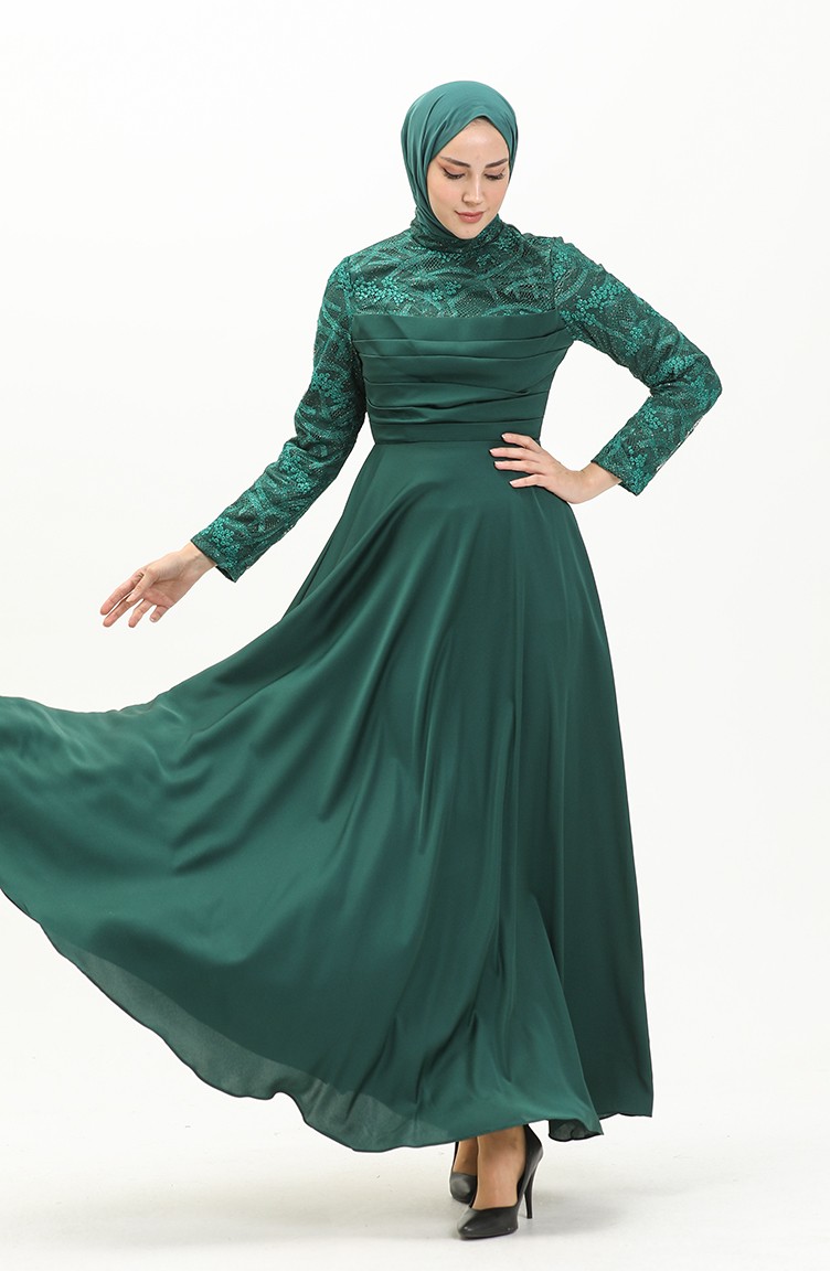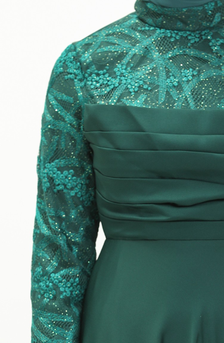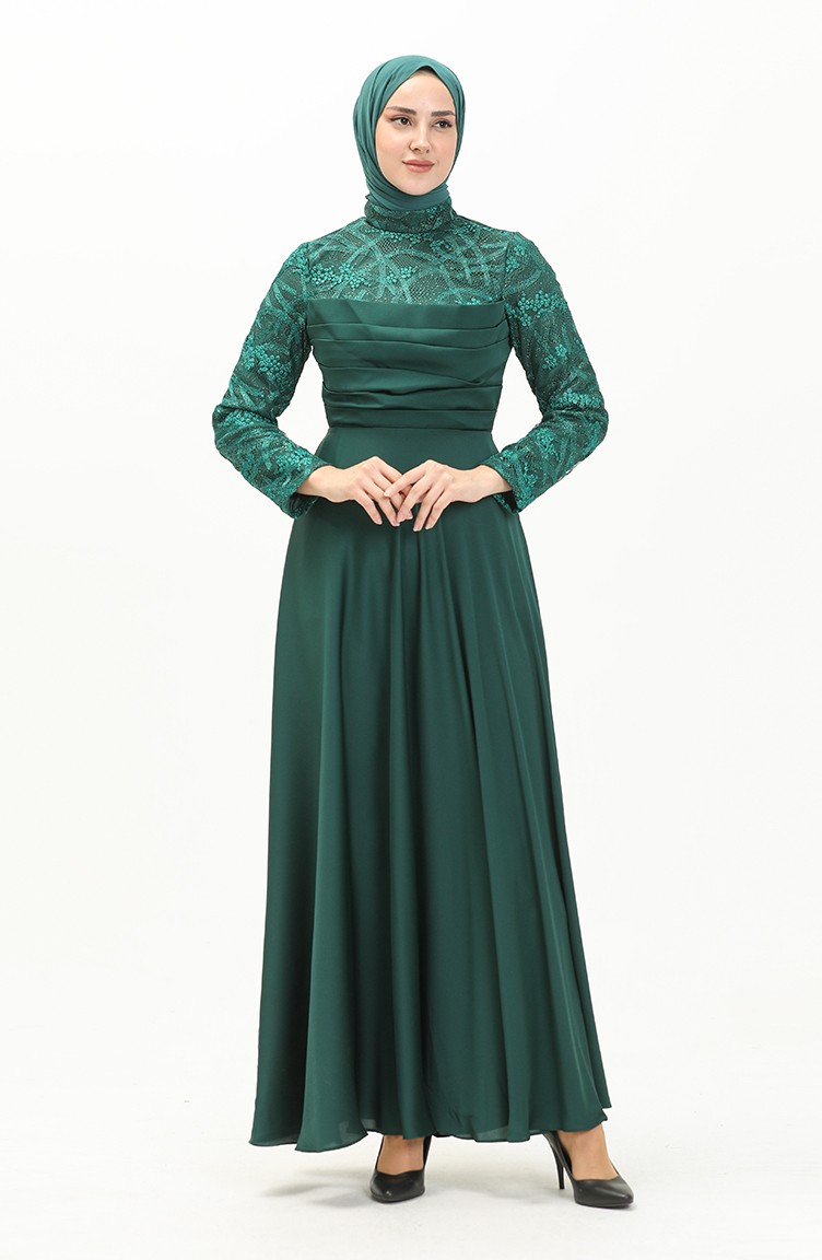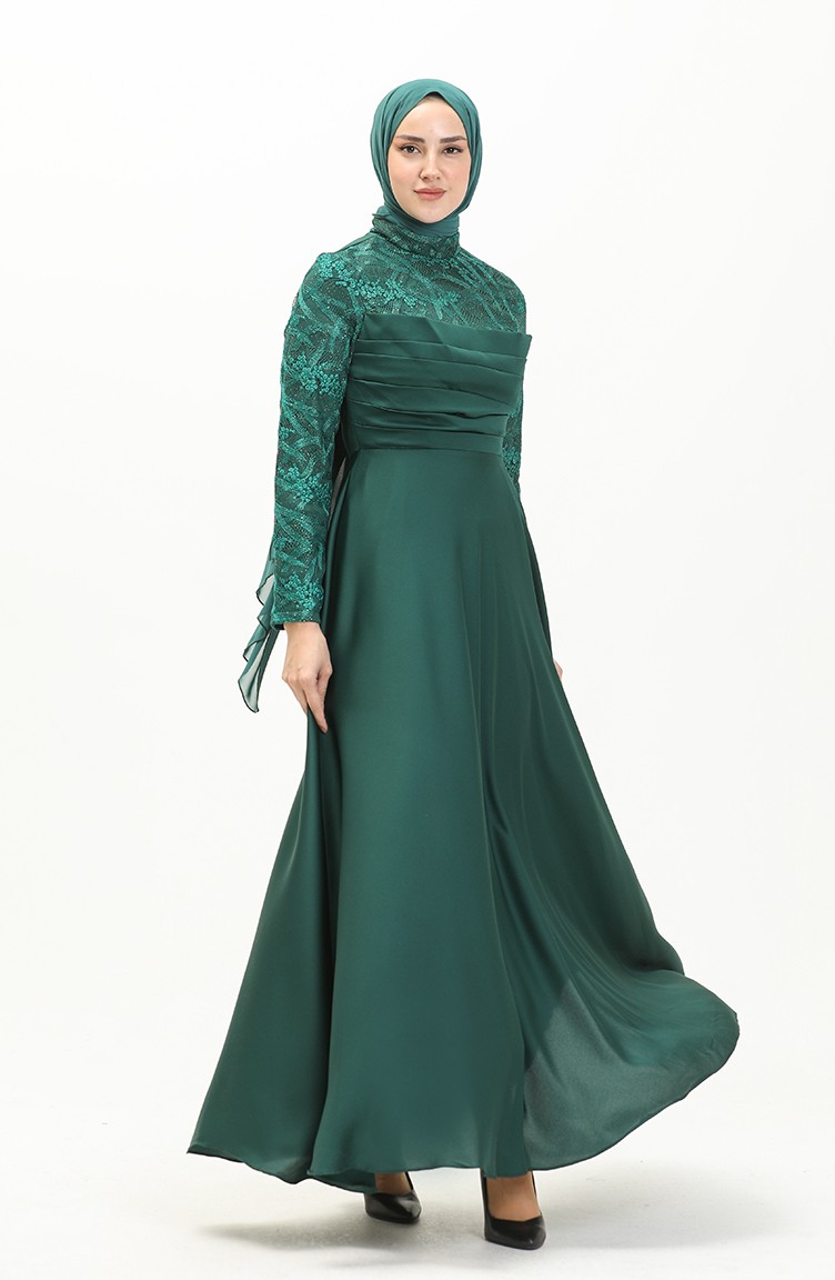 Önü Büzgülü Dantelli Elbise Zümrüt Yeşili