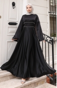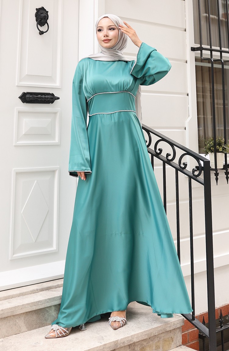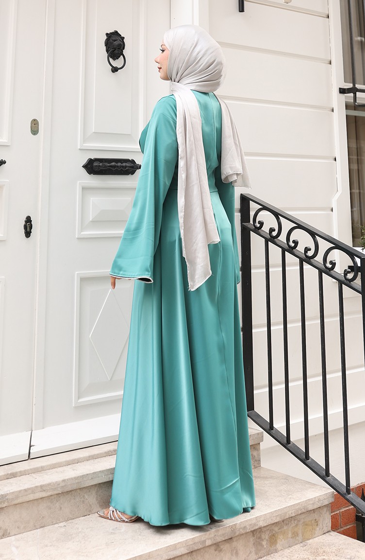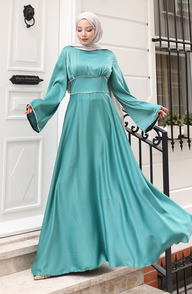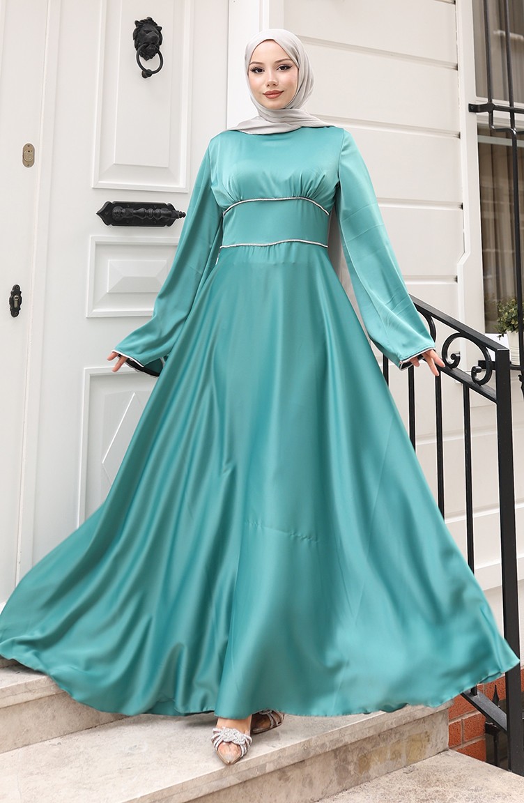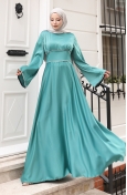 Hijab (tesettür) stilinin en asil abiye parçası: çağla yeşili saten elbise. Islamic clothing (İslami giyim) anlayışına uygun bol kesim (kloş) kalıbı, modest dress (abiye elbise) zarafetini sunar. Lüks saten kumaşı, özel günler için mükemmel bir parlaklık ve döküm sağlar.