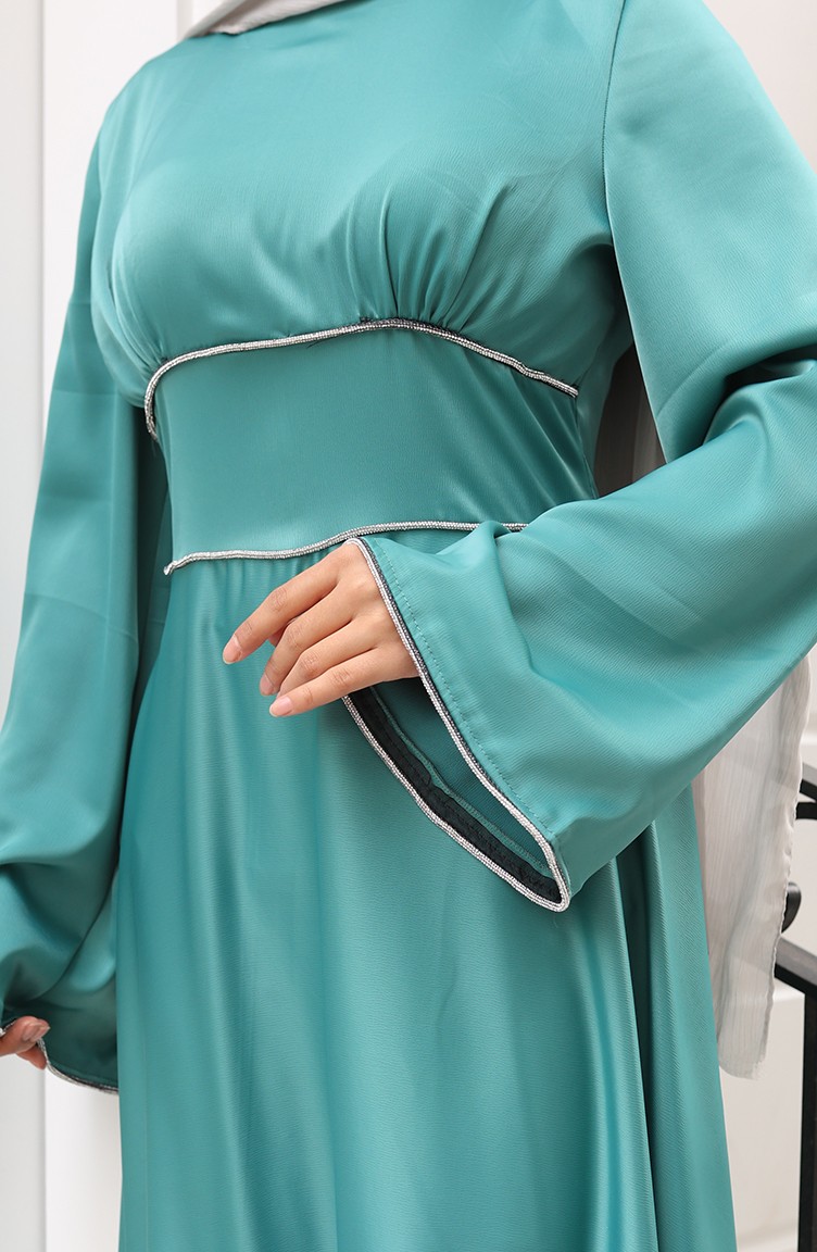 Saten Biye Geçişli Büzgülü Abiye Elbise 5610-04 Çağla Yeşili