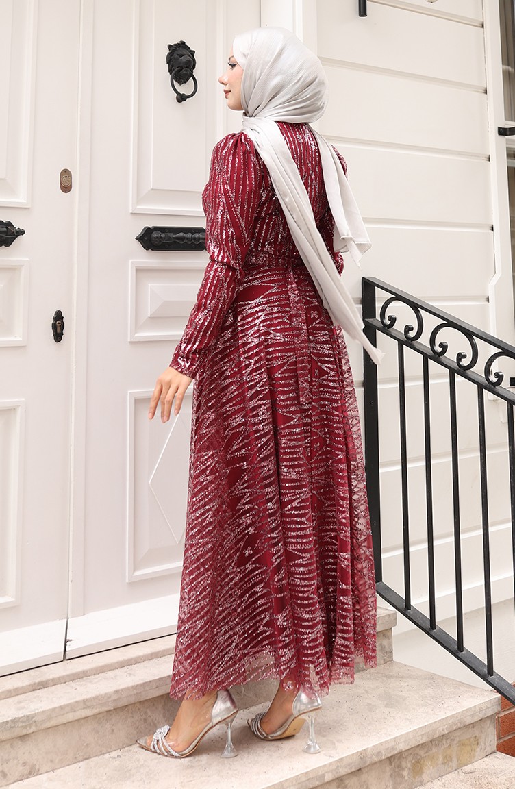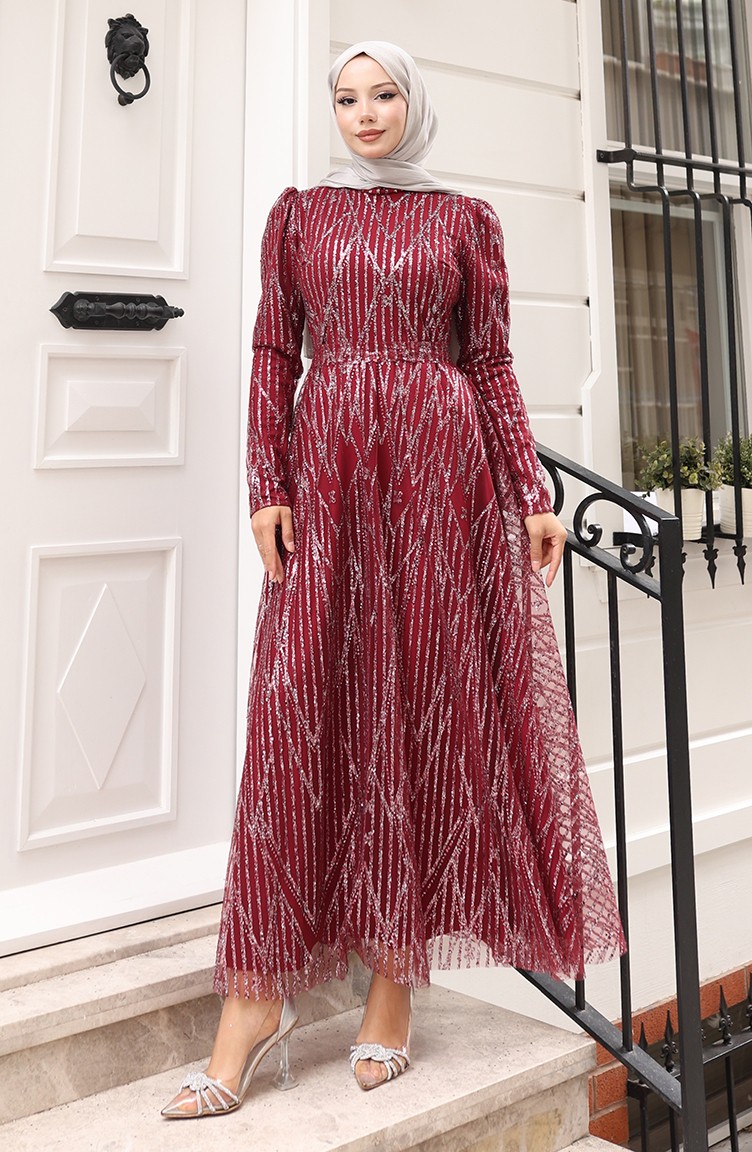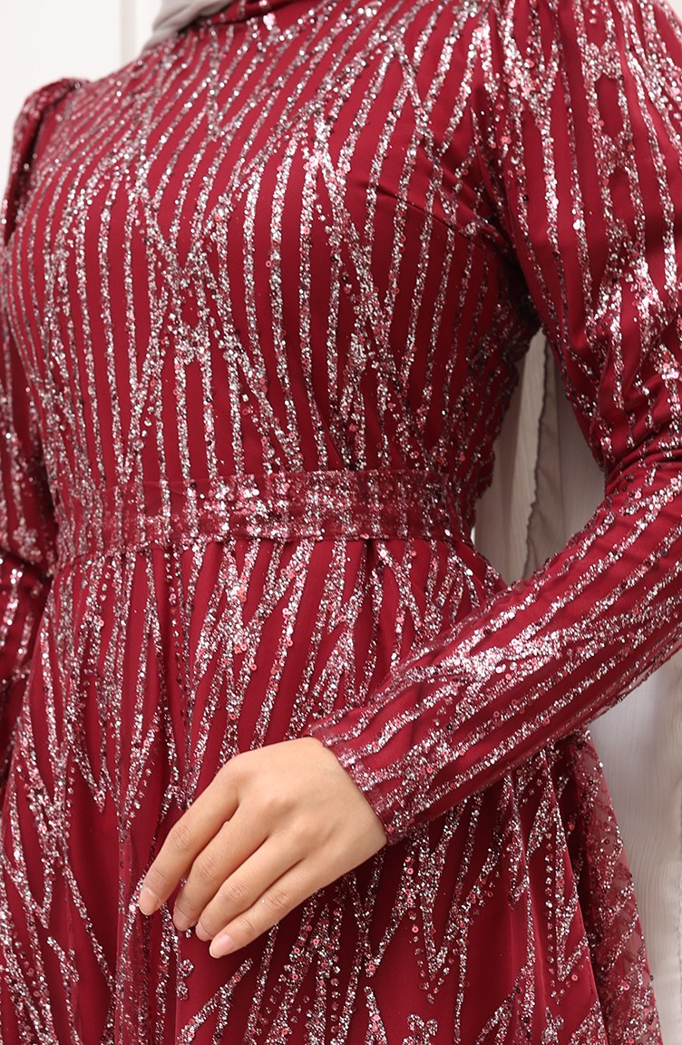 Hijab (tesettür) stilinde özel davetlerin en ışıltılı yıldızı olmaya aday bordo abiye elbise. Islamic clothing (İslami giyim) zarafetini modern bir lüksle birleştiren bu modest dress (abiye elbise), sim kaplama (payetli) dokusuyla tüm gözleri üzerinize çeker.