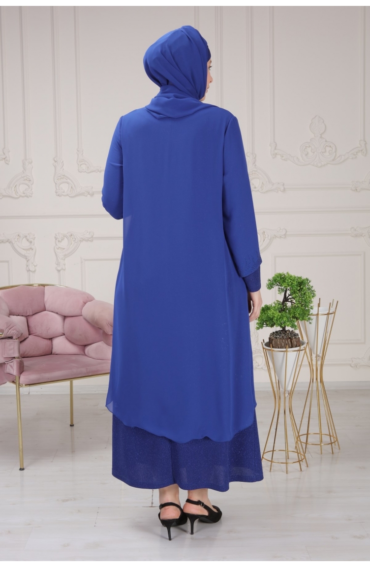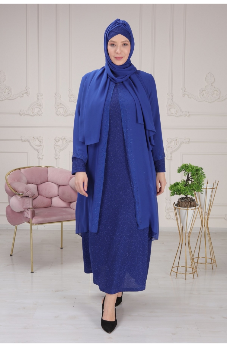 Sim Kumaş Ve Taş İşlemeli Abiye Elbise + Tasarım Şal Hediyeli 3161-03 Saks Mavi