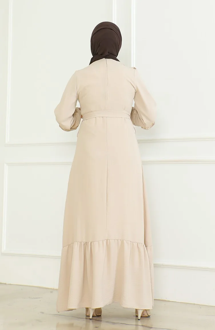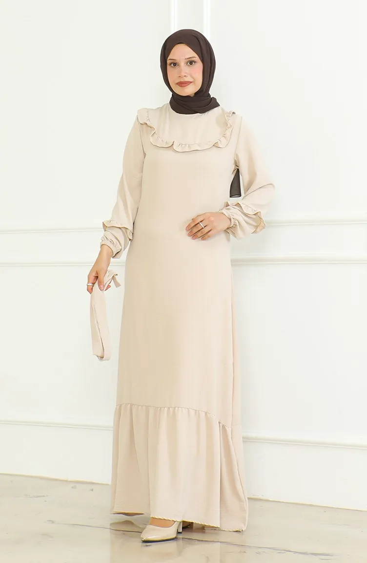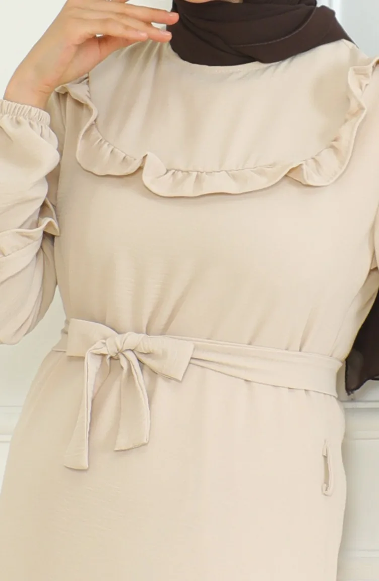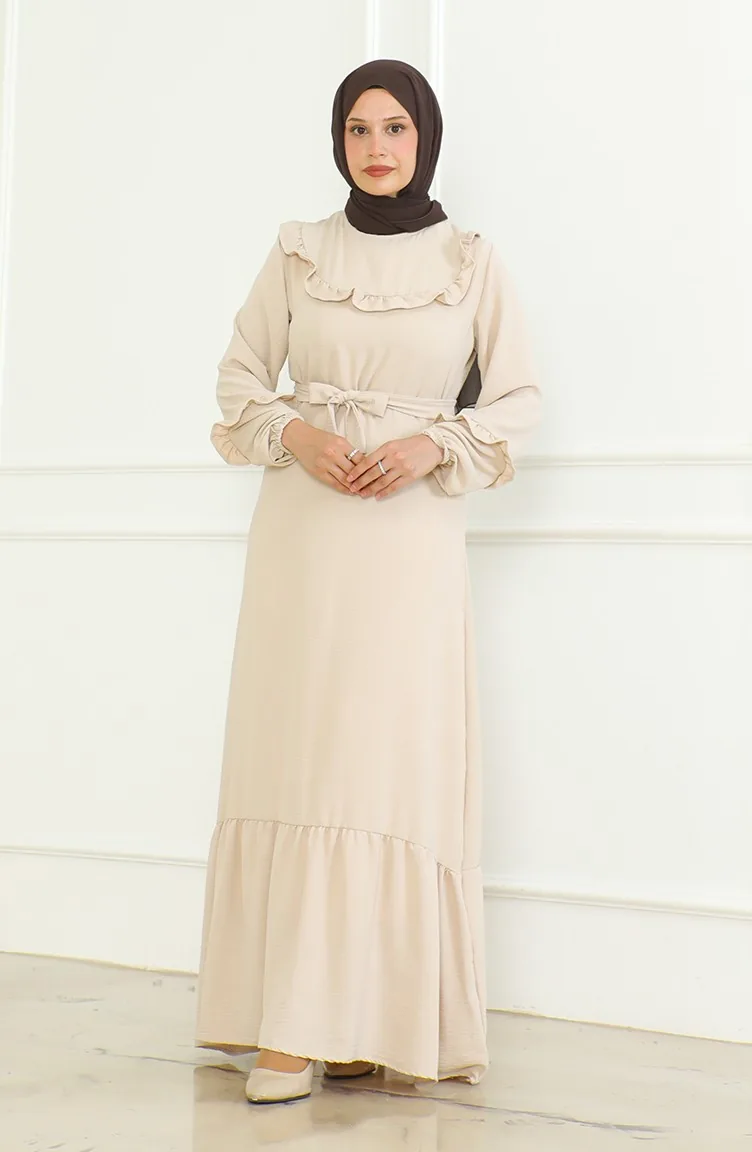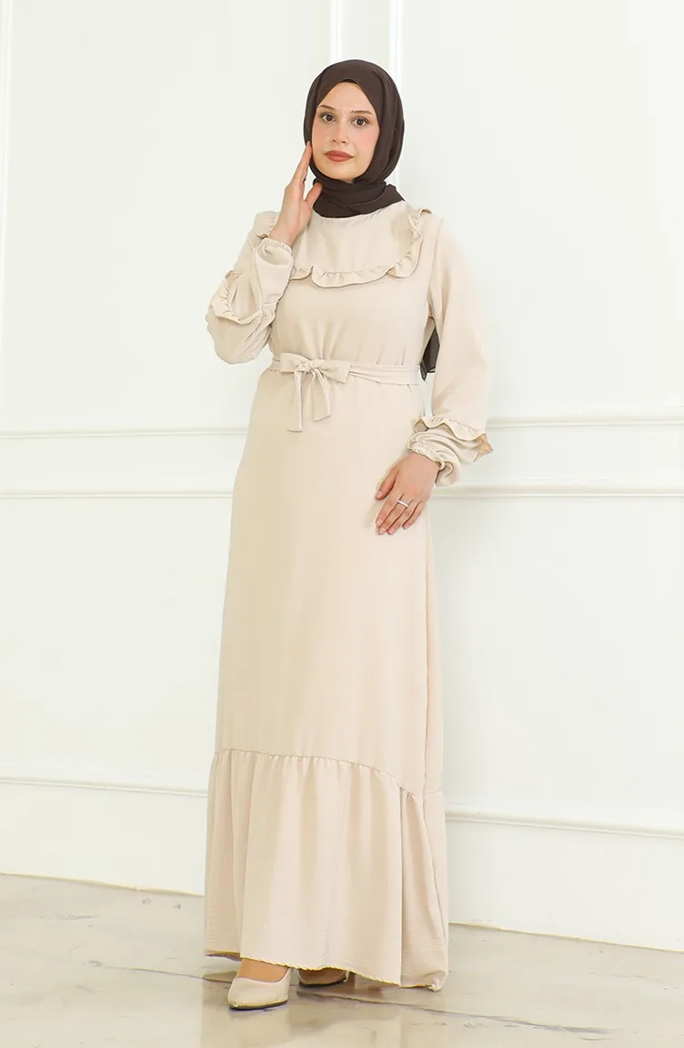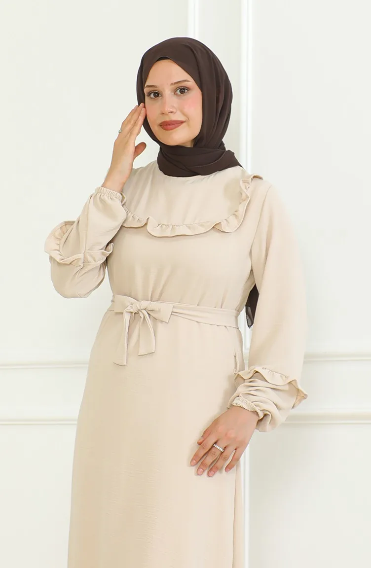 Aerobin Kumaş Fırfırlı Kuşaklı Elbise 0478-03 Bej