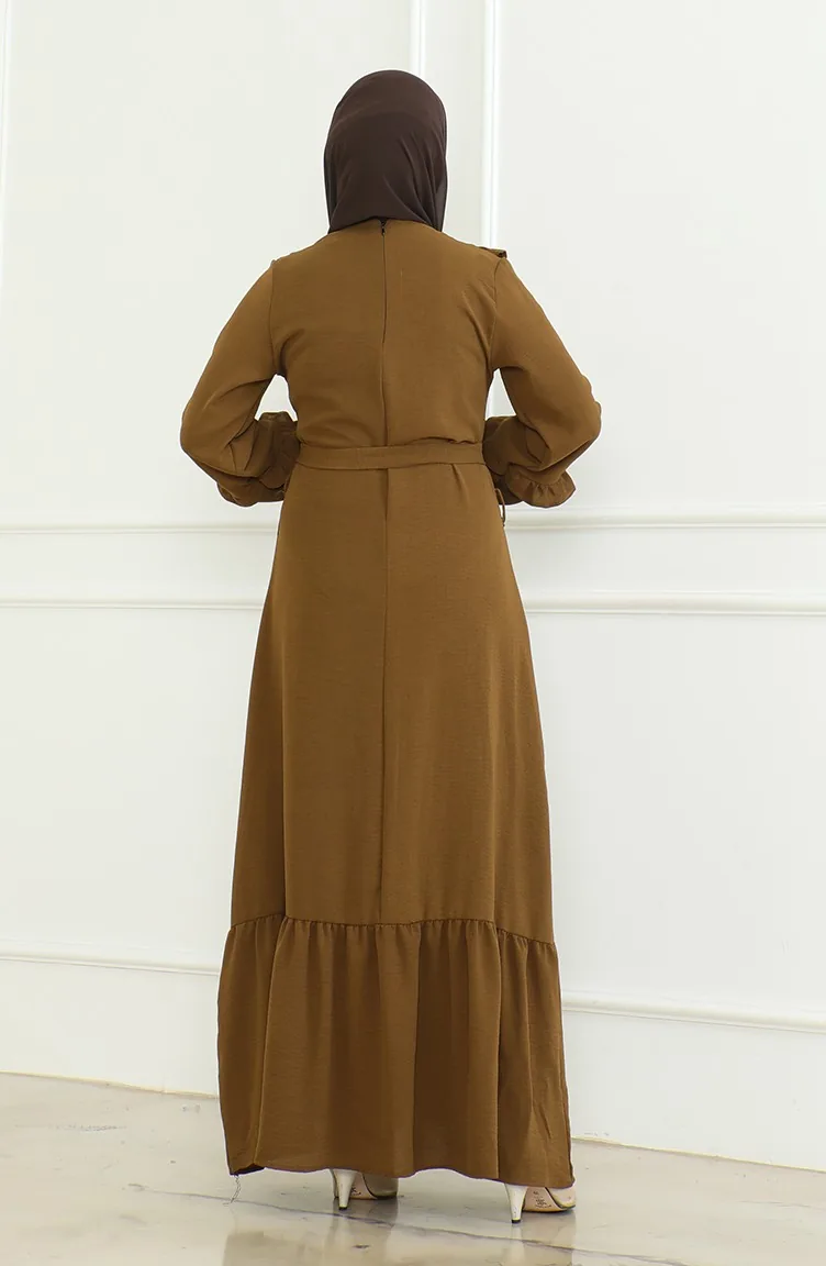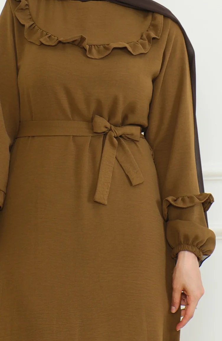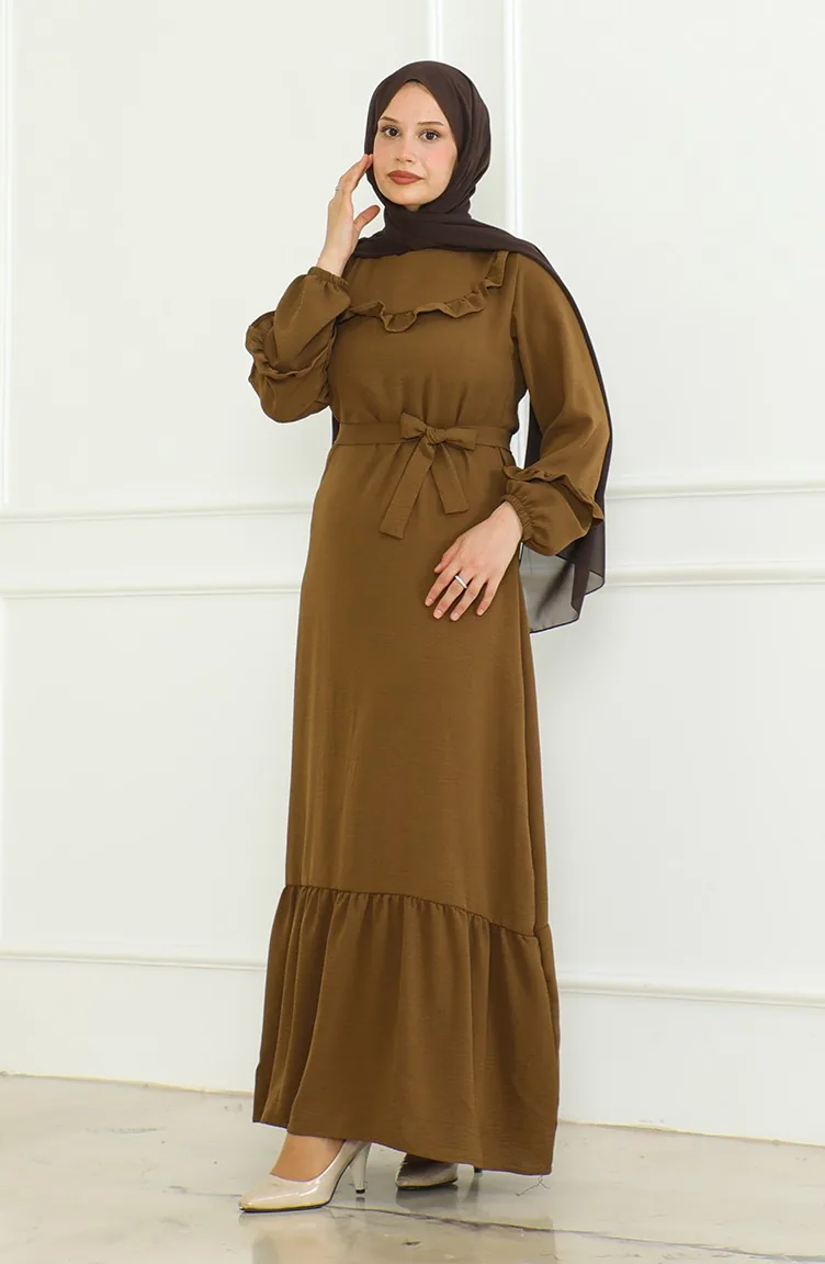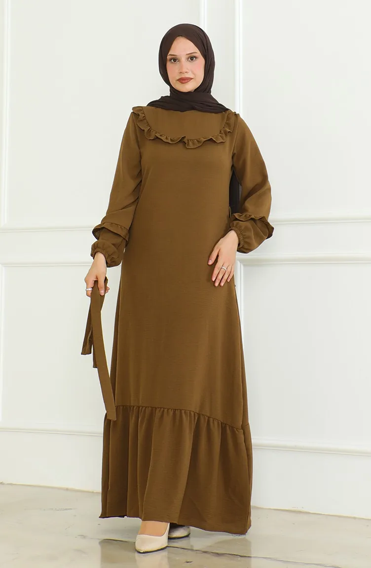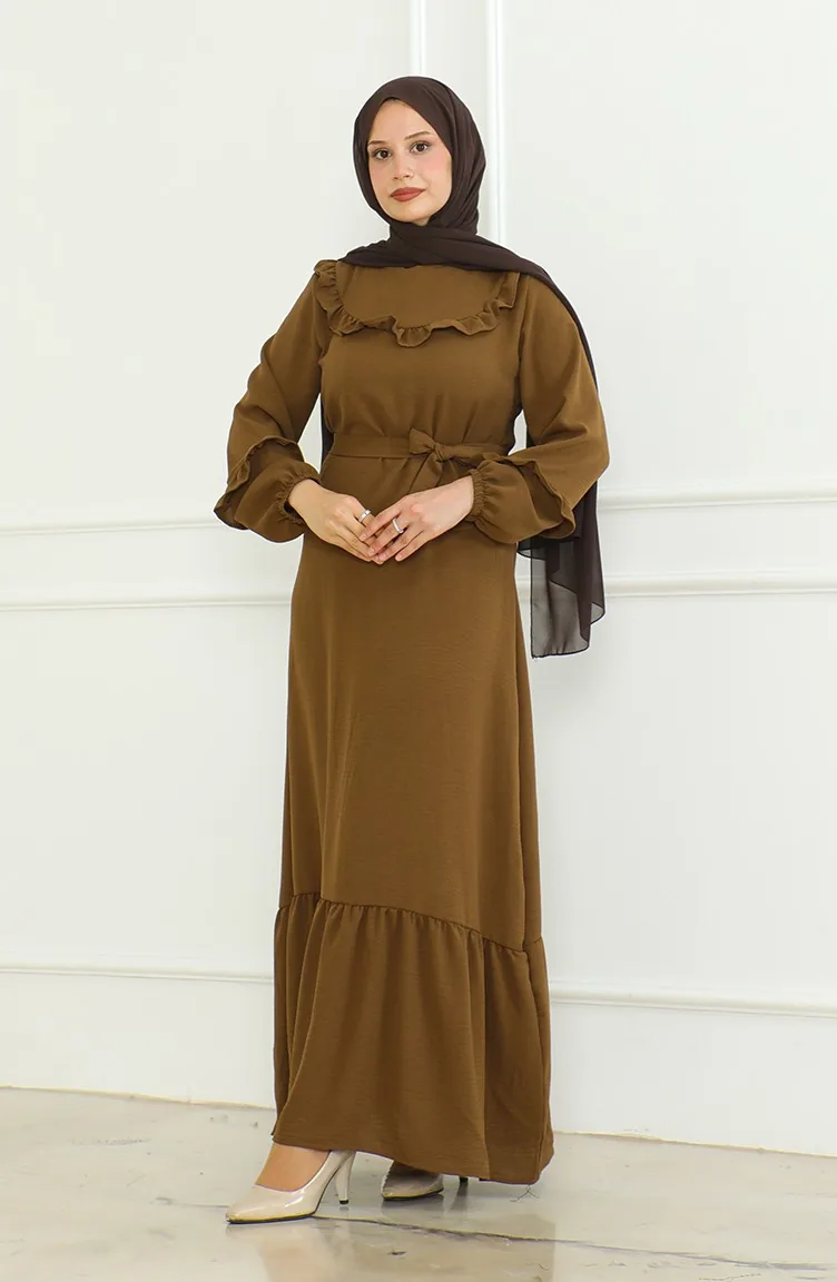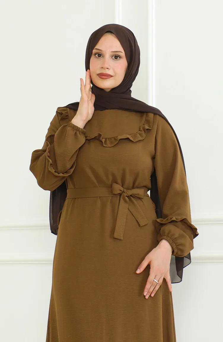 Aerobin Kumaş Fırfırlı Kuşaklı Elbise 0478-05 Kahverengi