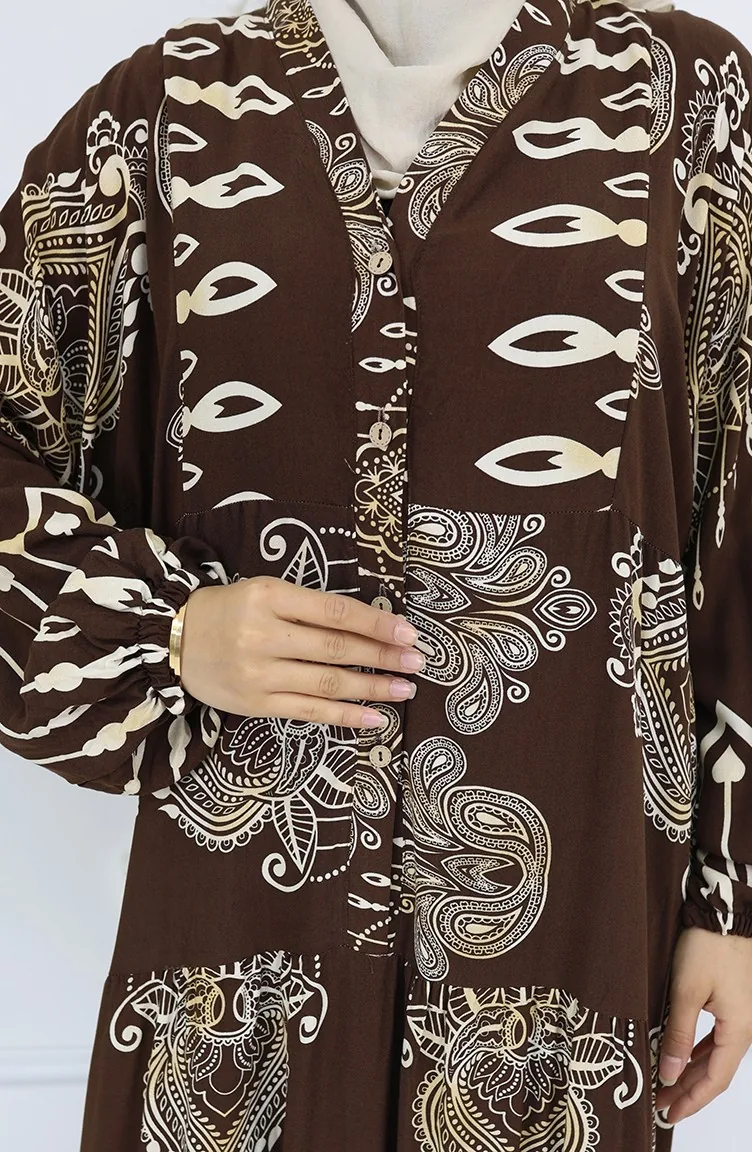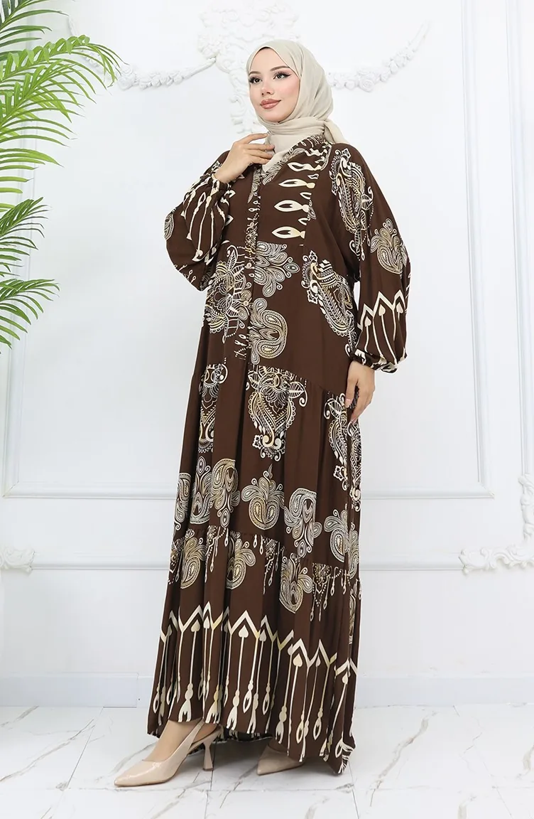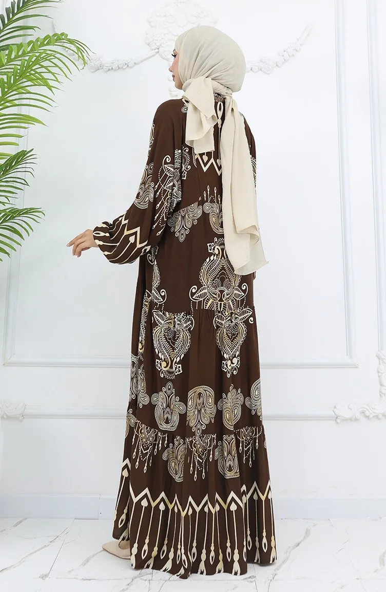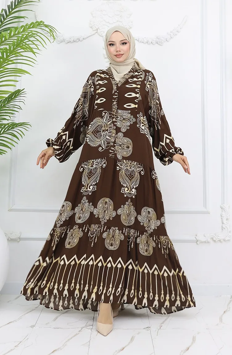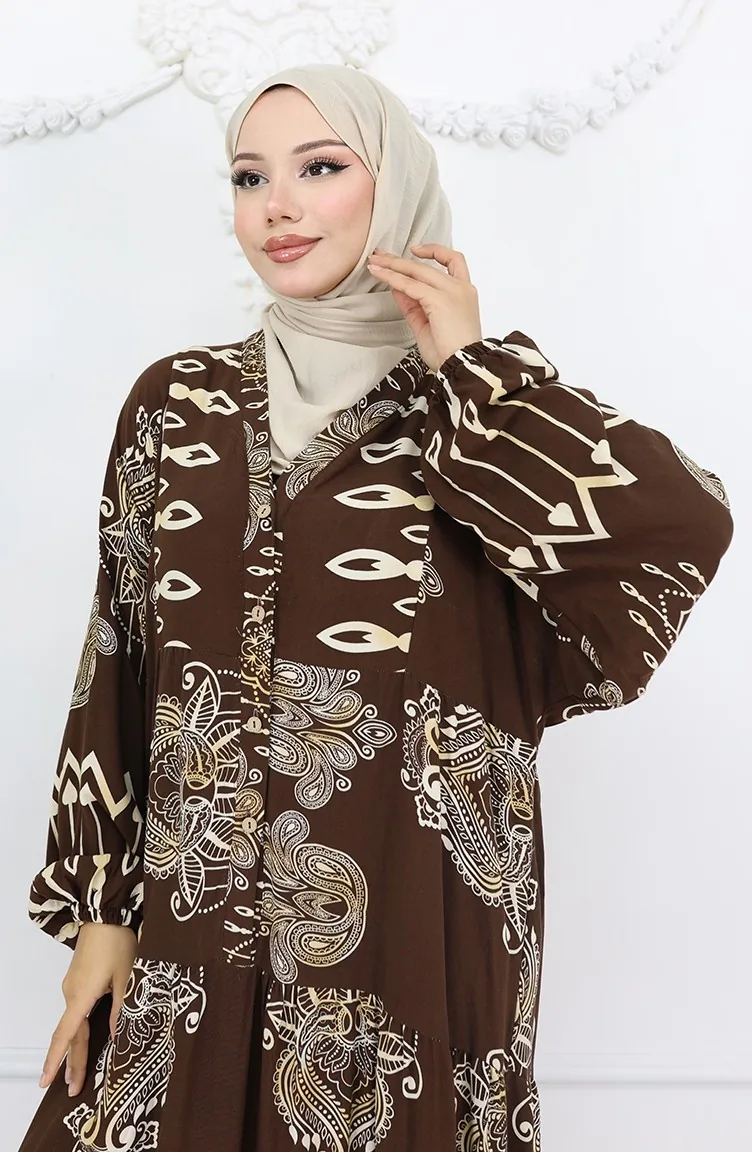 Alaçatı Desenli Yarım Düğmeli Viskon Elbise 0040-04 Kahverengi
