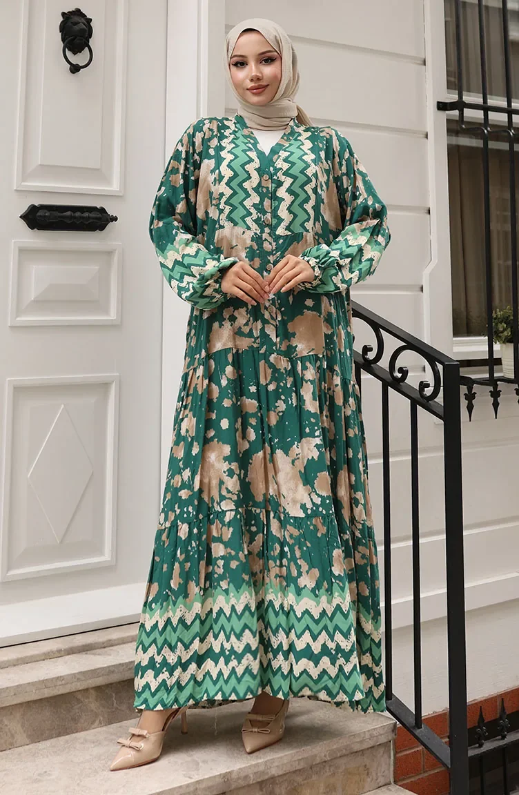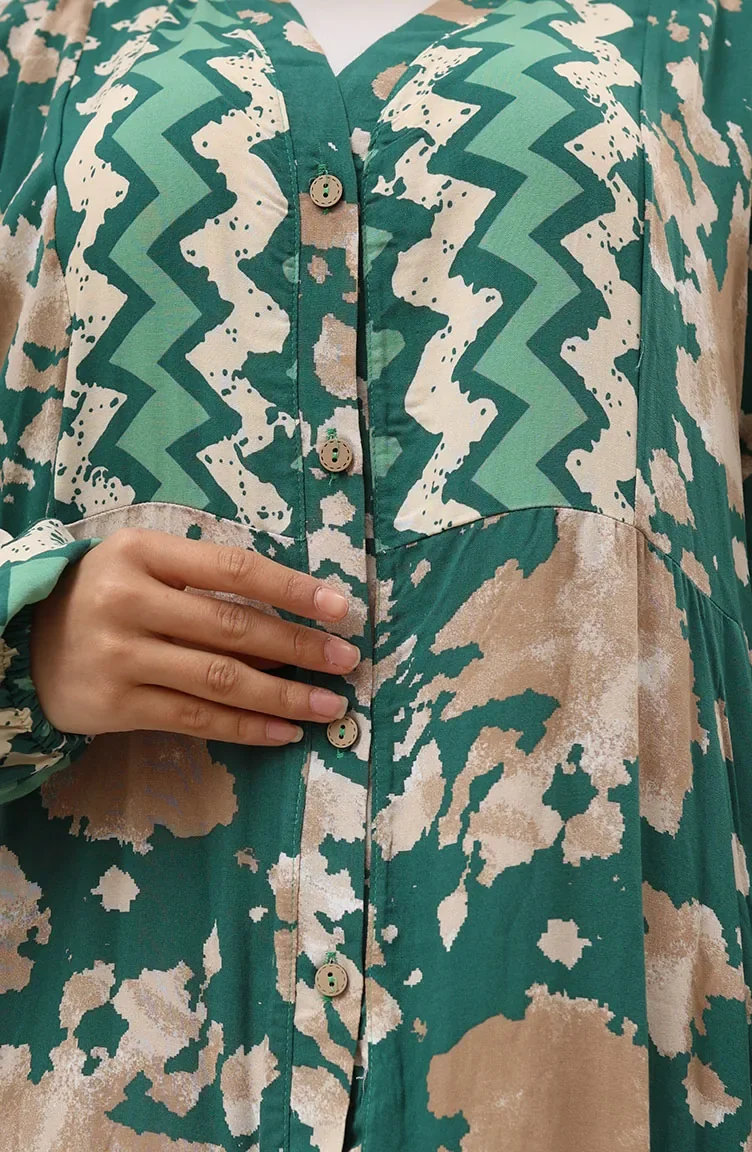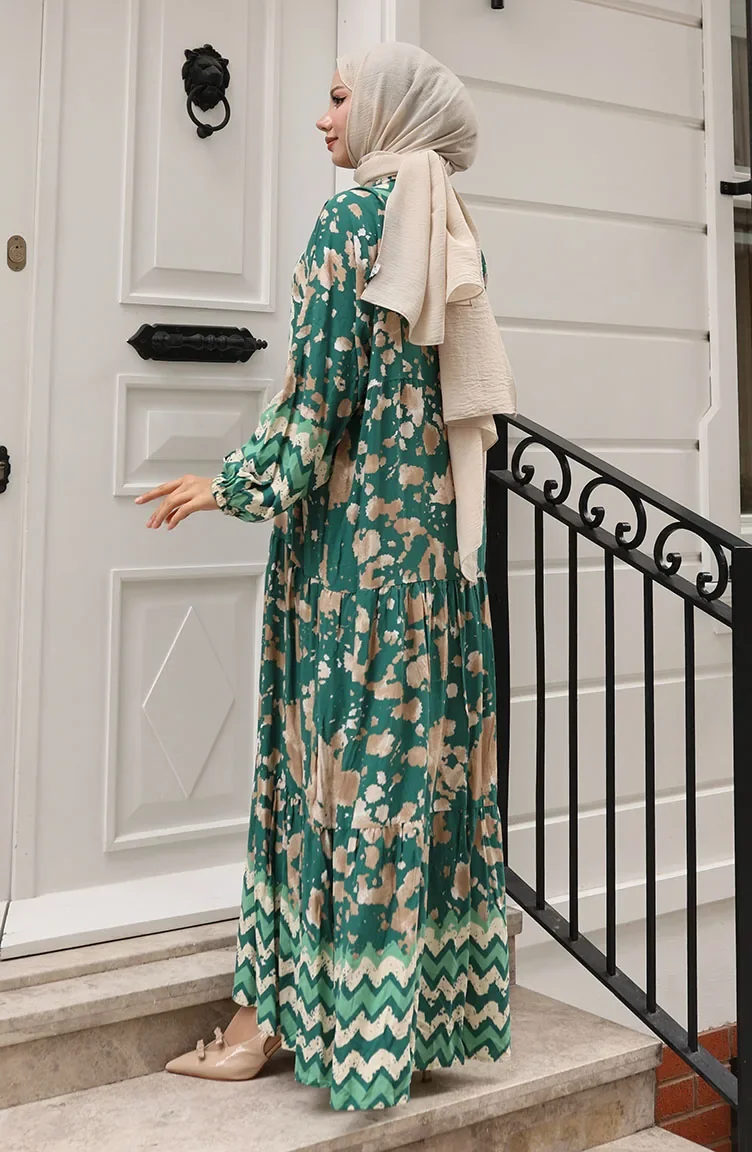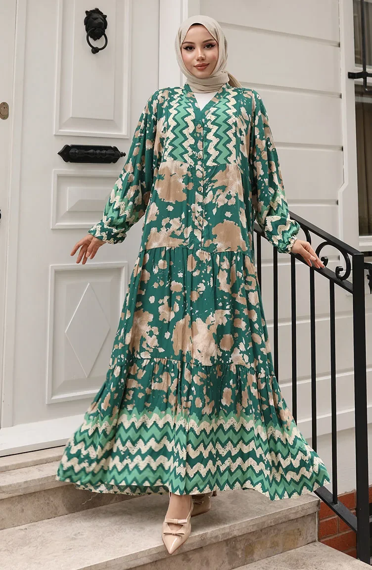Alaçatı Desenli Yarım Düğmeli Viskon Elbise 0041-01 Yeşil