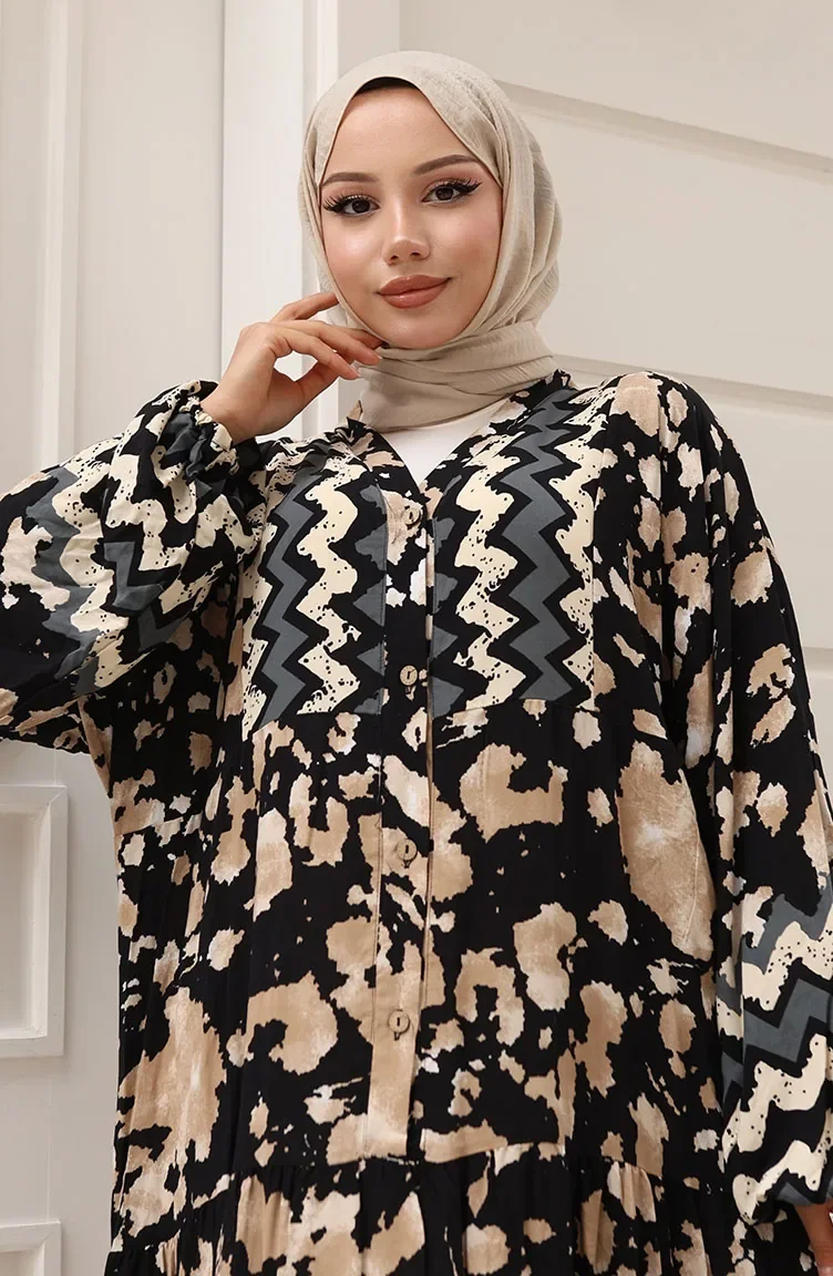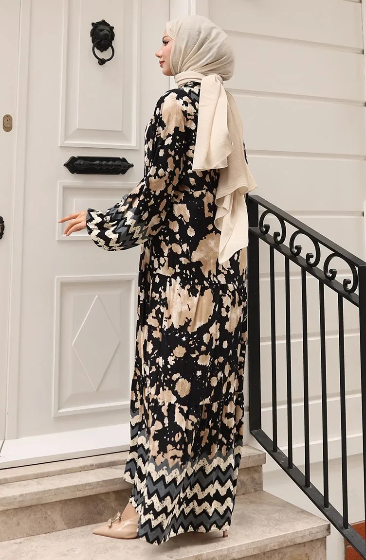 Alaçatı Desenli Yarım Düğmeli Viskon Elbise 0041-03 Siyah
