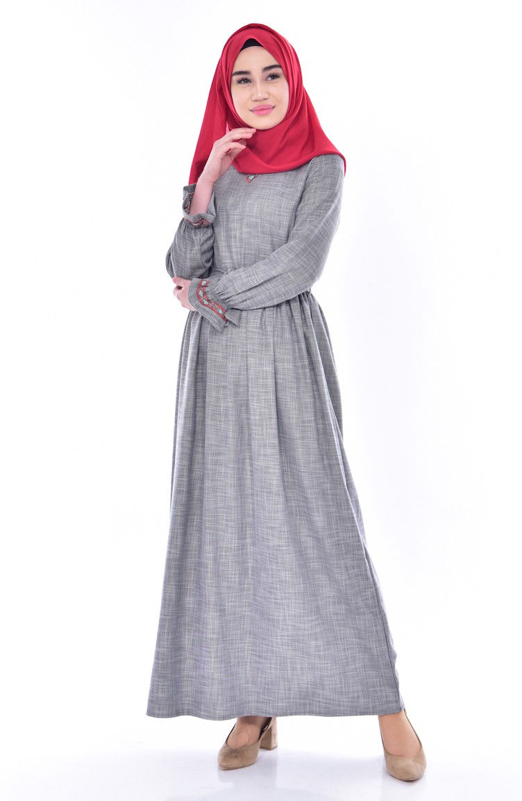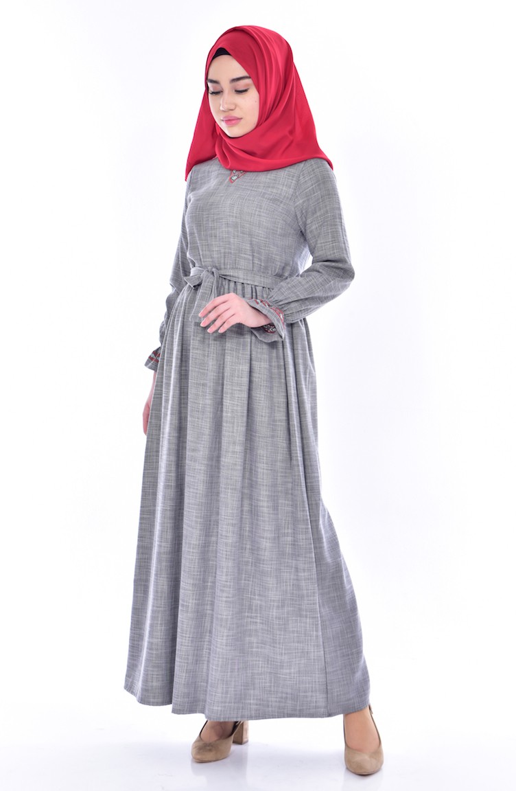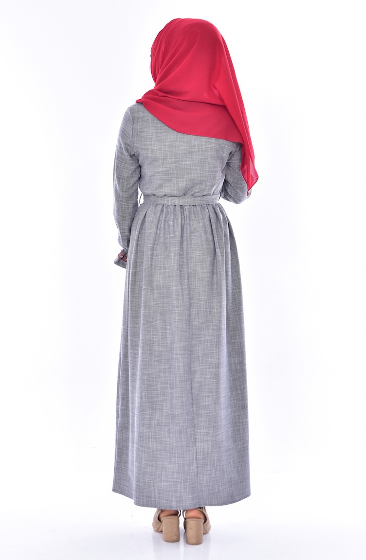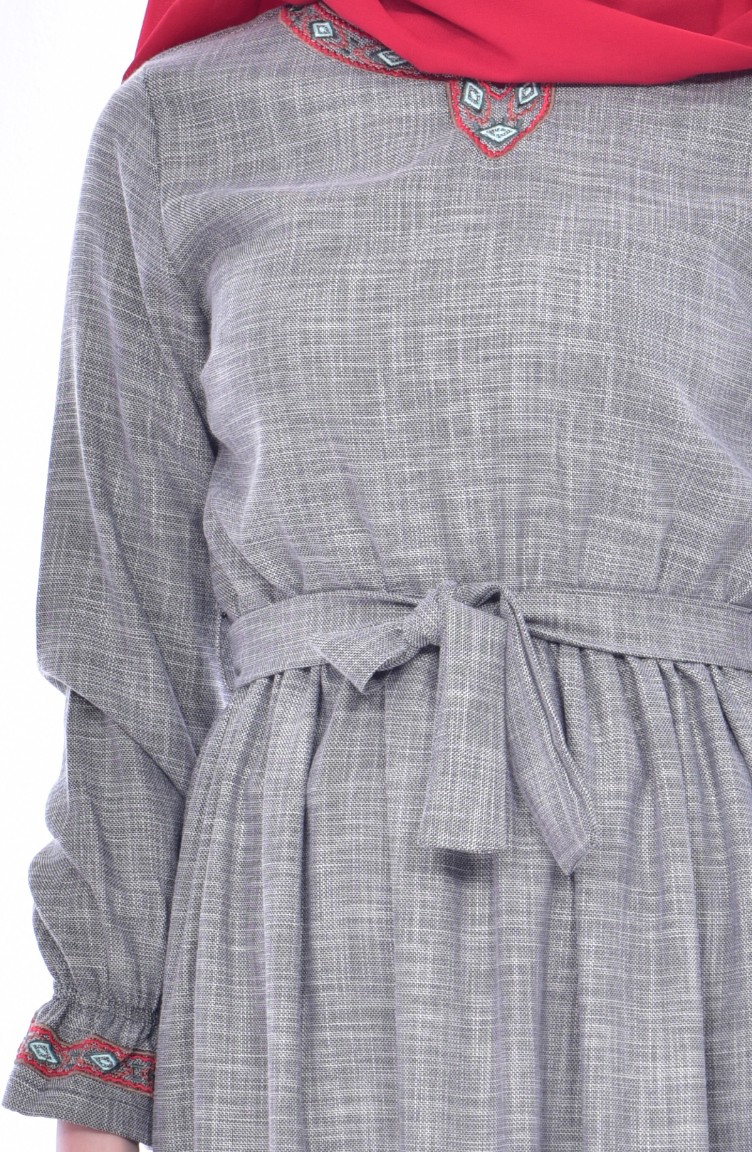 Belden Büzgülü Nakışlı Elbise 1152-04 Gri