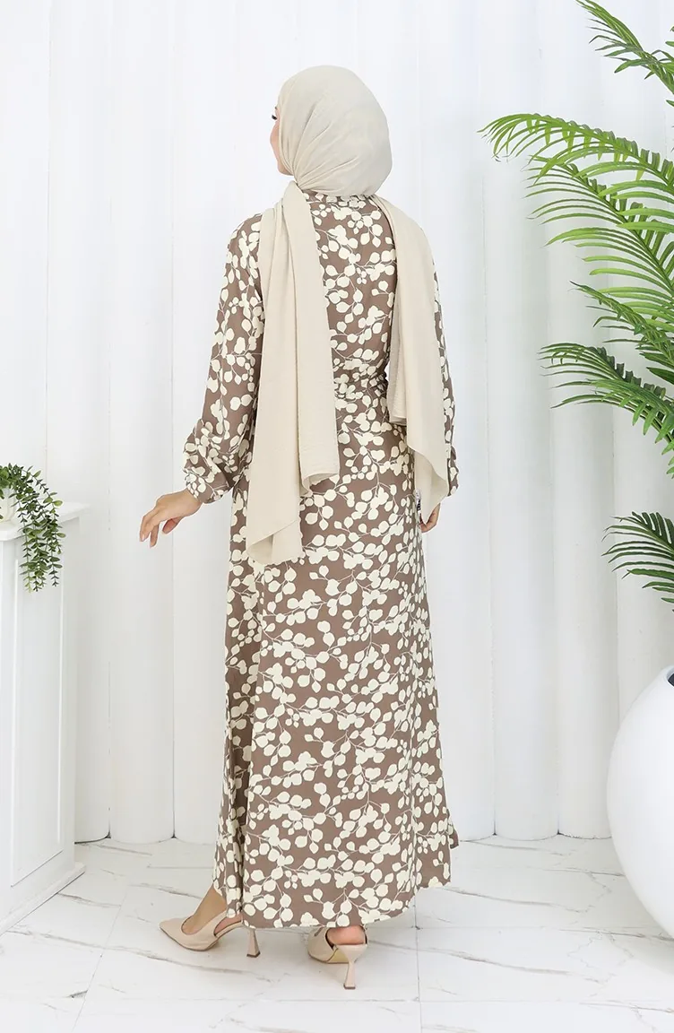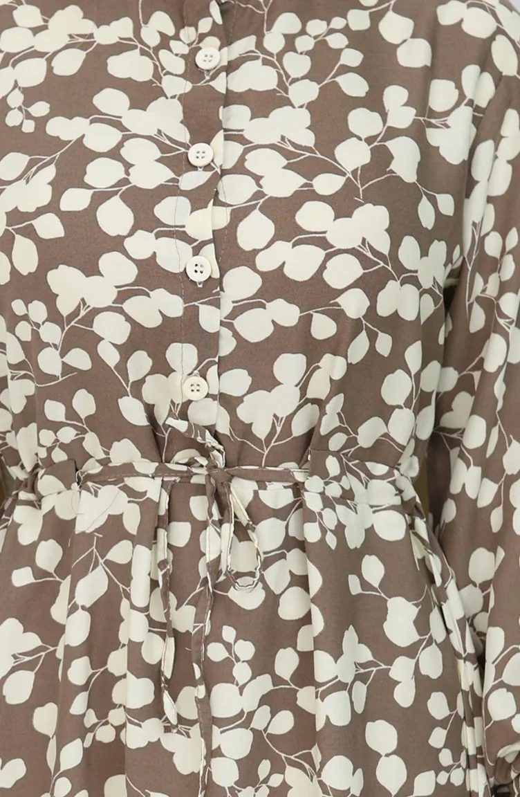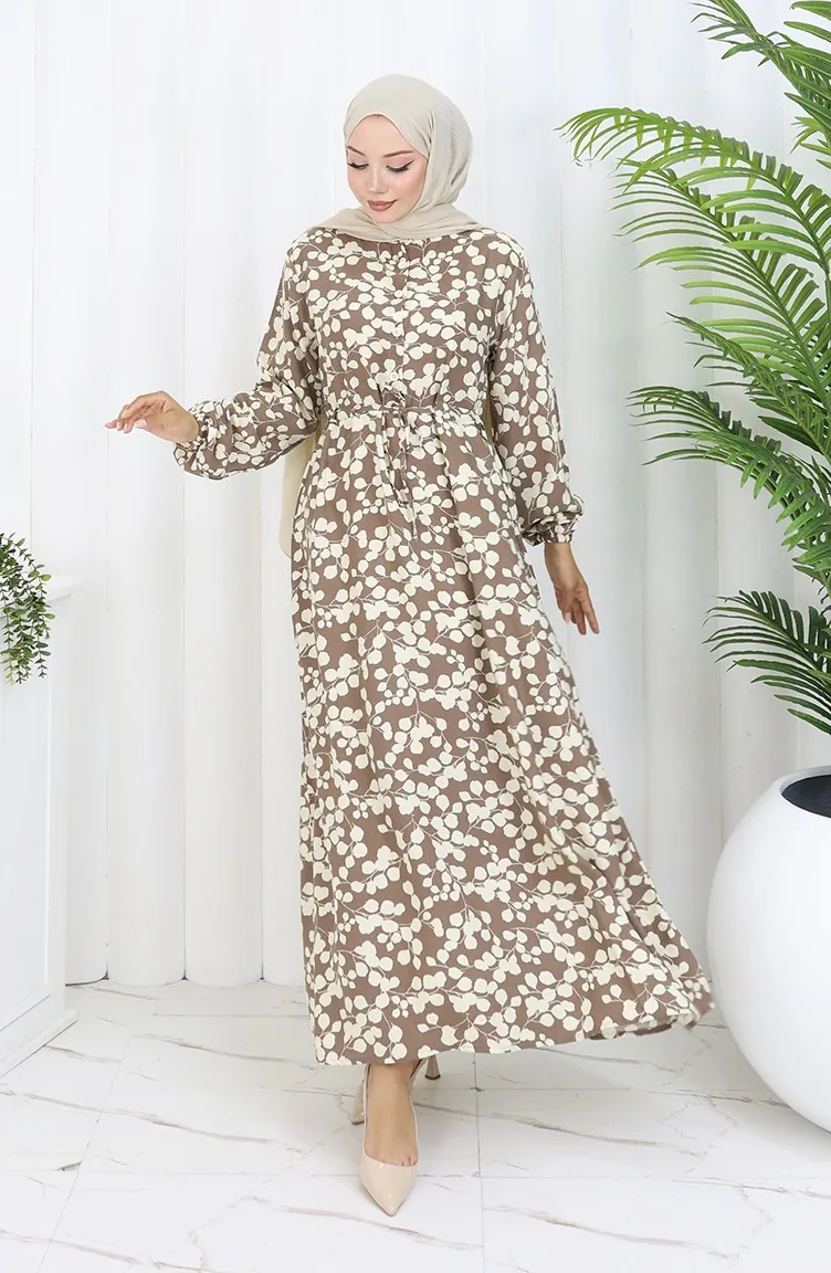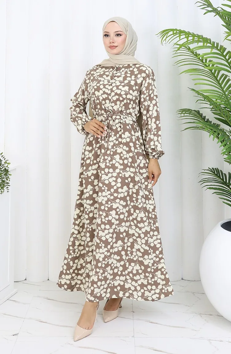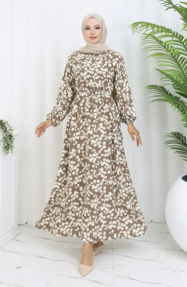 Beli Bağcıklı Desenli Viskon Elbise 2083-03 Vizon
