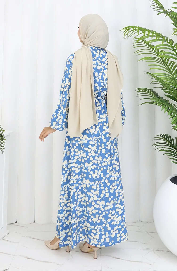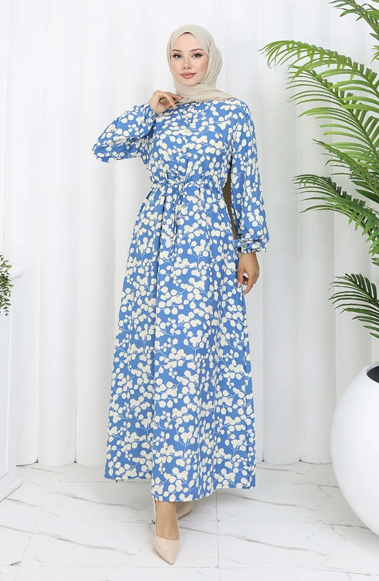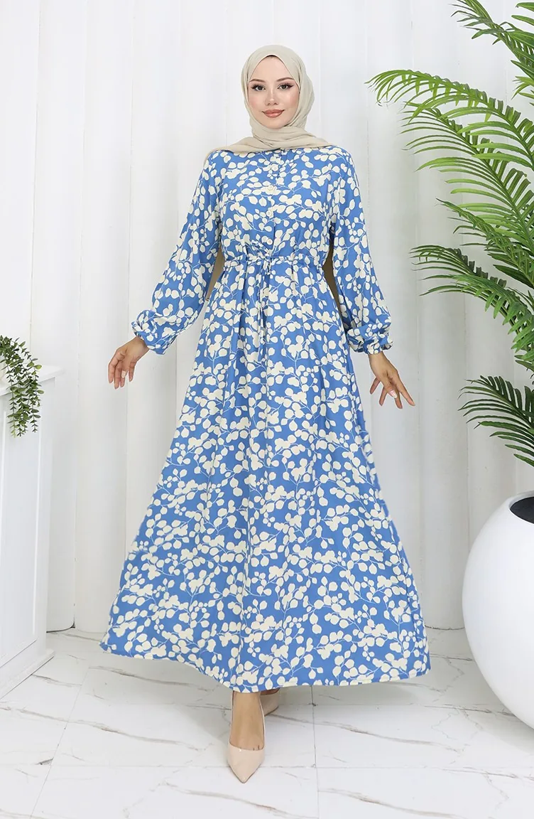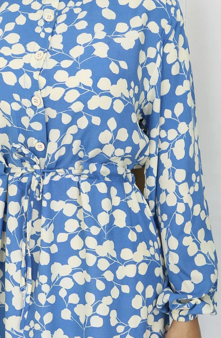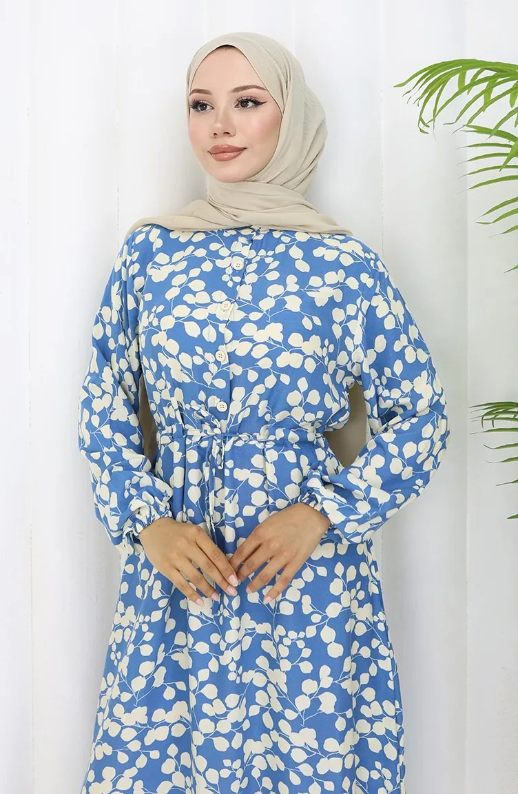 Beli Bağcıklı Desenli Viskon Elbise 2083-04 İndigo
