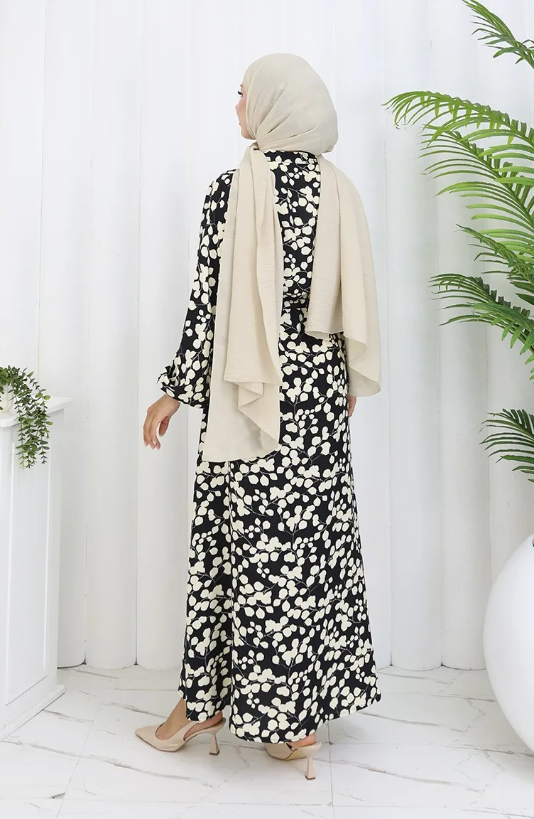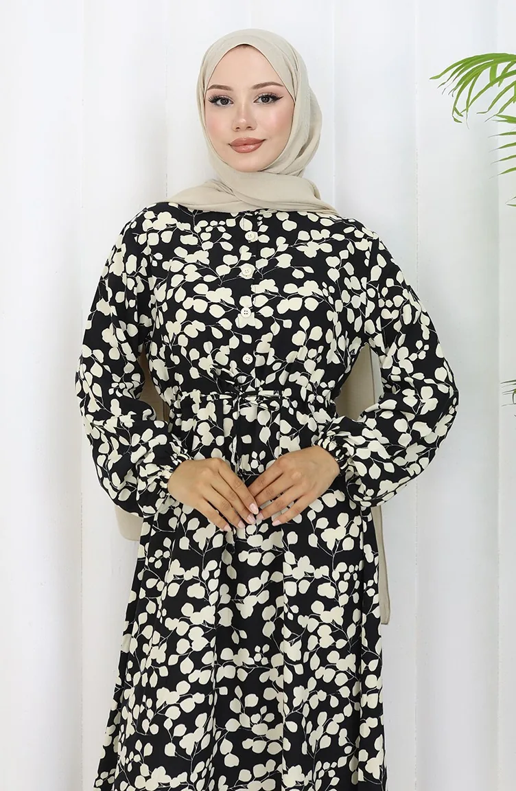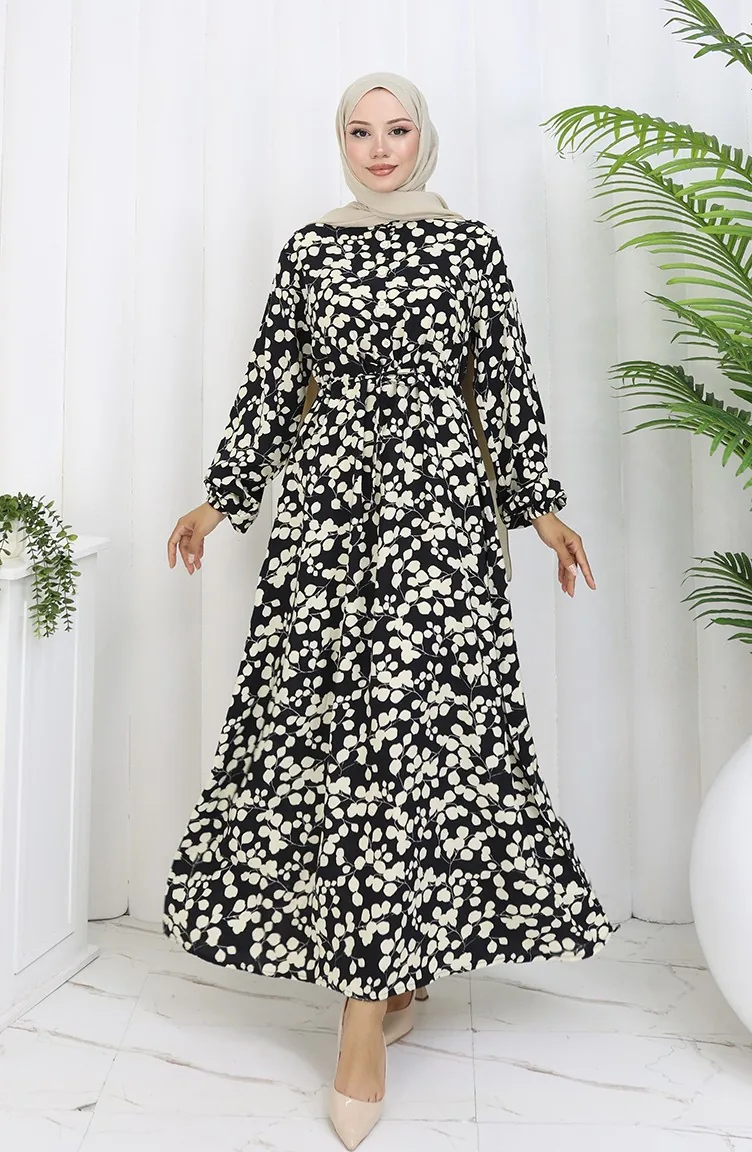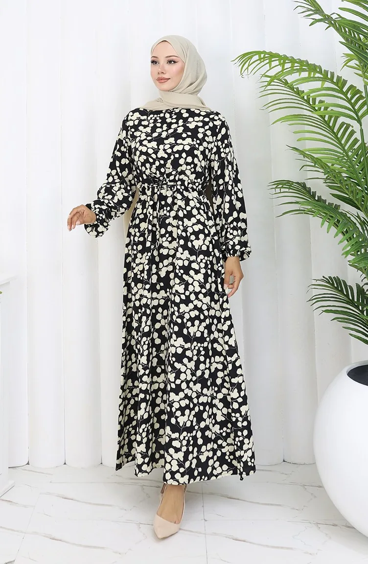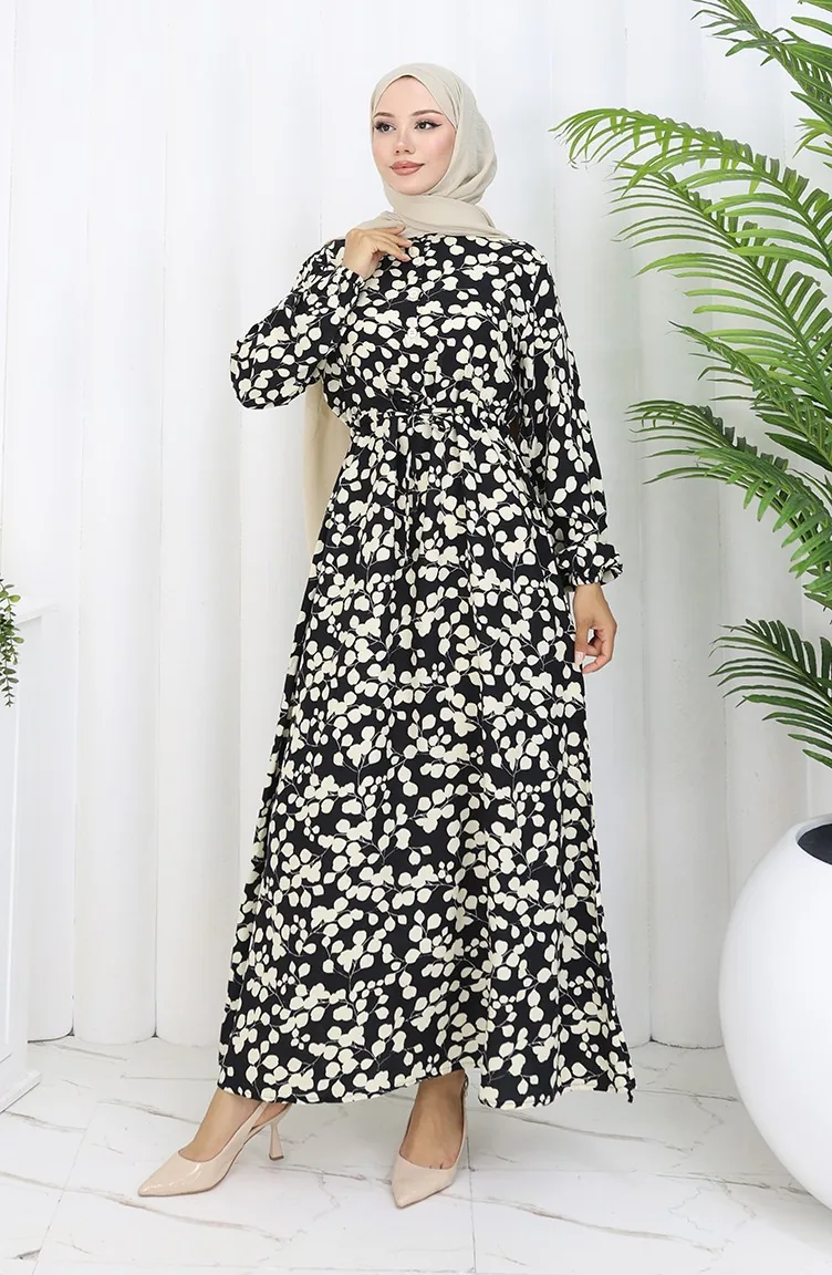 Beli Bağcıklı Desenli Viskon Elbise 2083-05 Siyah