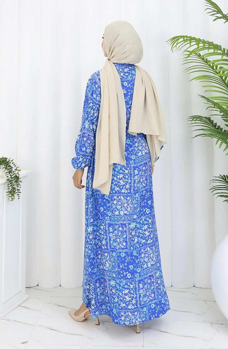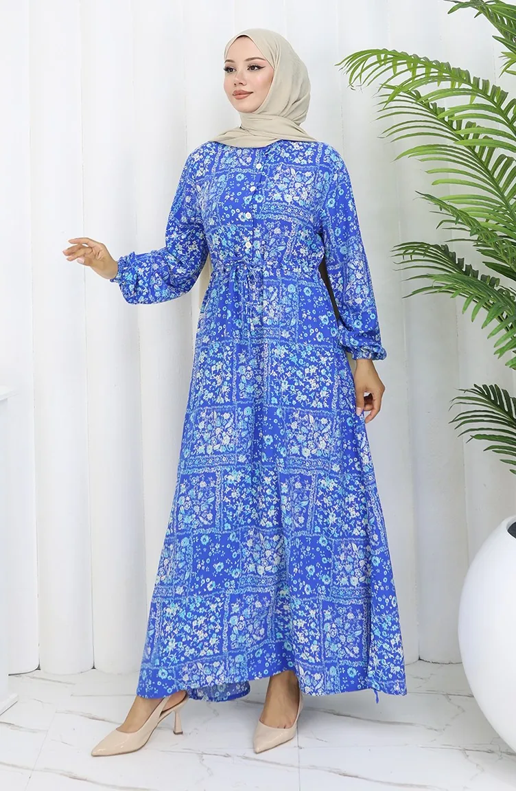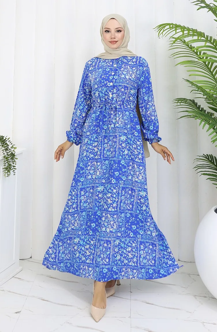 Beli Bağcıklı Desenli Viskon Elbise 2084-02 İndigo