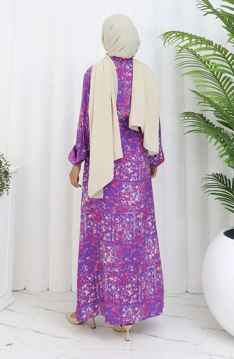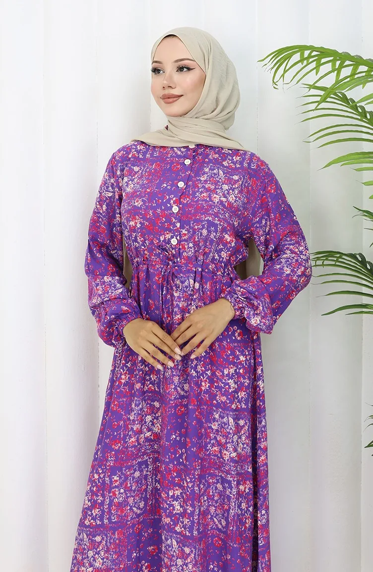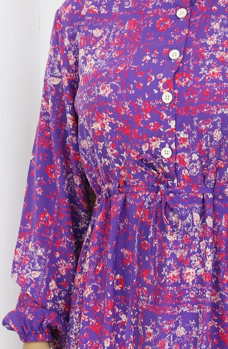 Beli Bağcıklı Desenli Viskon Elbise 2084-03 Lila