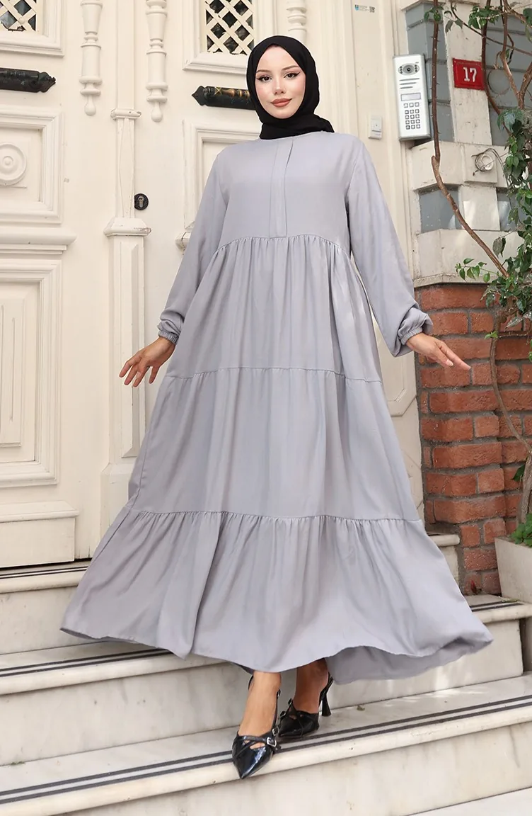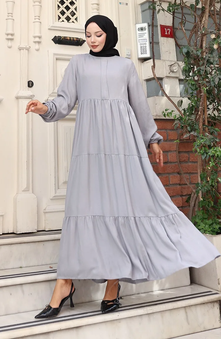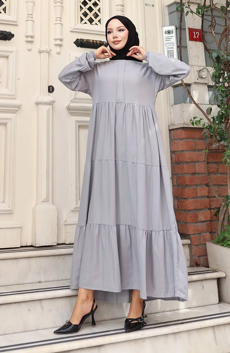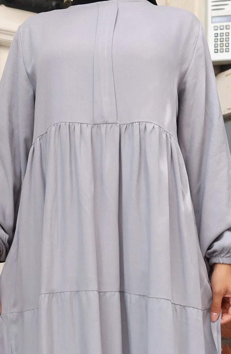 Beli Büzgülü Kolu Lastikli Elbise 2149-01 Gri