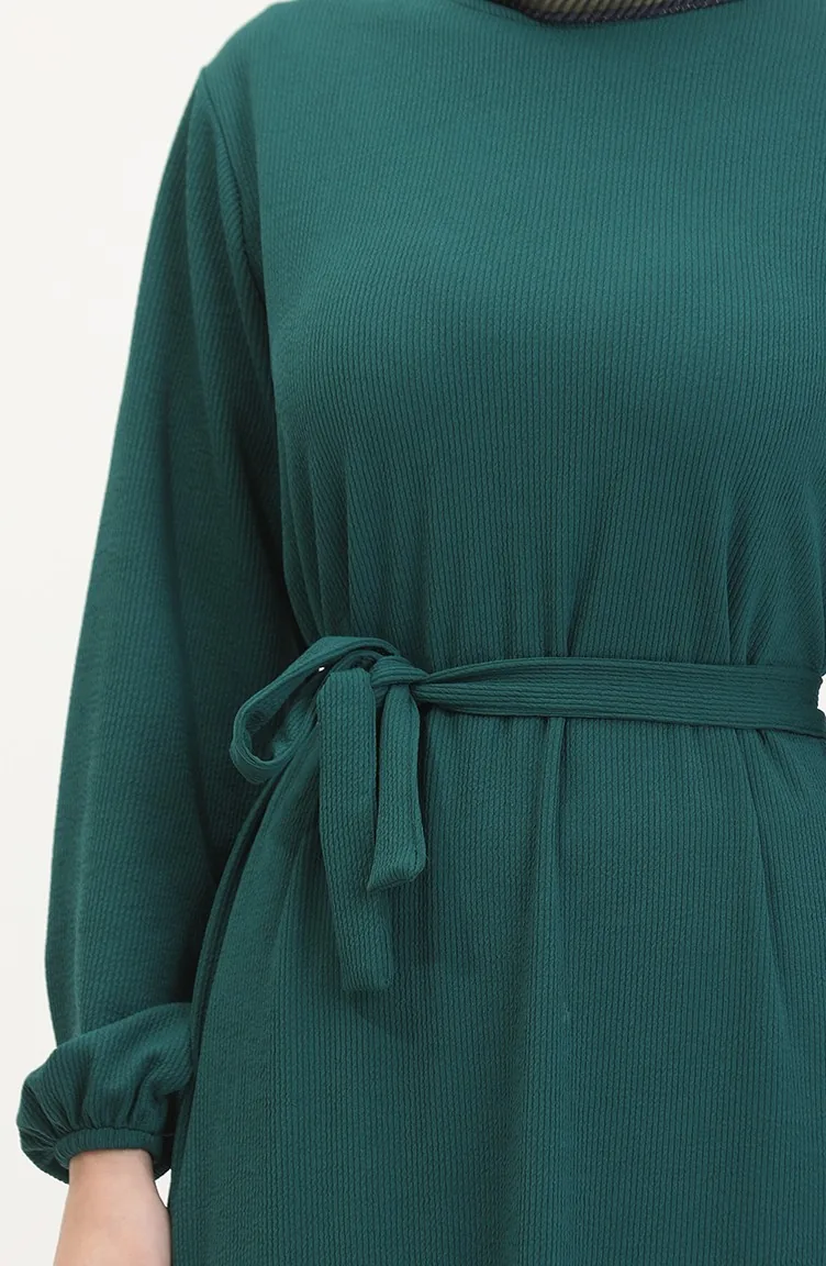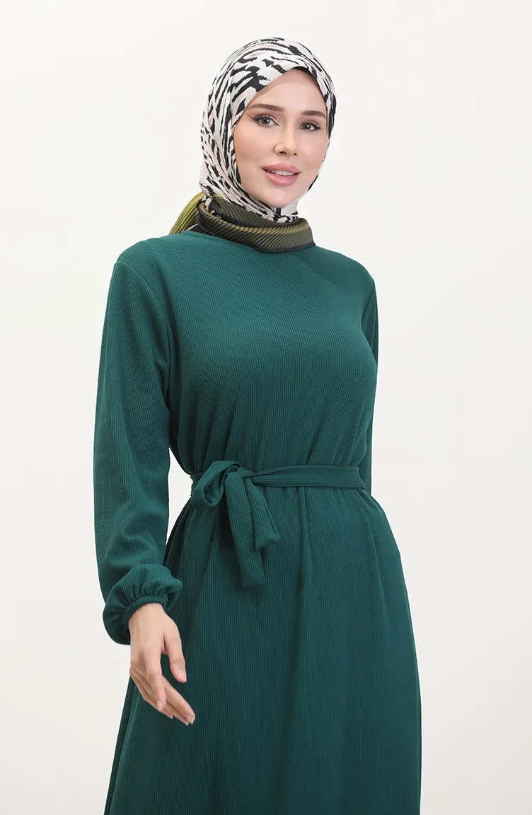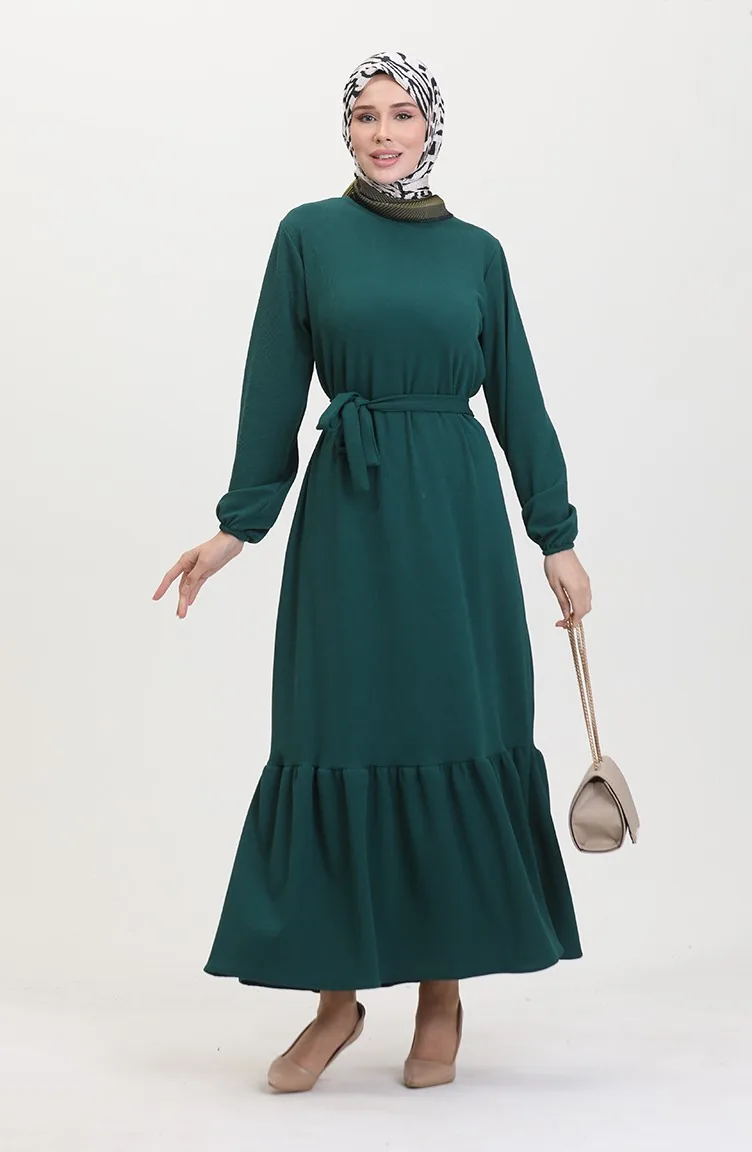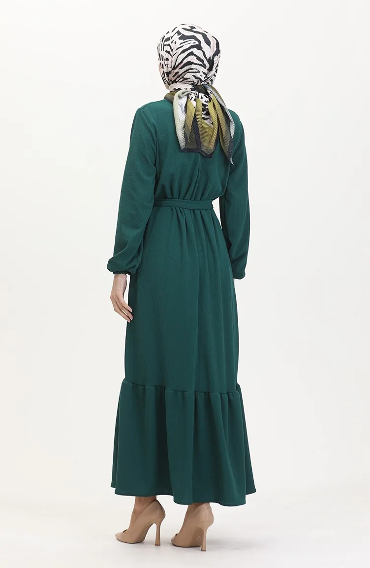 Burgu Kumaş Fitilli Fırfırlı Elbise 0528-05 Zümrüt Yeşili