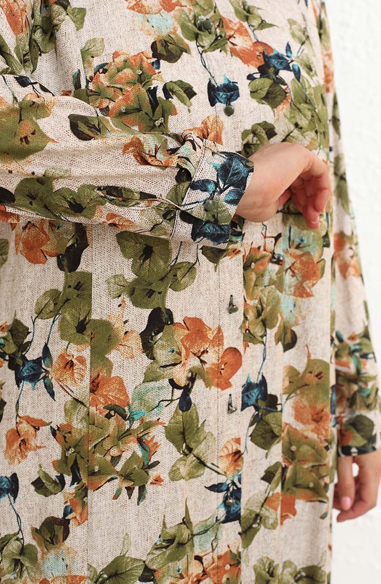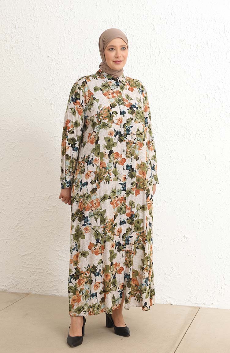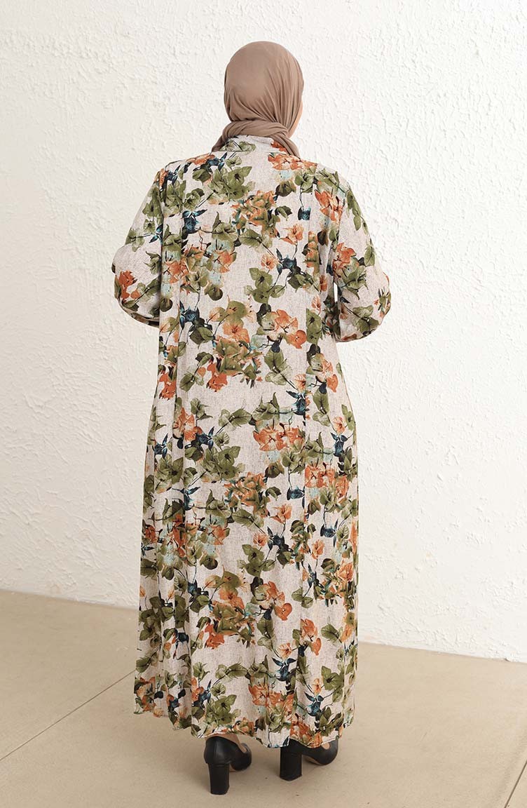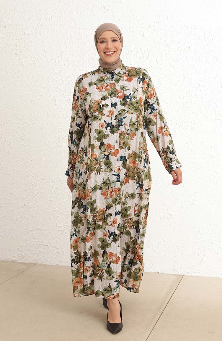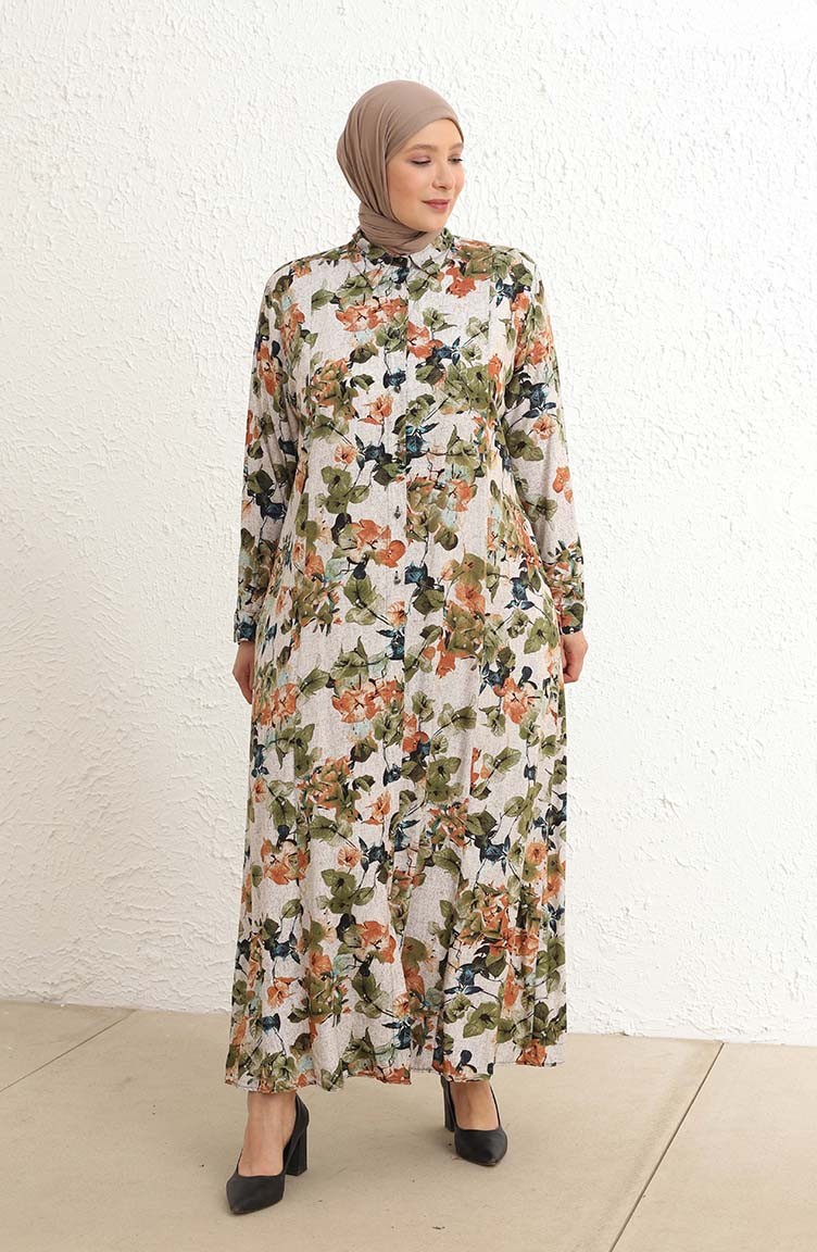 Büyük Beden Çiçek Desenli Viskon Elbise 4479B-01 Haki