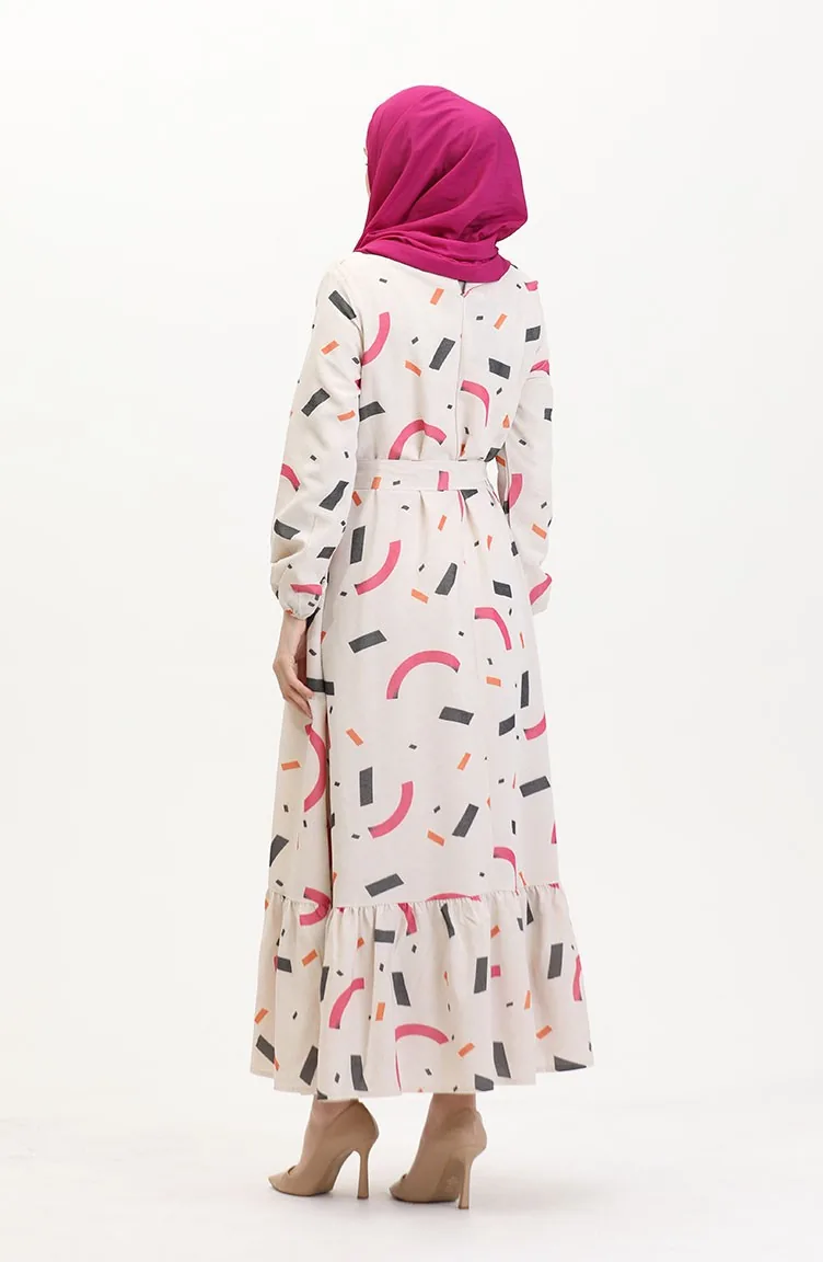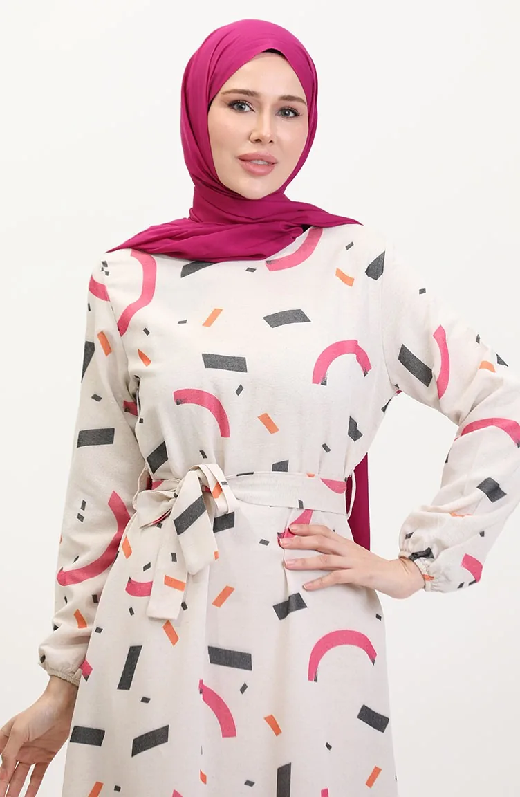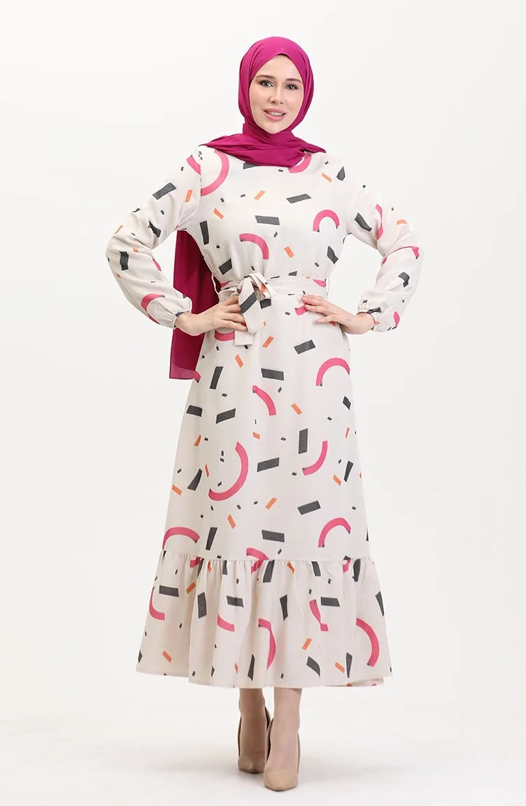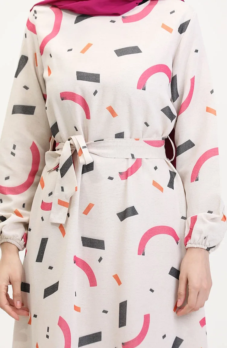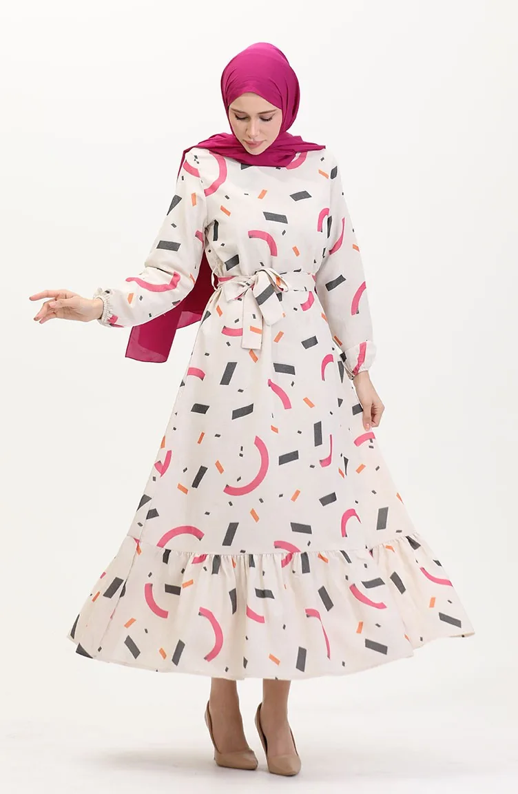 Büyük Beden Desenli Keten Elbise 91817-02 Krem Fuşya