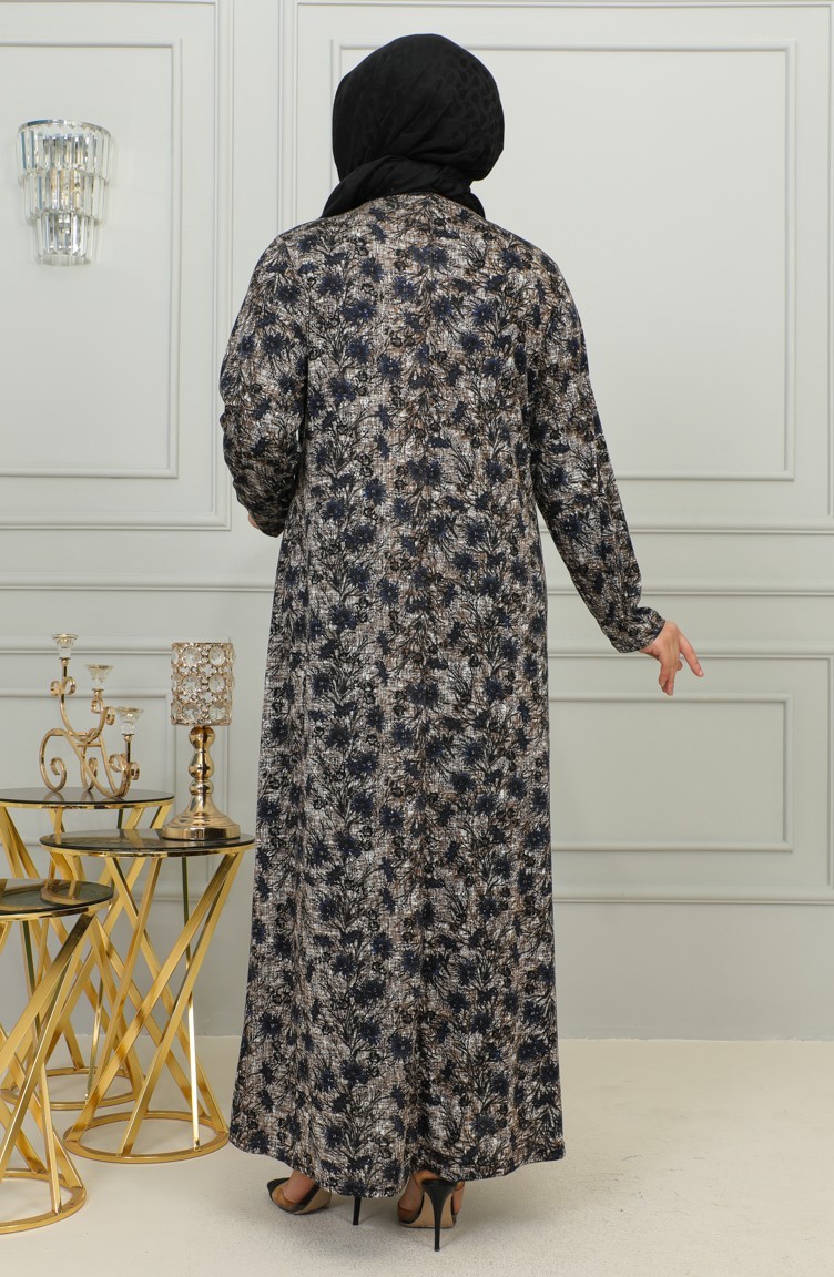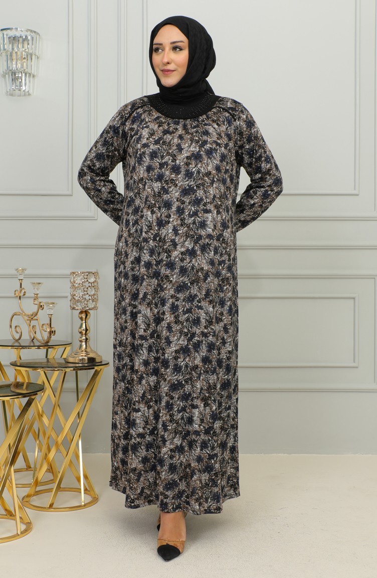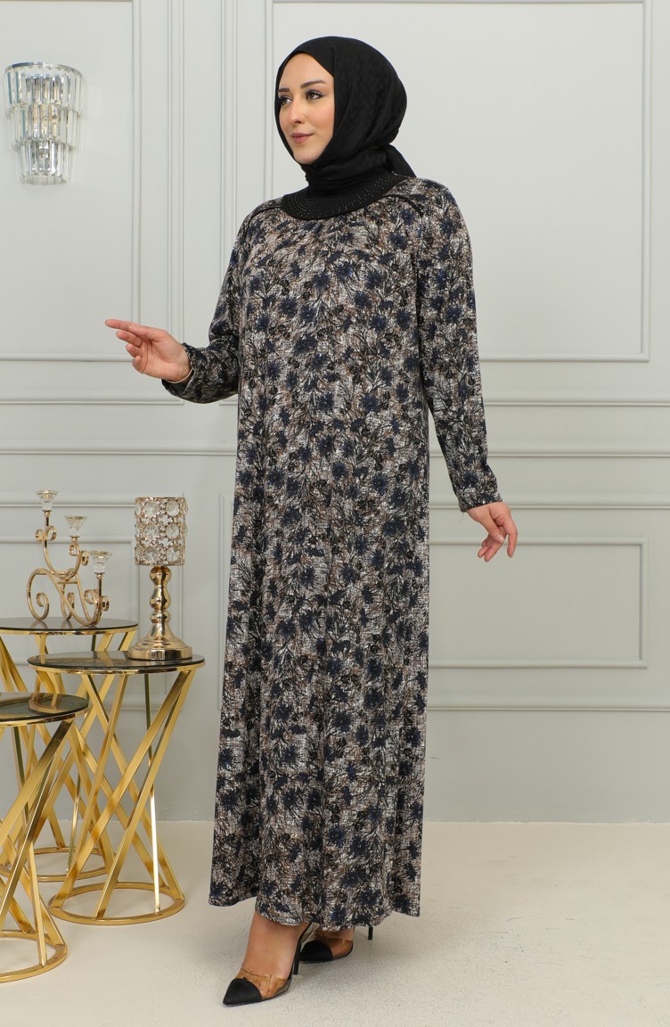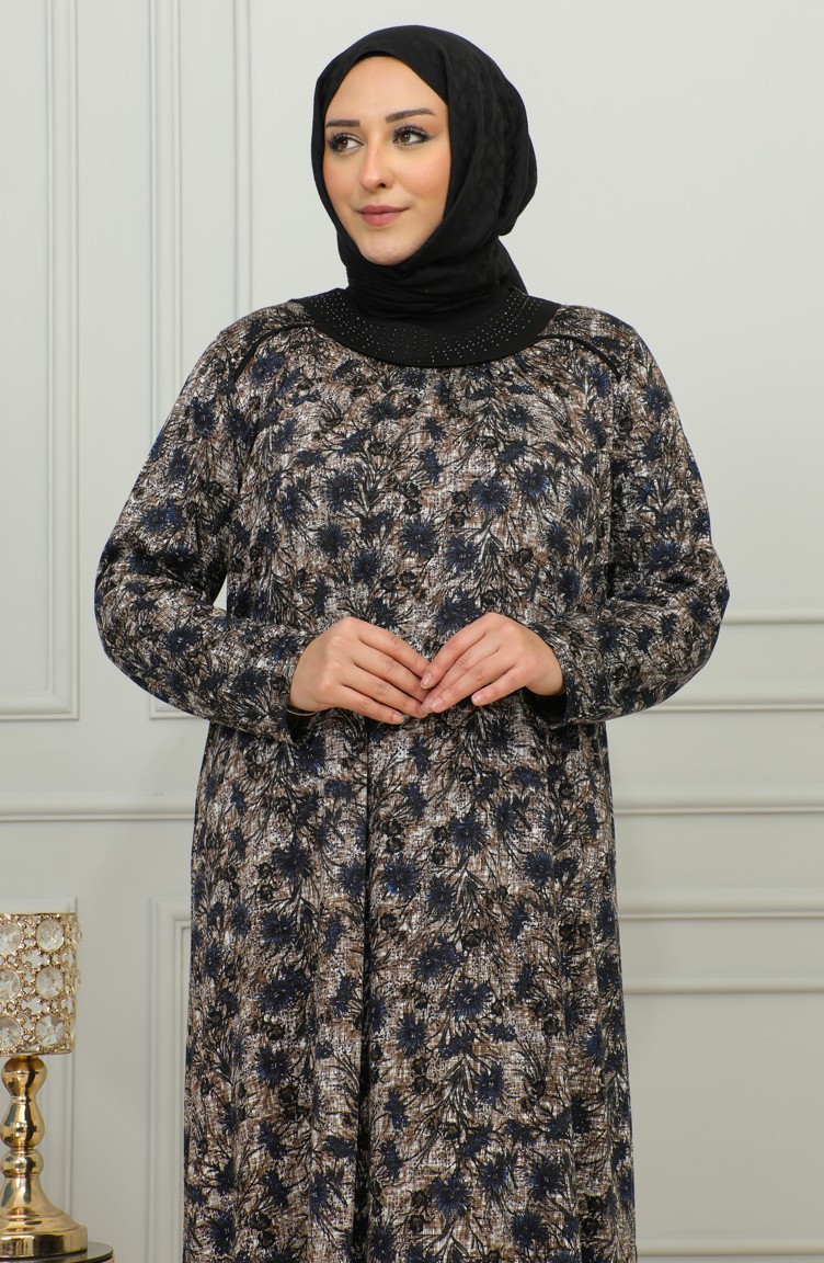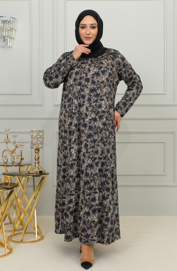 Büyük Beden Desenli Viskon Elbise 4447-04 Lacivert