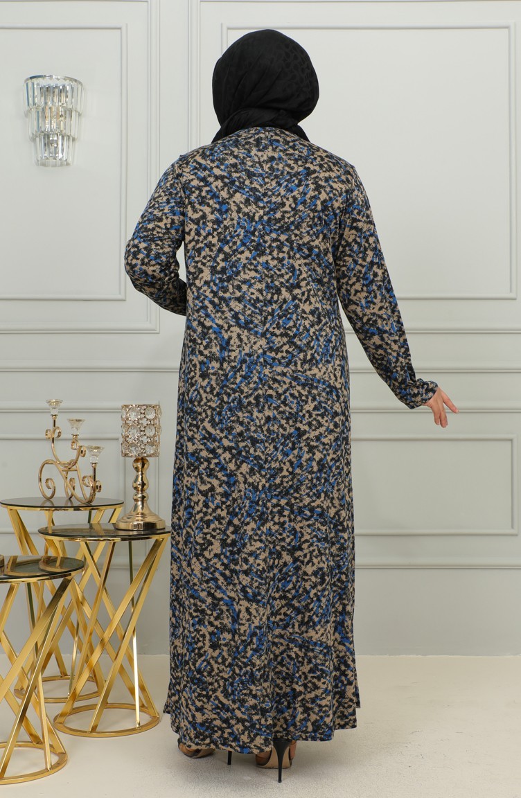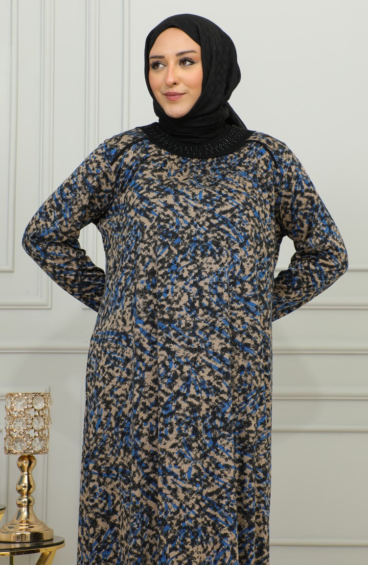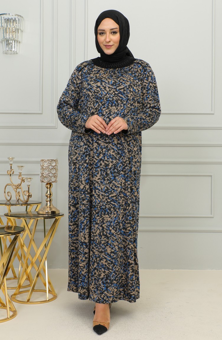 Büyük Beden Desenli Viskon Elbise 4447A-01 Mavi