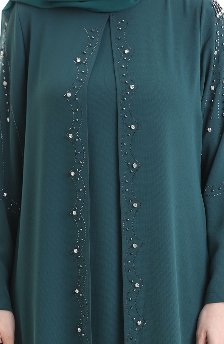Büyük Beden Petek Kumaş Taşlı Elbise 6246-07 Zümrüt Yeşili