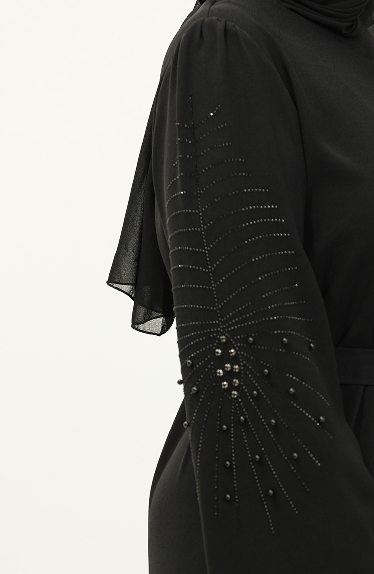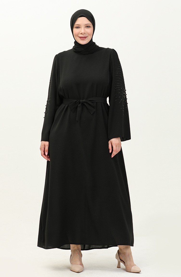 Büyük Beden Taşlı Kuşaklı Elbise 3005-03 Siyah