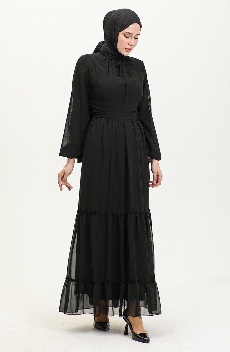 Büzgülü Kuşaklı Şifon Elbise 5726-01 Siyah