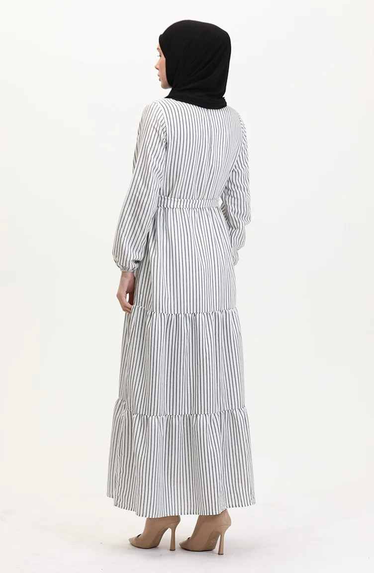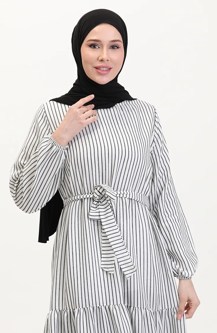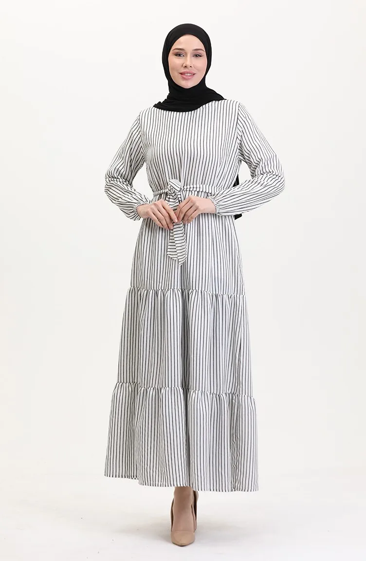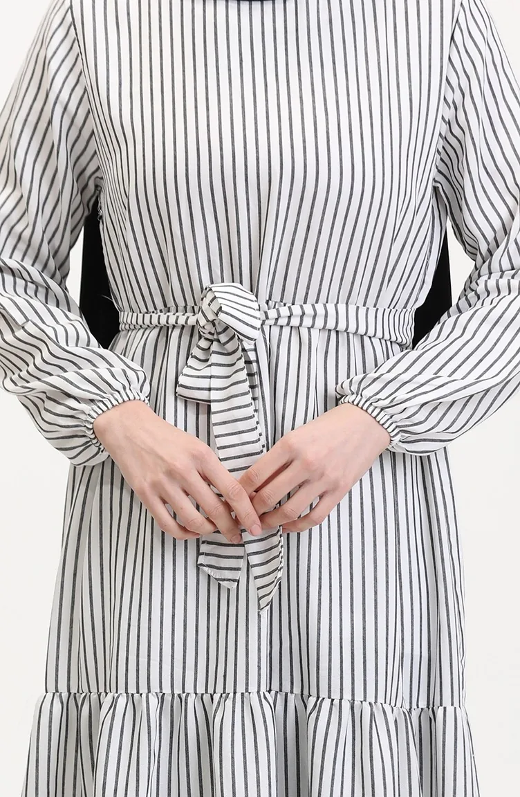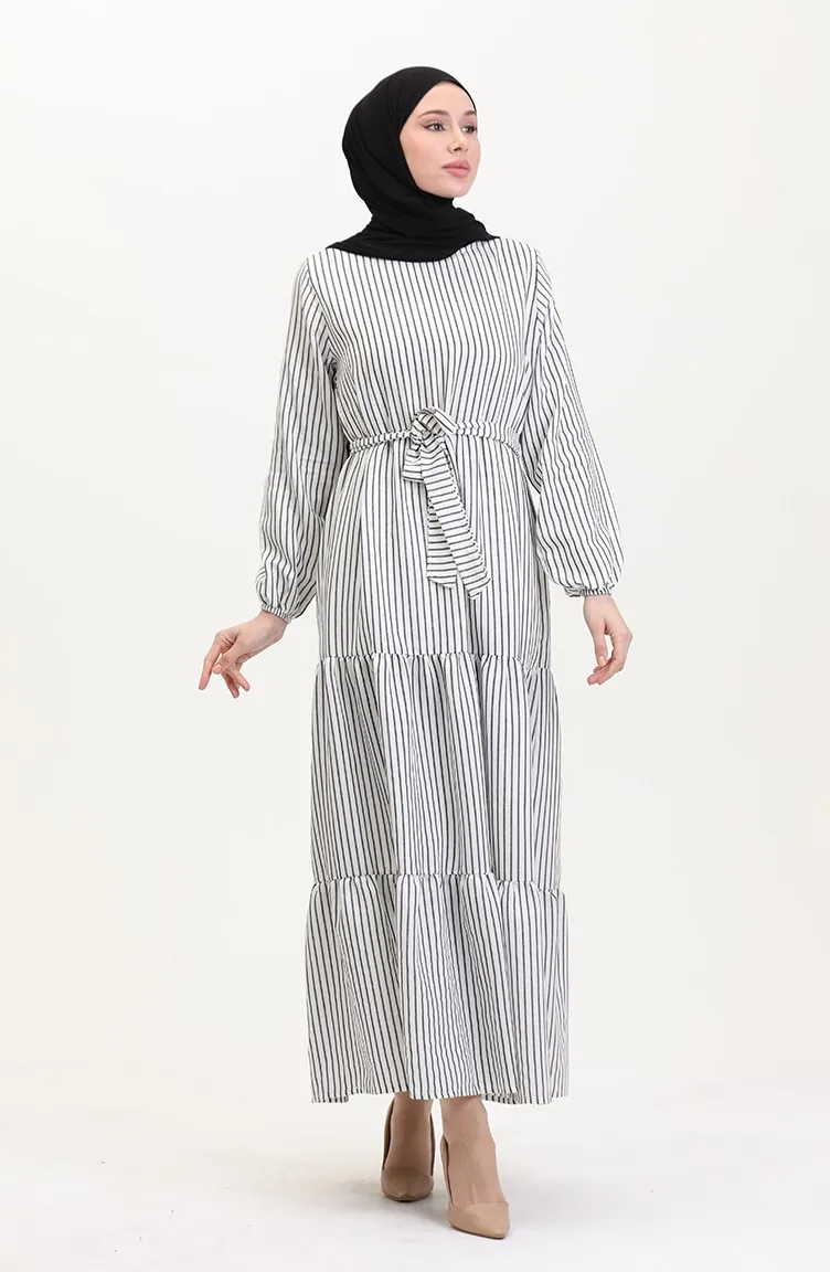 Çizgili Kuşaklı Keten Elbise 0003-03 Beyaz Siyah