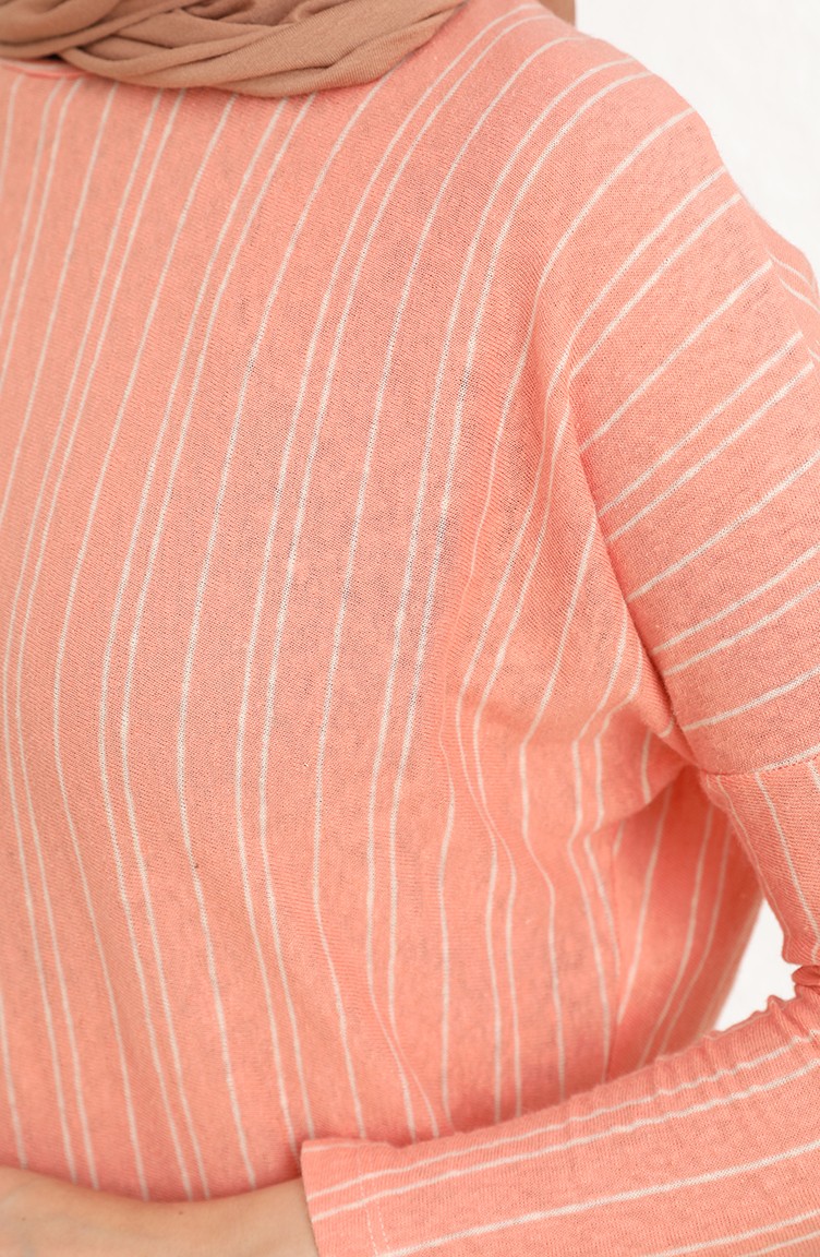 Yavruağzı renktedir. Pamuk dokuma kumaş. Çizgilidir. Astarsız. Uzun kolludur. Sıfır yaka detayı ile rahat kullanıma sahiptir. 4 Mevsim tercih edebilirsiniz. Büyük beden seçeneği mevcuttur.