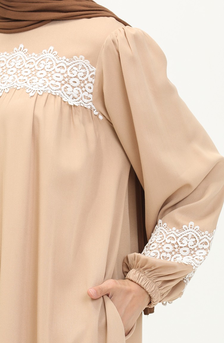Bej renktedir. Pamuk dokuma kumaş. Sade. Dantel detaylı. Uzun kolludur. Sıfır yaka detayı ile rahat kullanıma sahiptir. 4 Mevsim tercih edebilirsiniz. Büyük beden seçeneği mevcuttur.