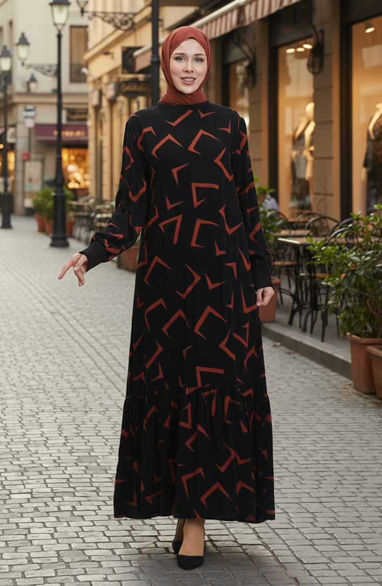 Desenli Elbise 0455-01 Siyah Kiremit