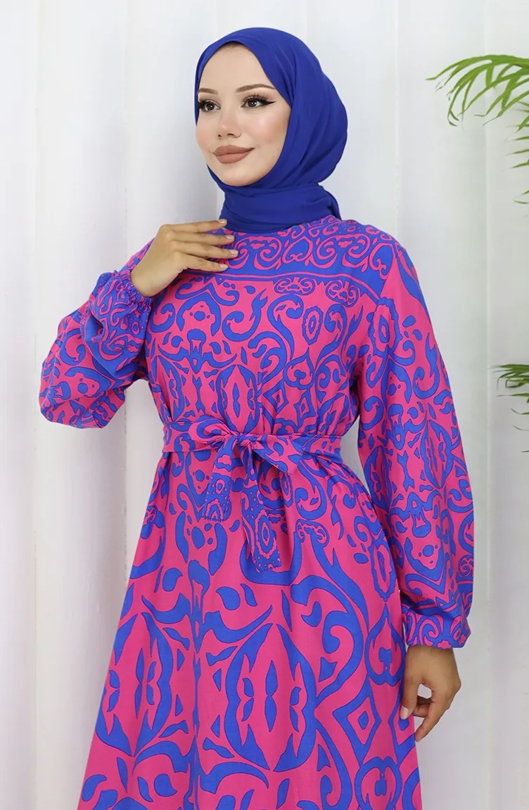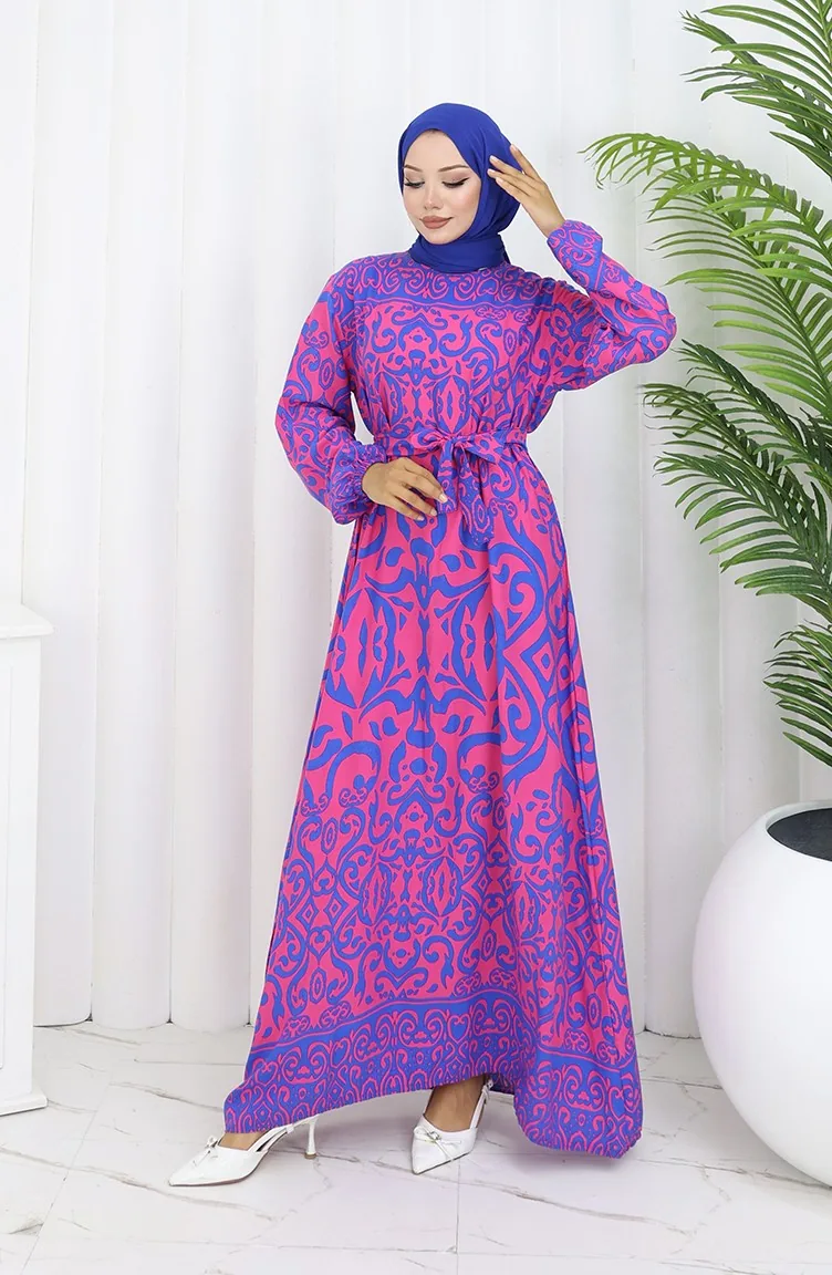 Desenli Kuşaklı Elbise 2091-01 Fuşya Saks