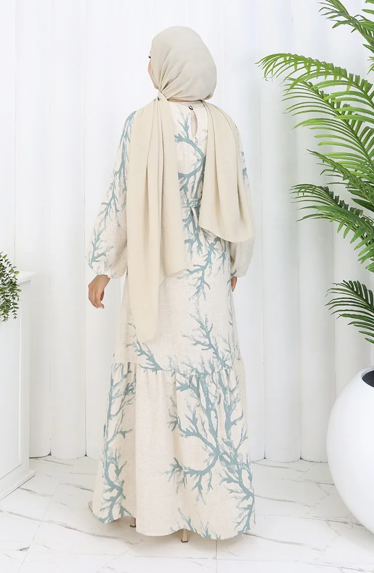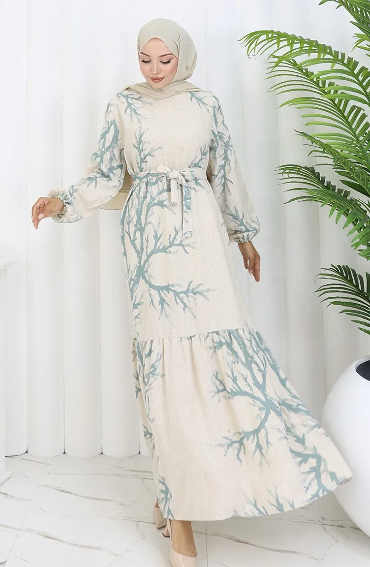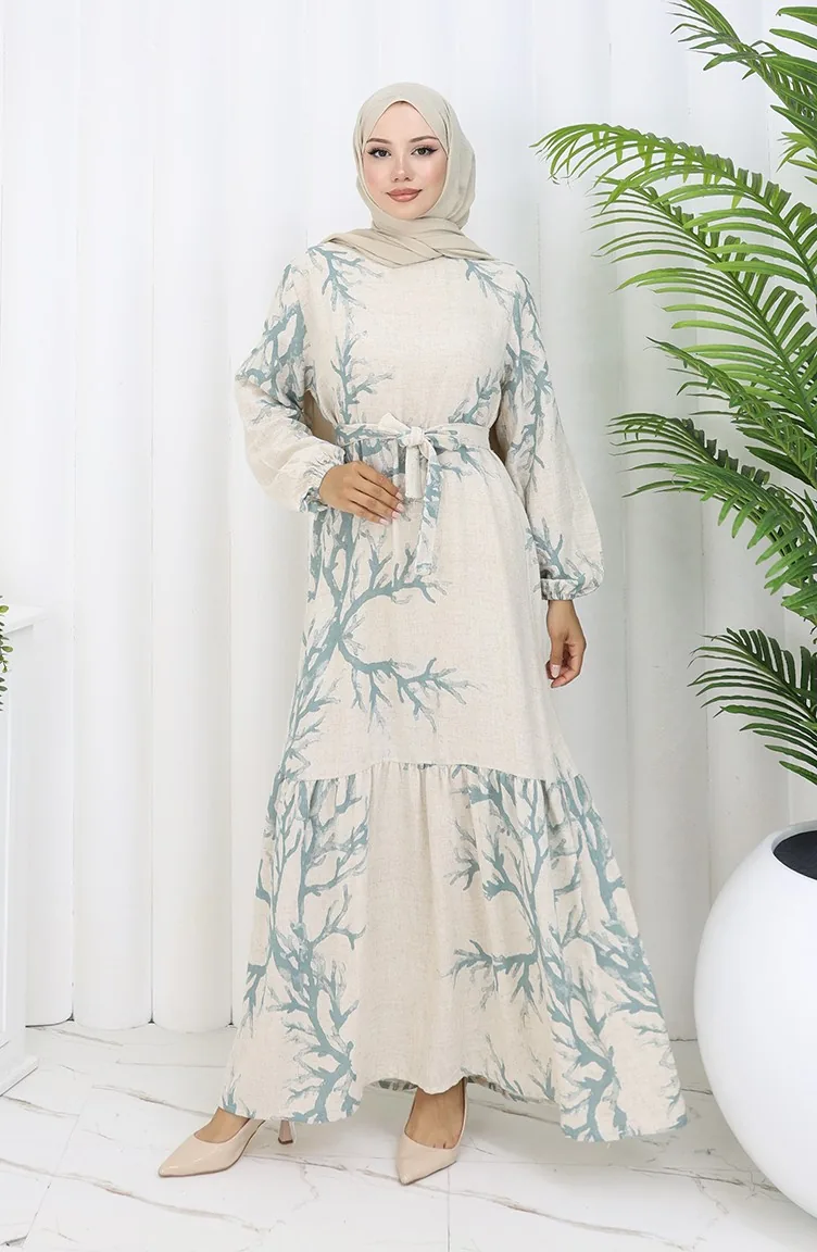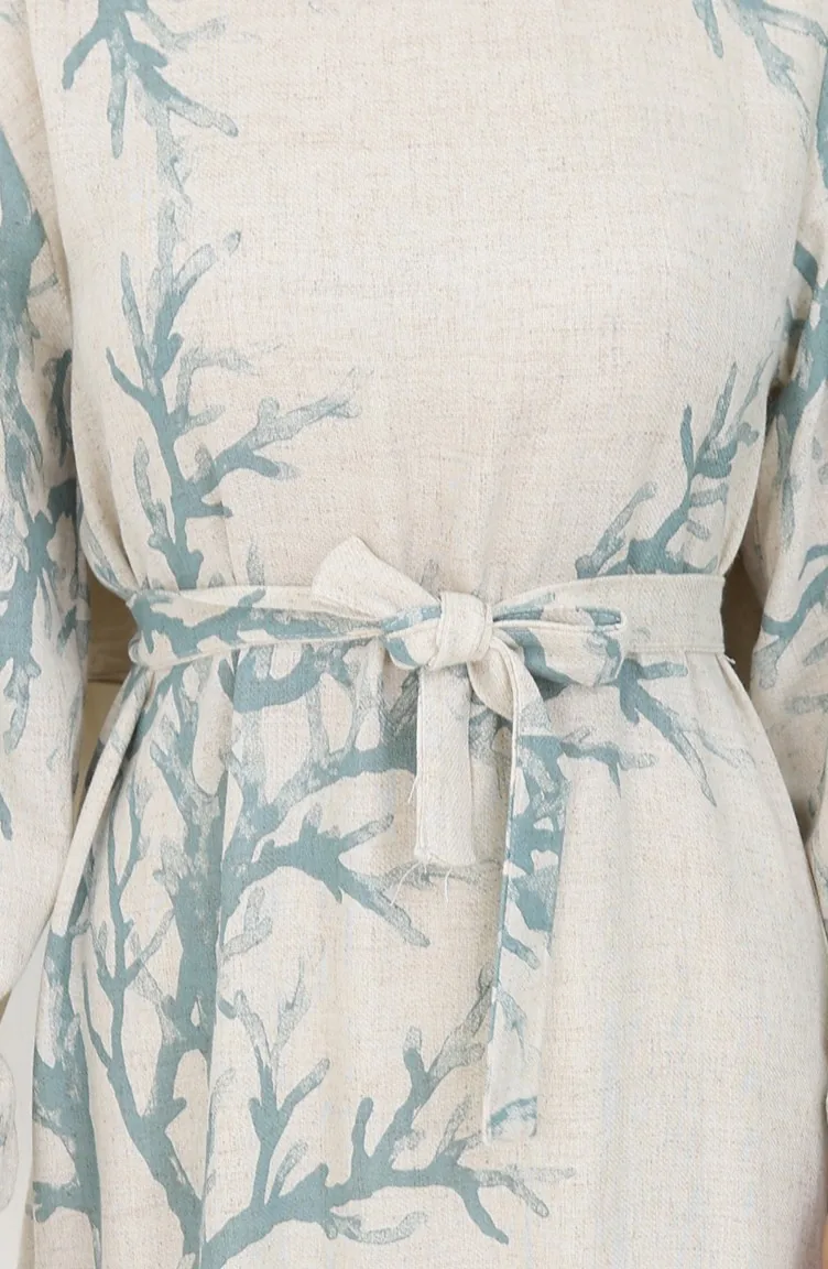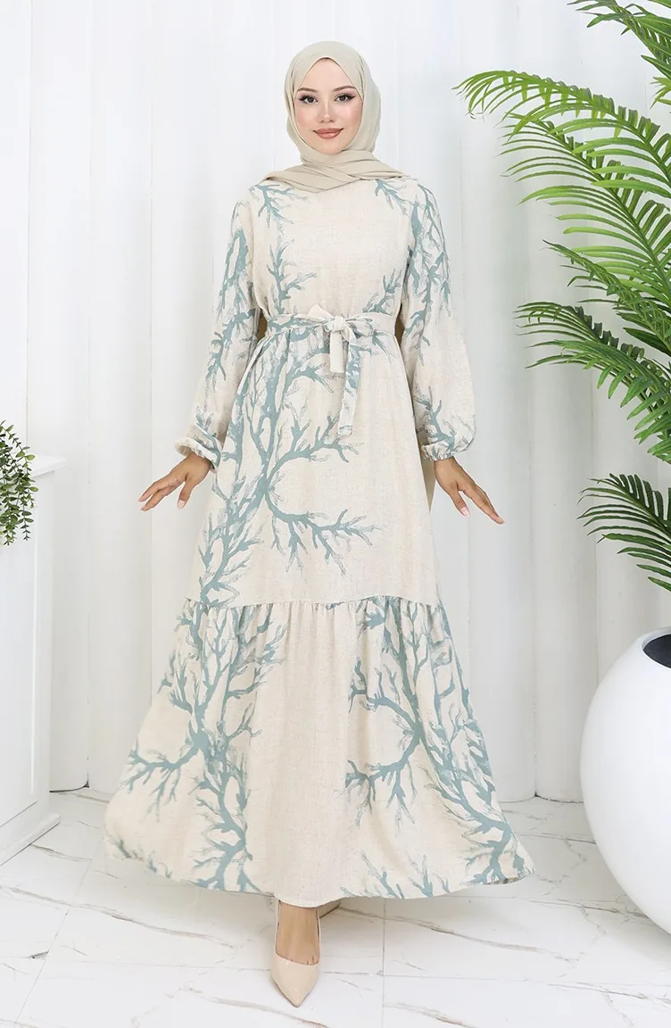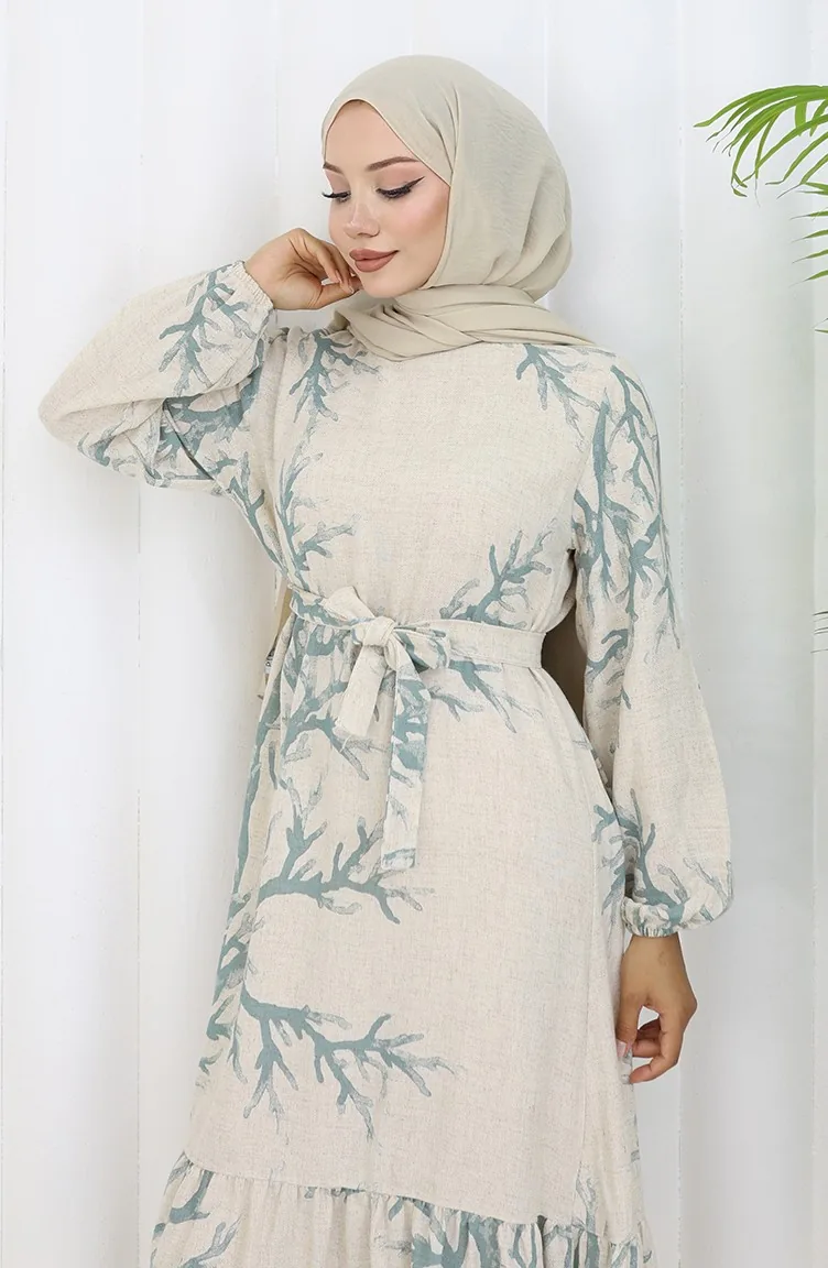 Desenli Kuşaklı Keten Elbise 2087-05 Bej Çağla Yeşil