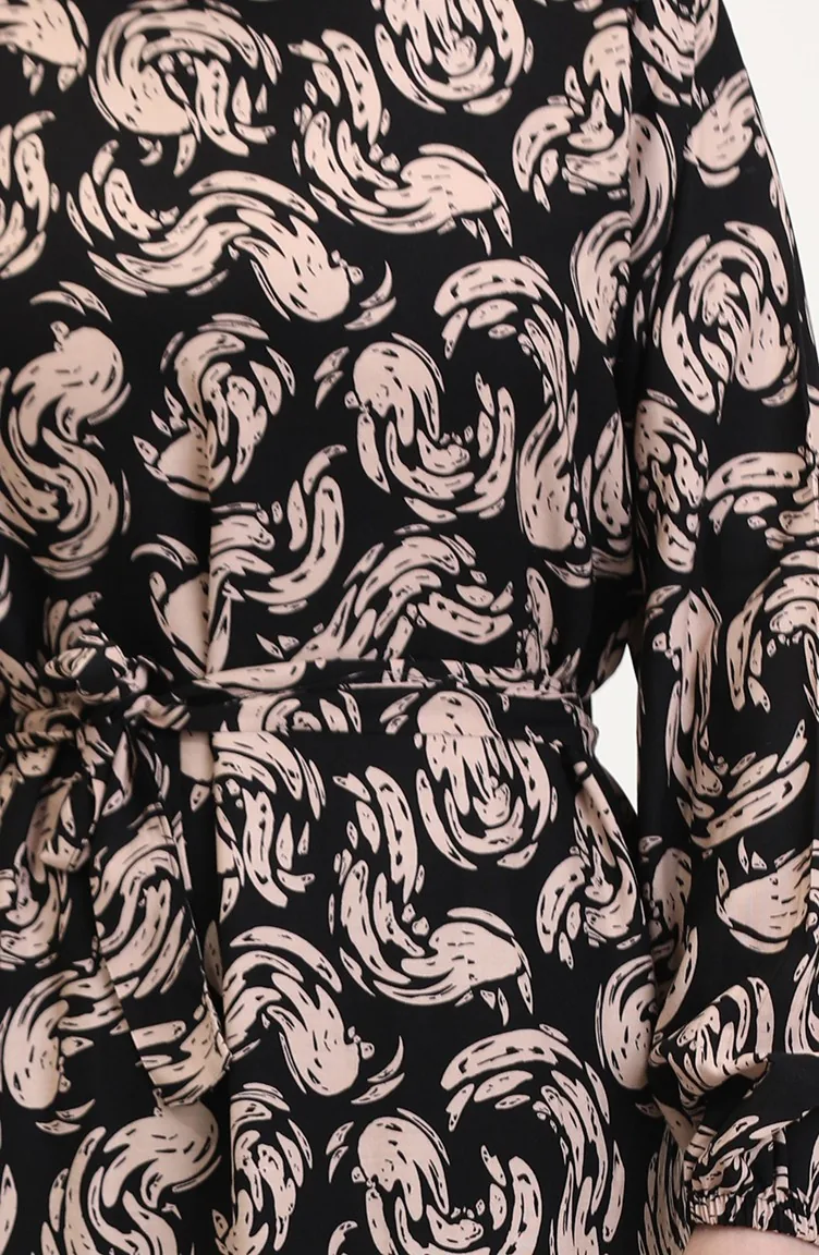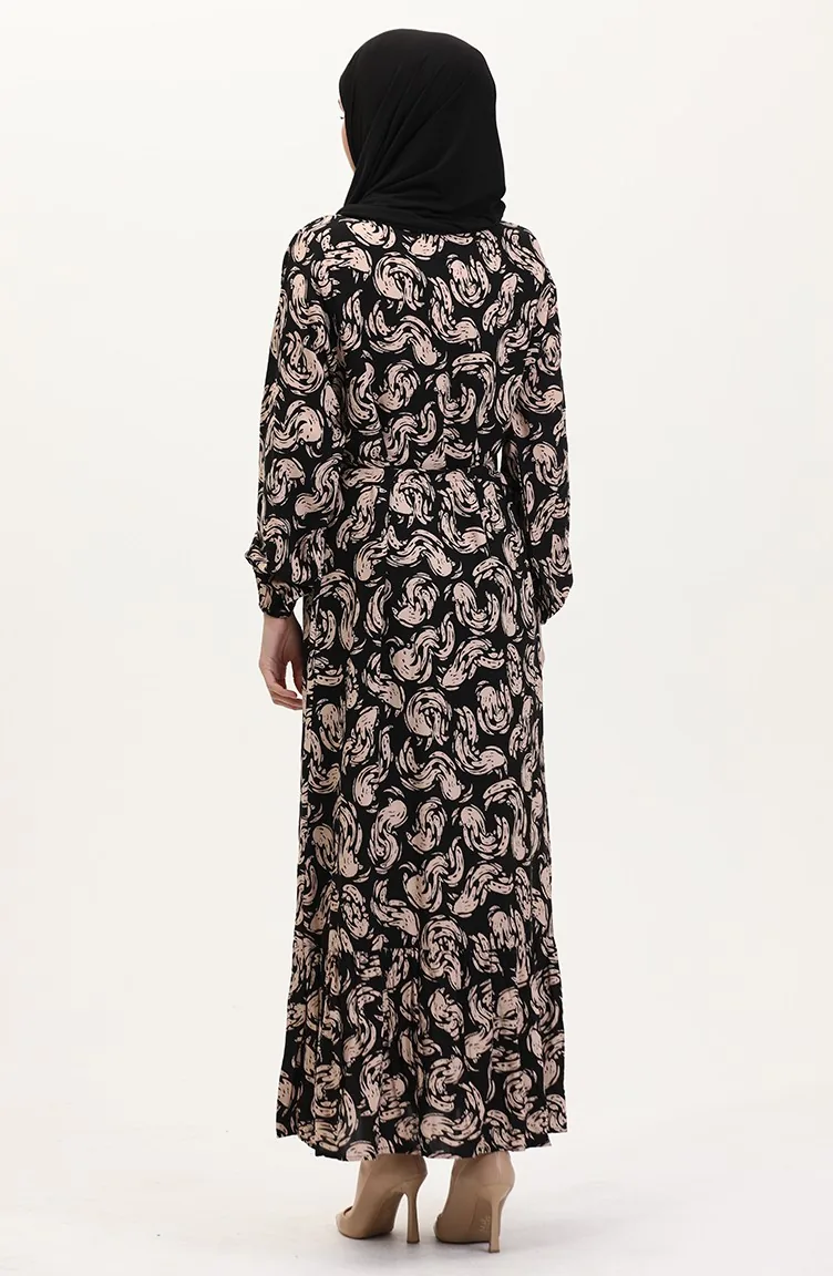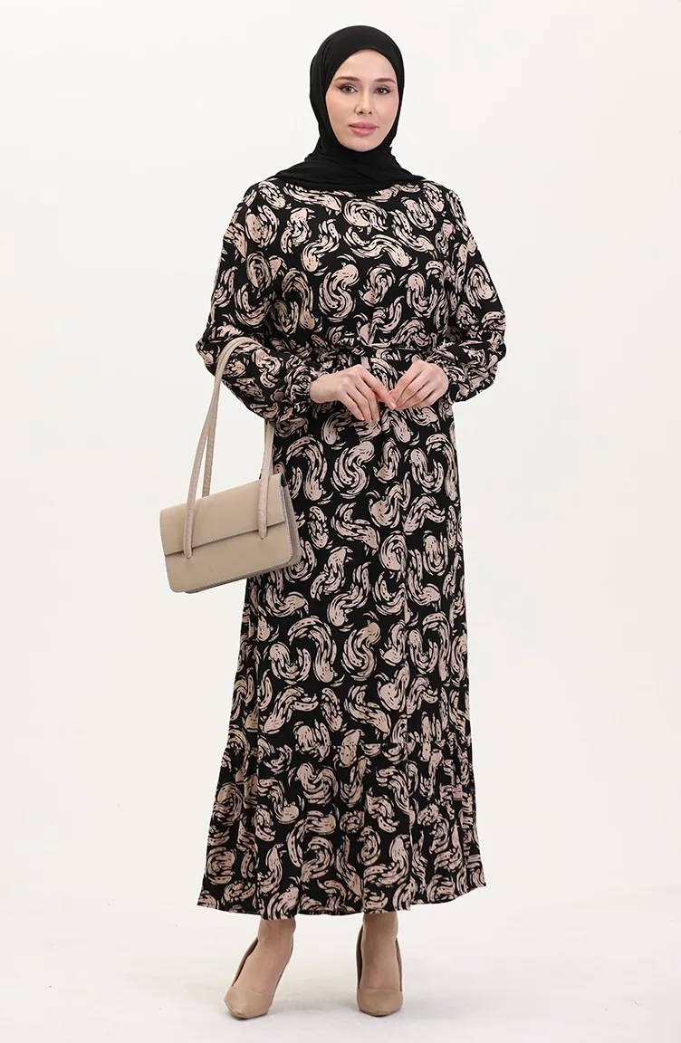Desenli Kuşaklı Viskon Elbise 0013-01 Siyah Sütlü kahve