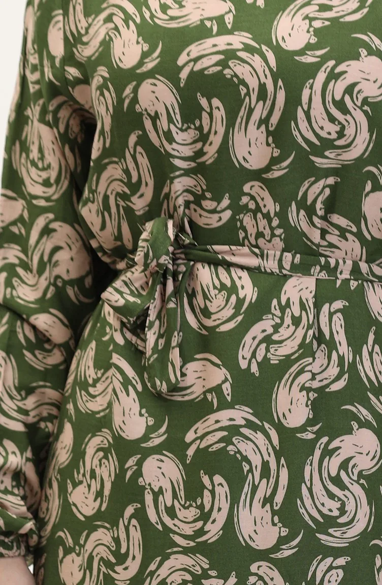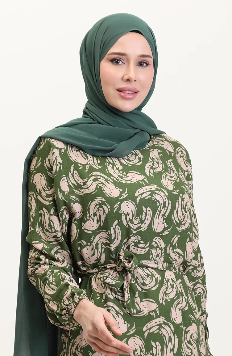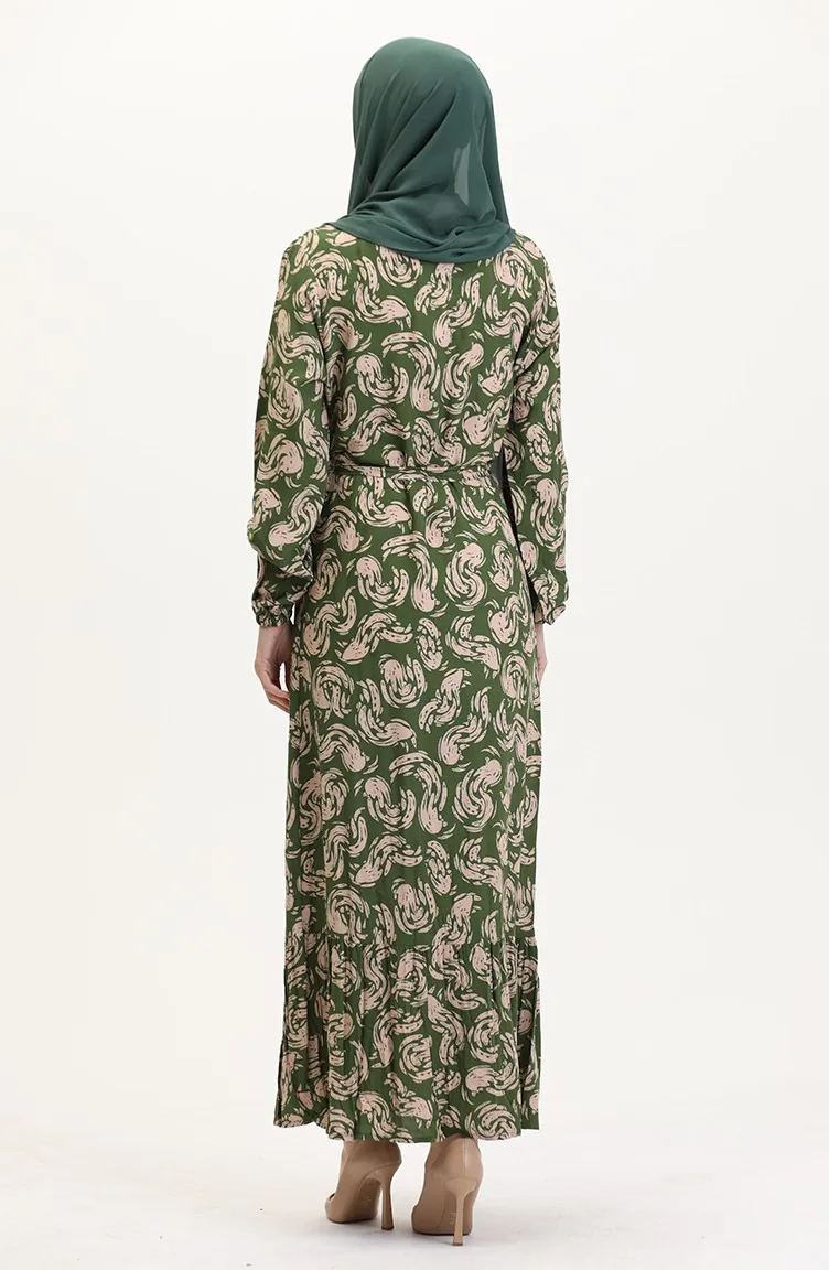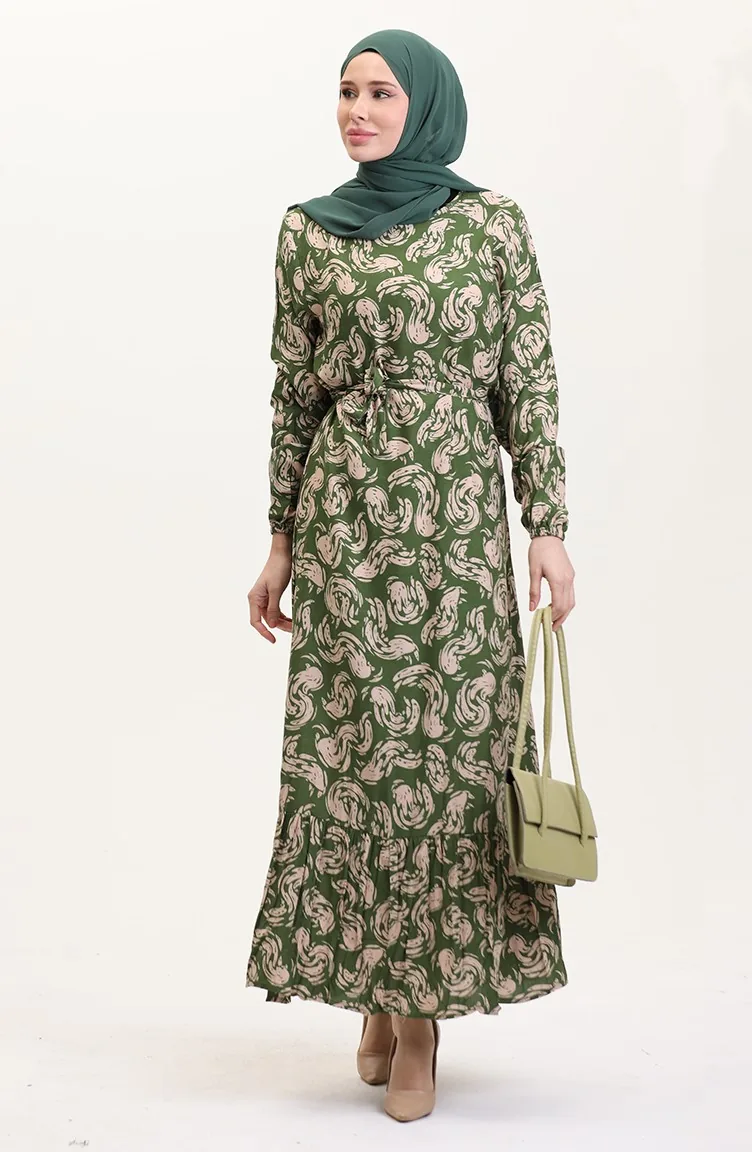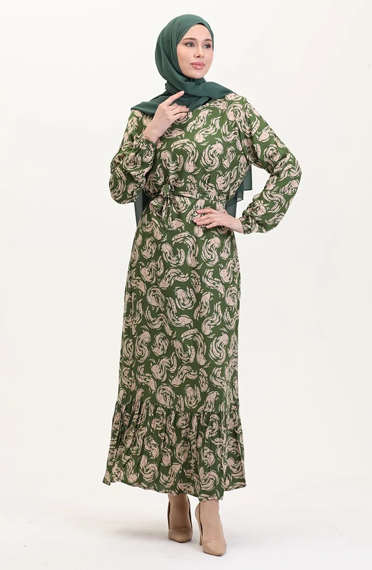 Desenli Kuşaklı Viskon Elbise 0013-04 Haki