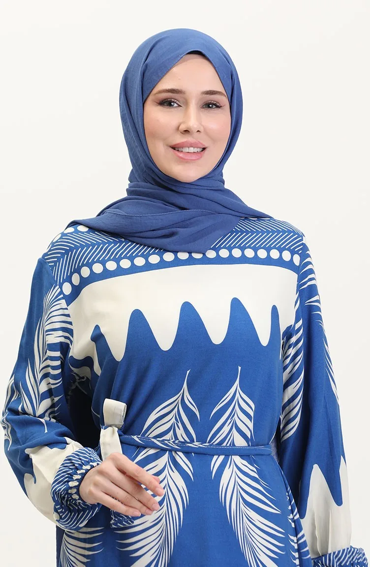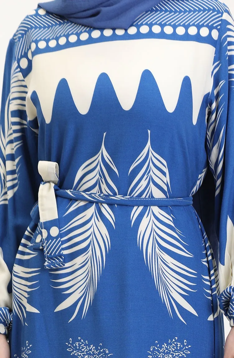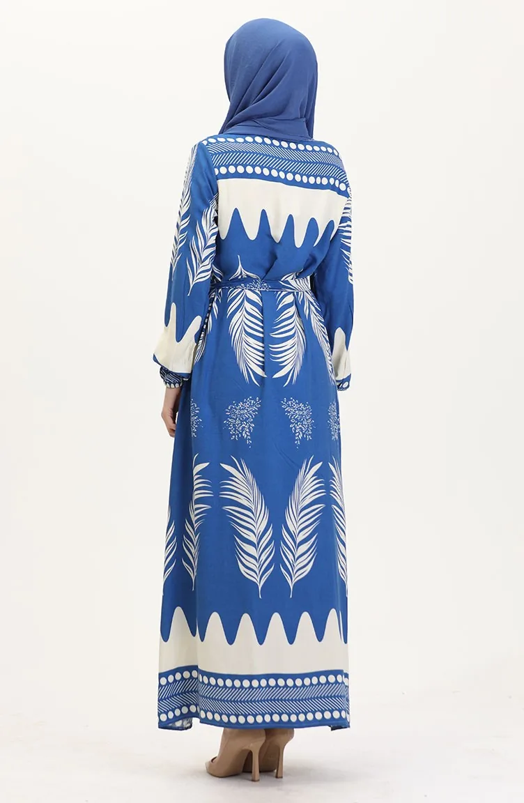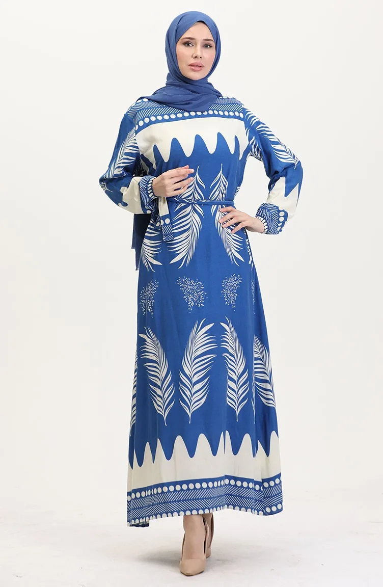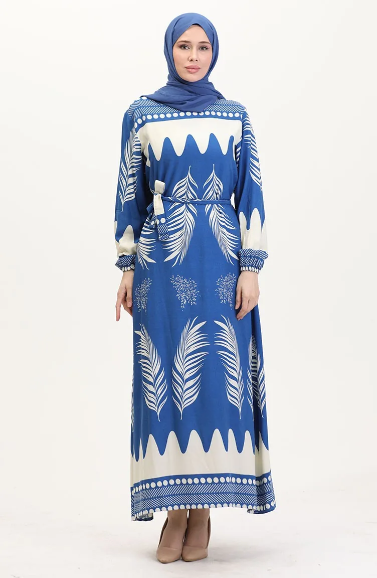 Desenli Kuşaklı Viskon Elbise 0019-05 İndigo Bej