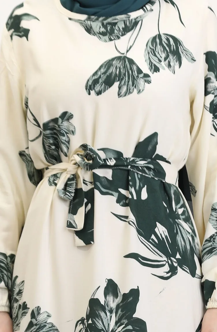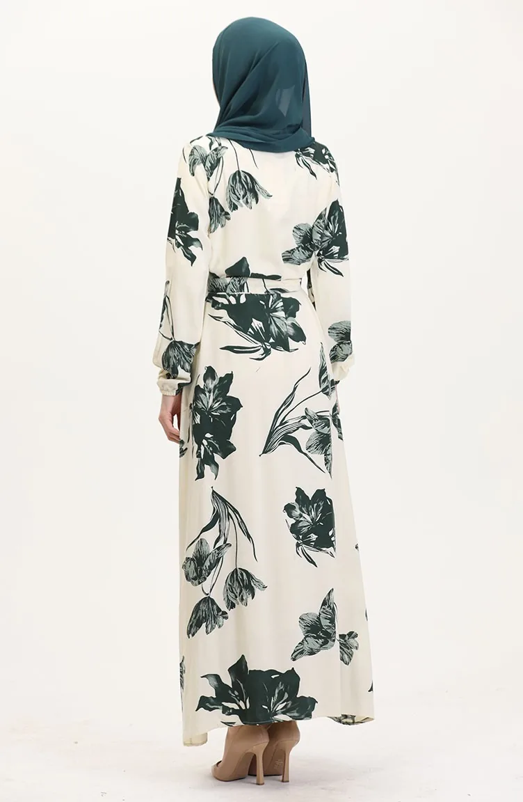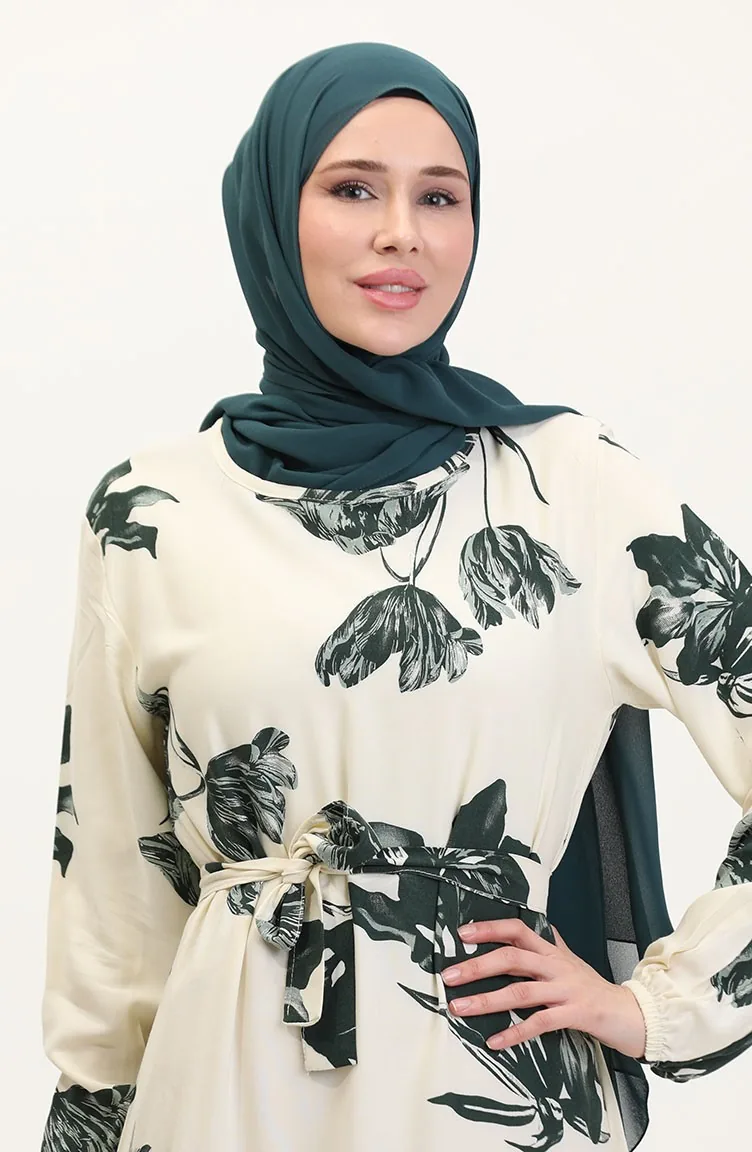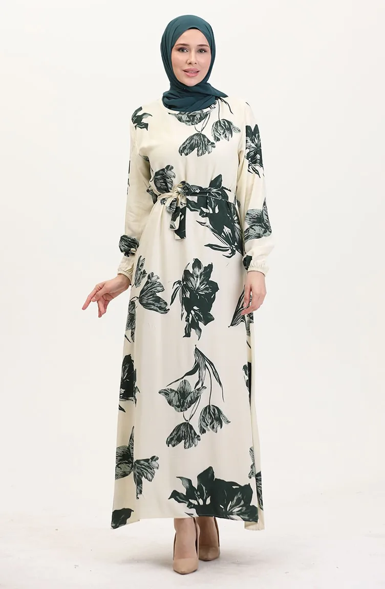 Desenli Kuşaklı Viskon Elbise 0022-01 Krem Koyu Yeşil