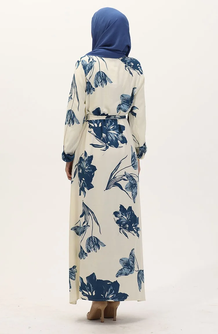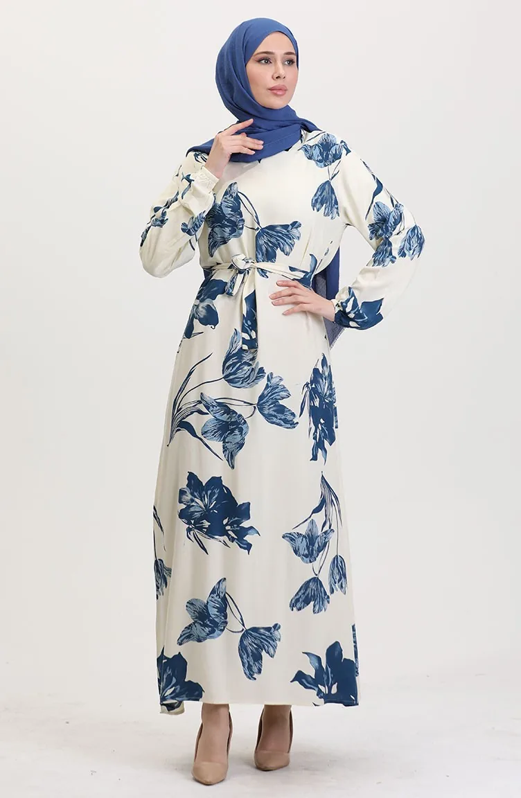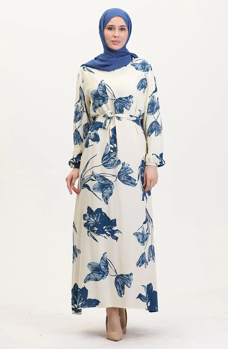 Desenli Kuşaklı Viskon Elbise 0022-02 Krem Petrol