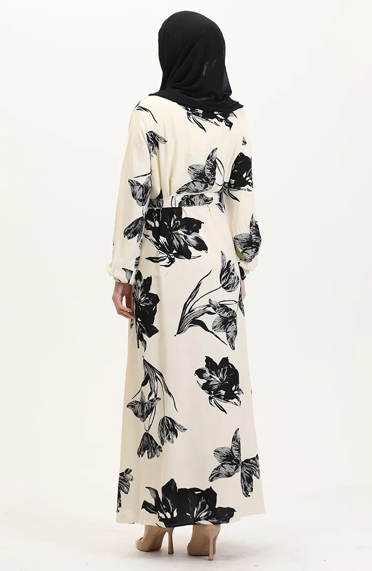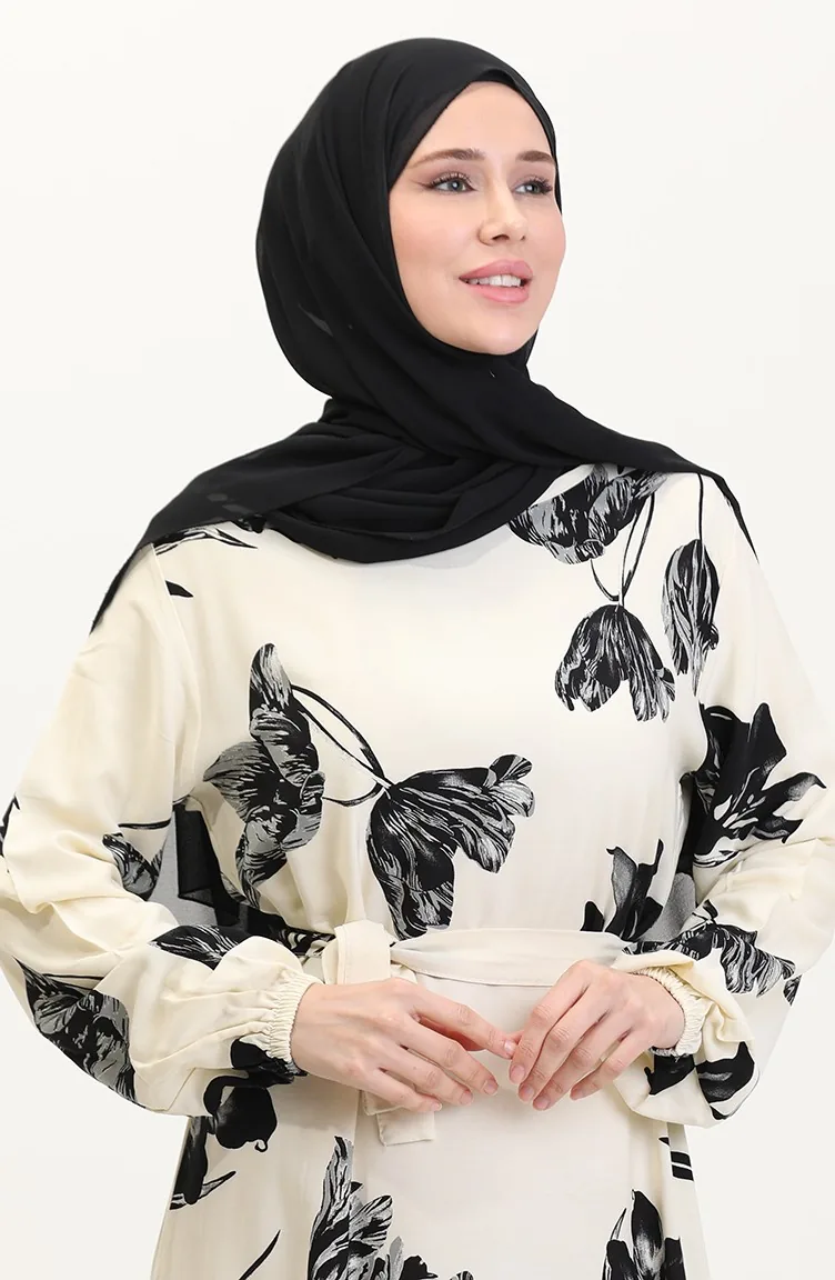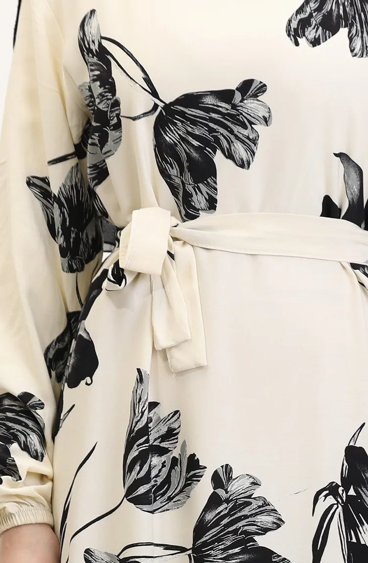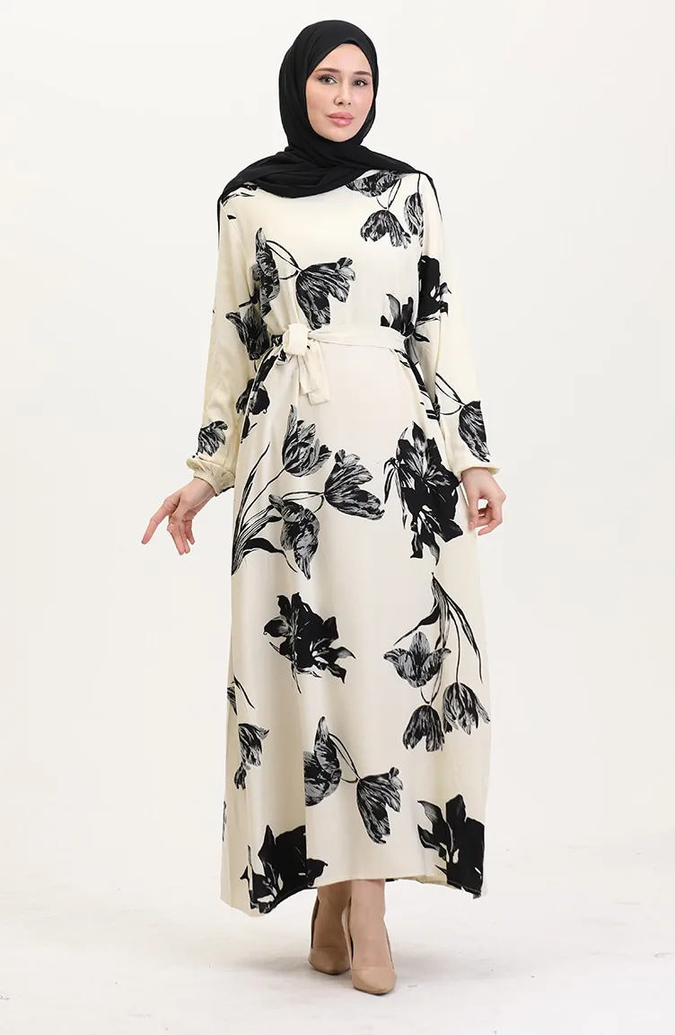 Desenli Kuşaklı Viskon Elbise 0022-03 Krem Siyah