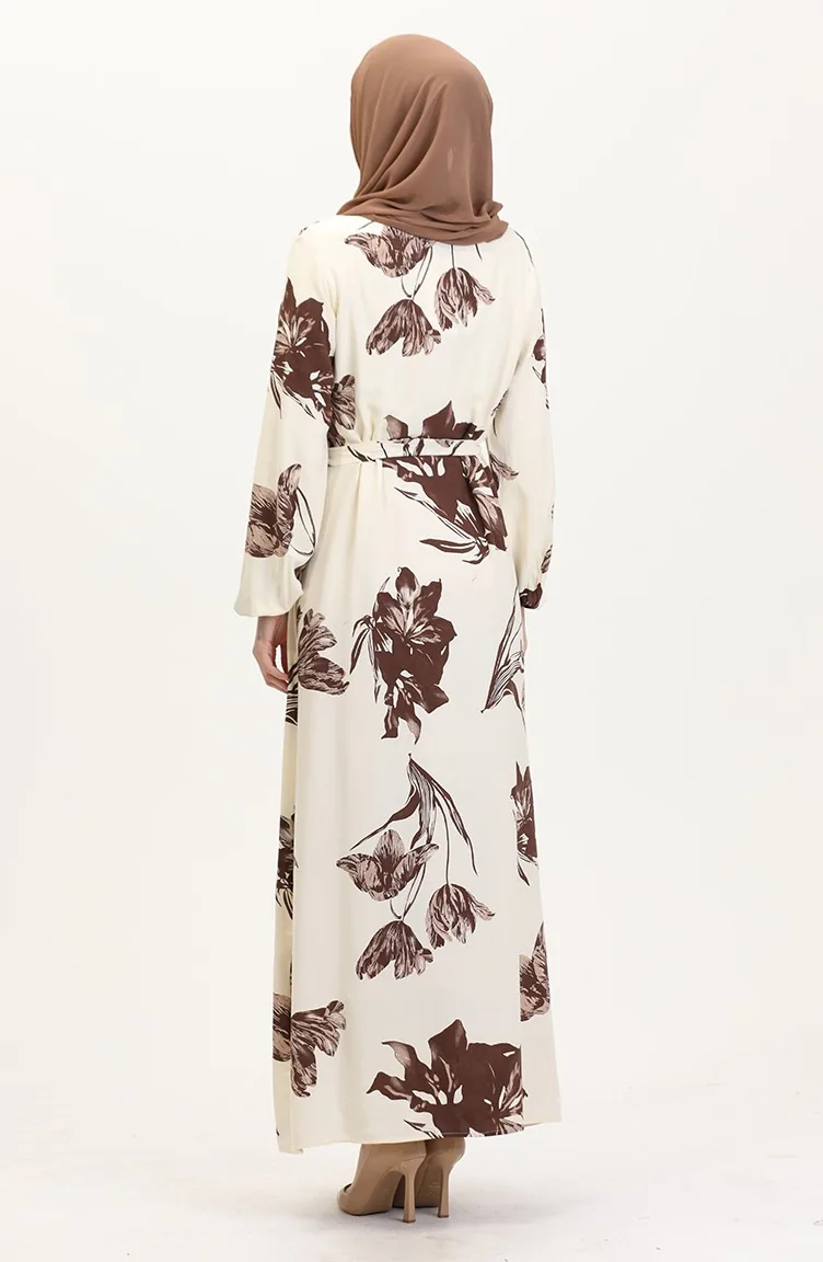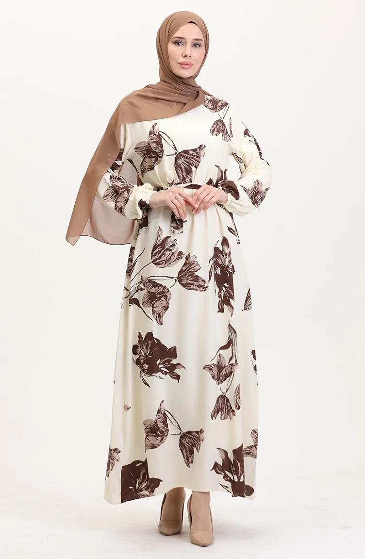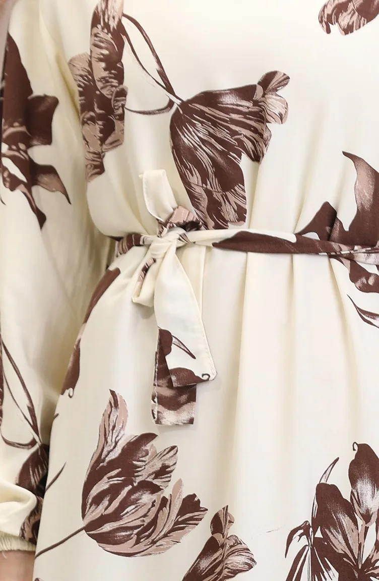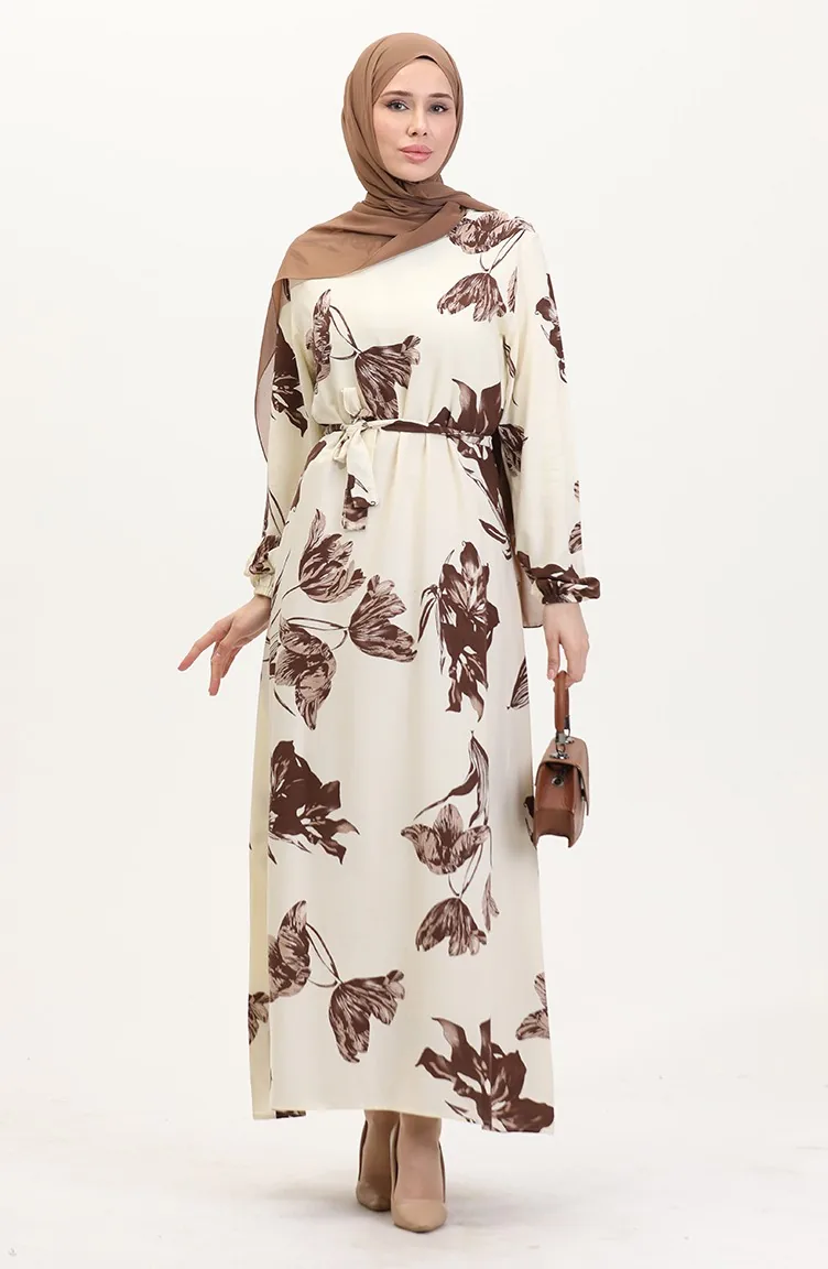 Desenli Kuşaklı Viskon Elbise 0022-04 Krem Kahverengi