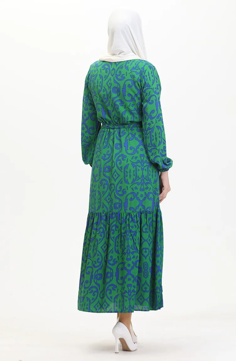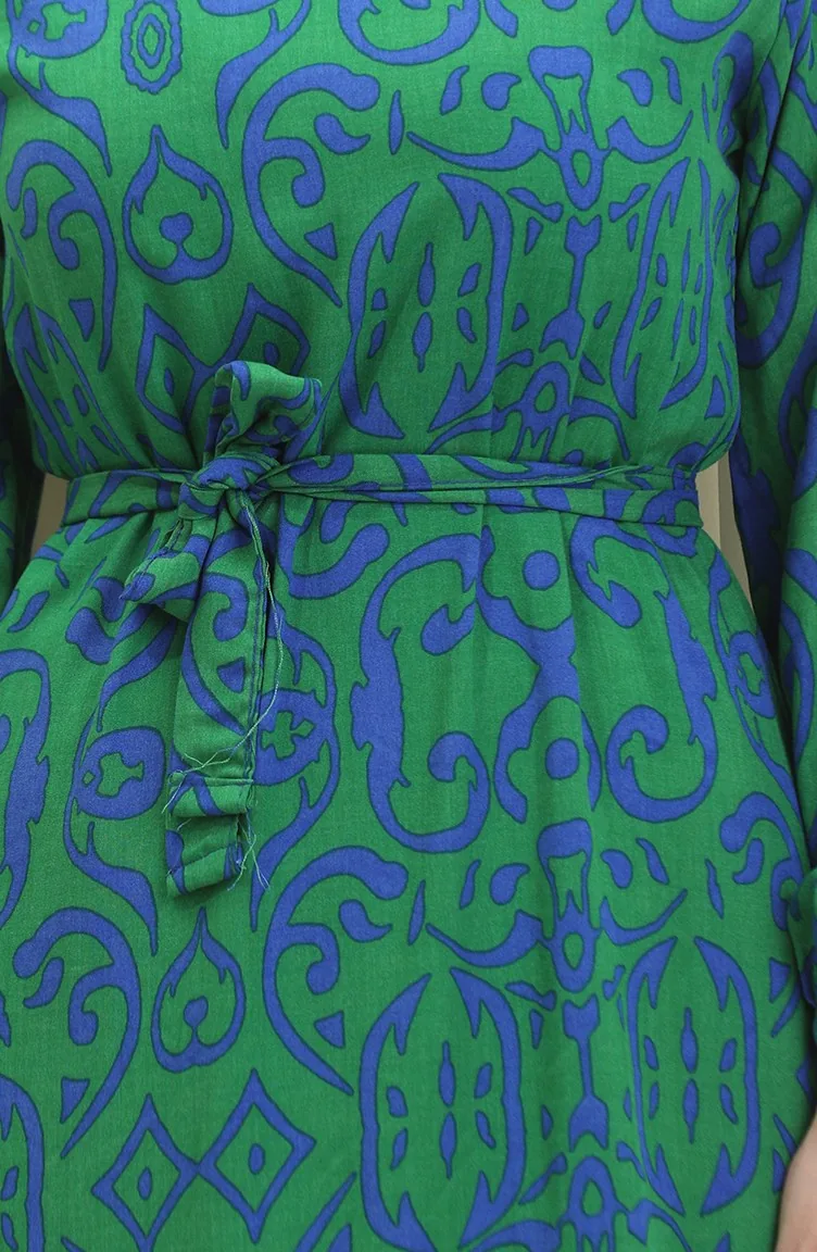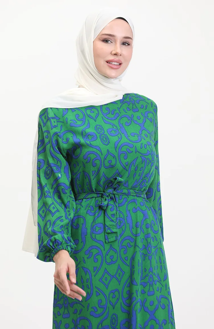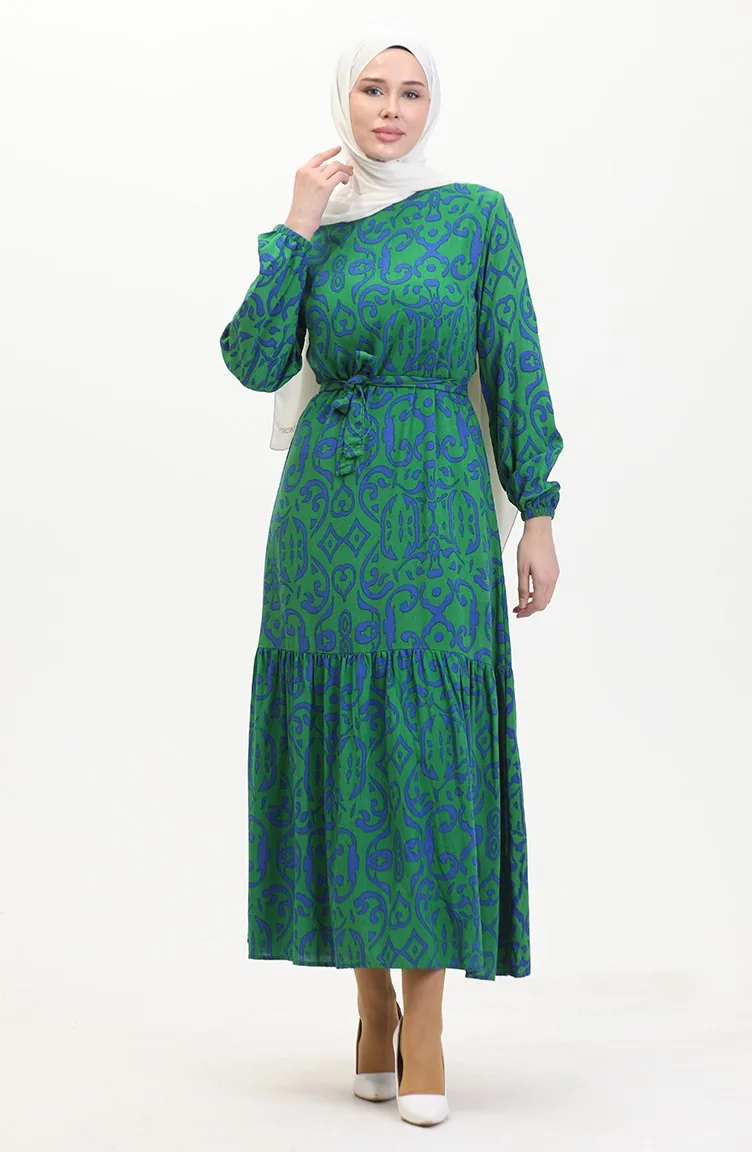 Desenli Kuşaklı Viskon Elbise 0469-01 Yeşil