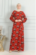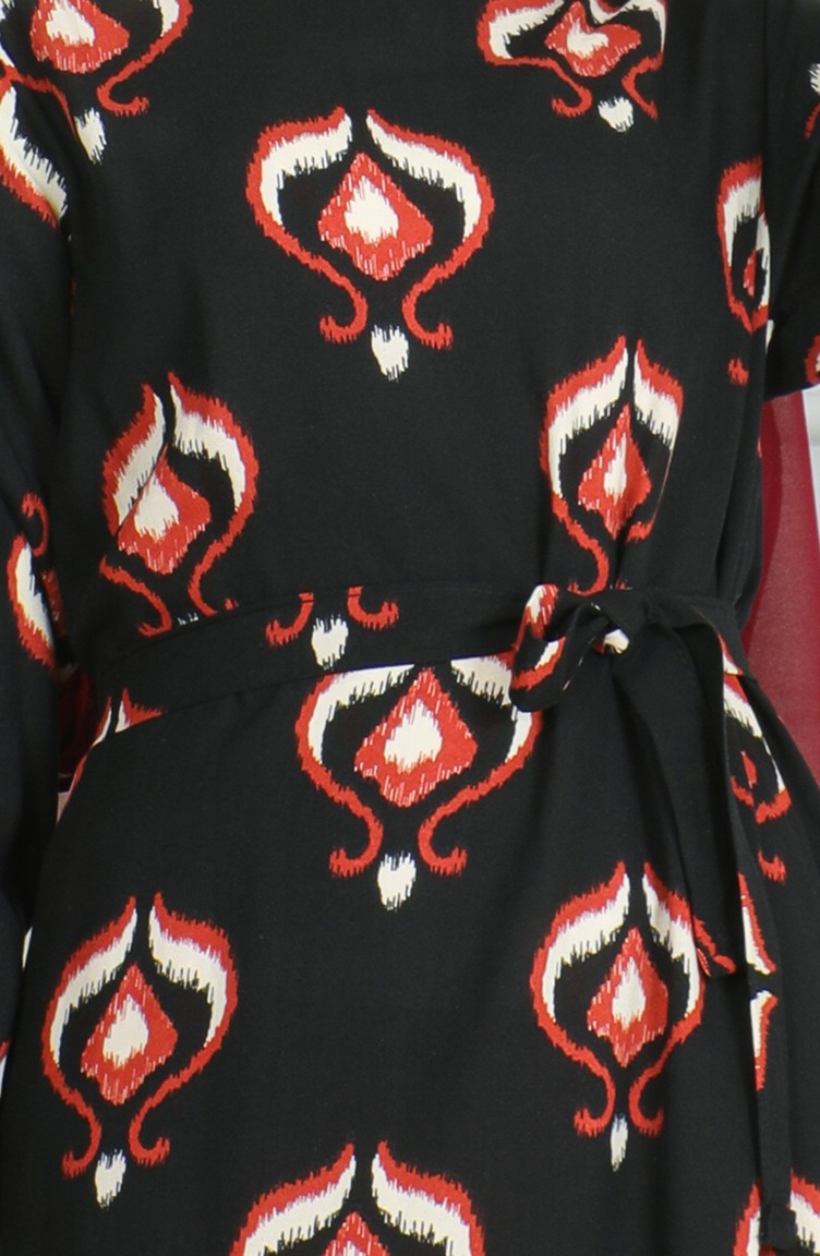 Desenli Kuşaklı Viskon Elbise 0491-03 Siyah Bej