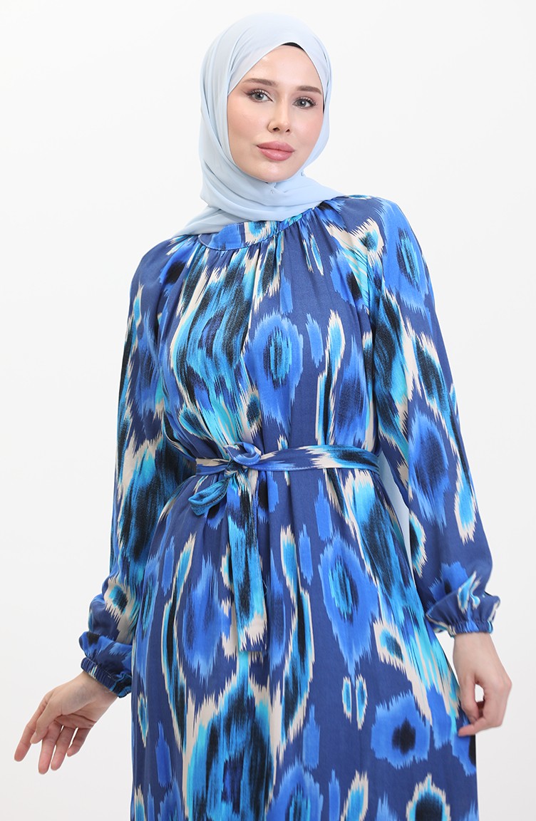 Desenli Kuşaklı Viskon Elbise 0501A-05 Lacivert Saks