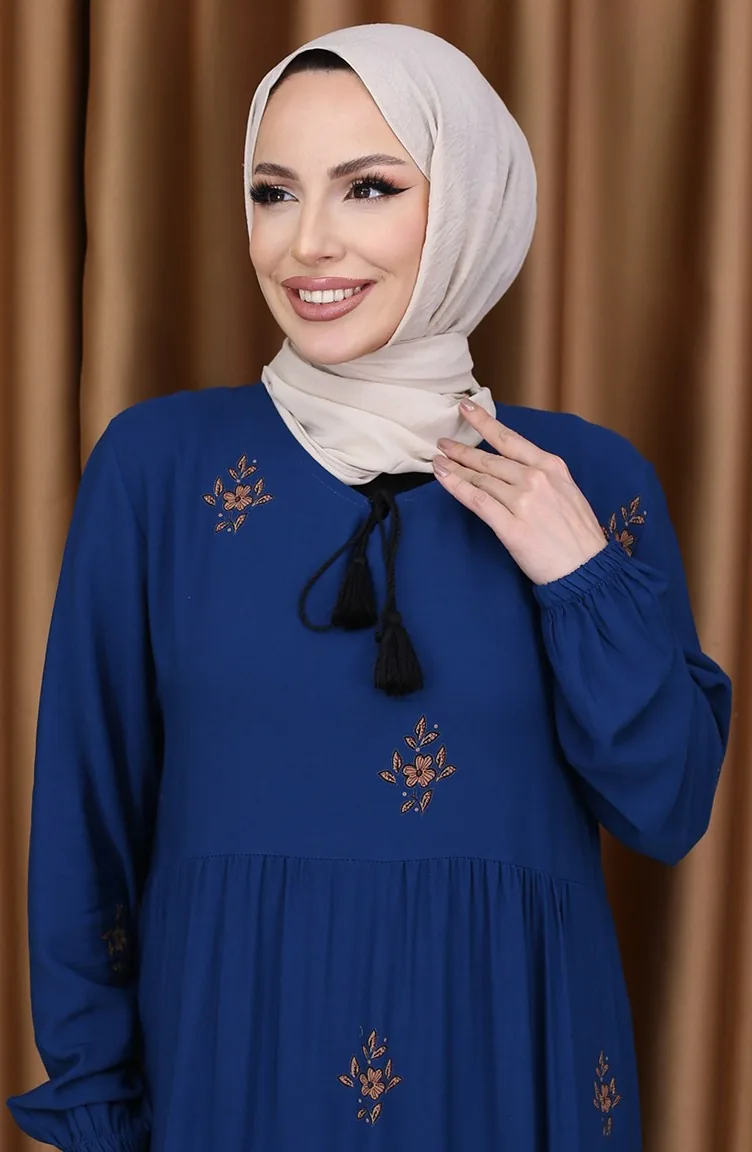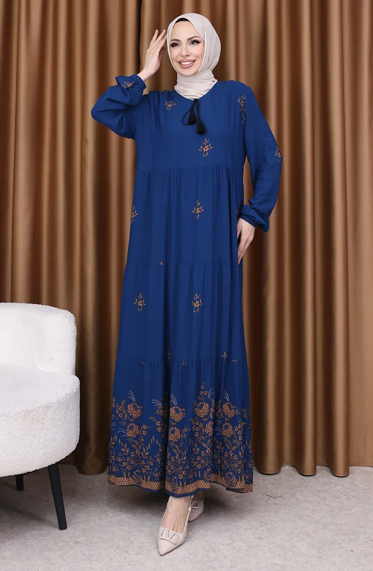 Petrol renktedir. Viskon kumaş. Desenli kumaş. Astarsız. Lastik kollu. Sıfır yaka detayı ile rahat kullanıma sahiptir. Yazlık. Büyük beden seçeneği mevcuttur.
