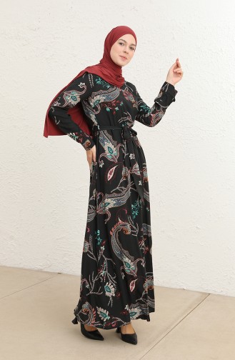 Ebruli Desen Viskon Elbise 60289-01 Siyah Yeşil