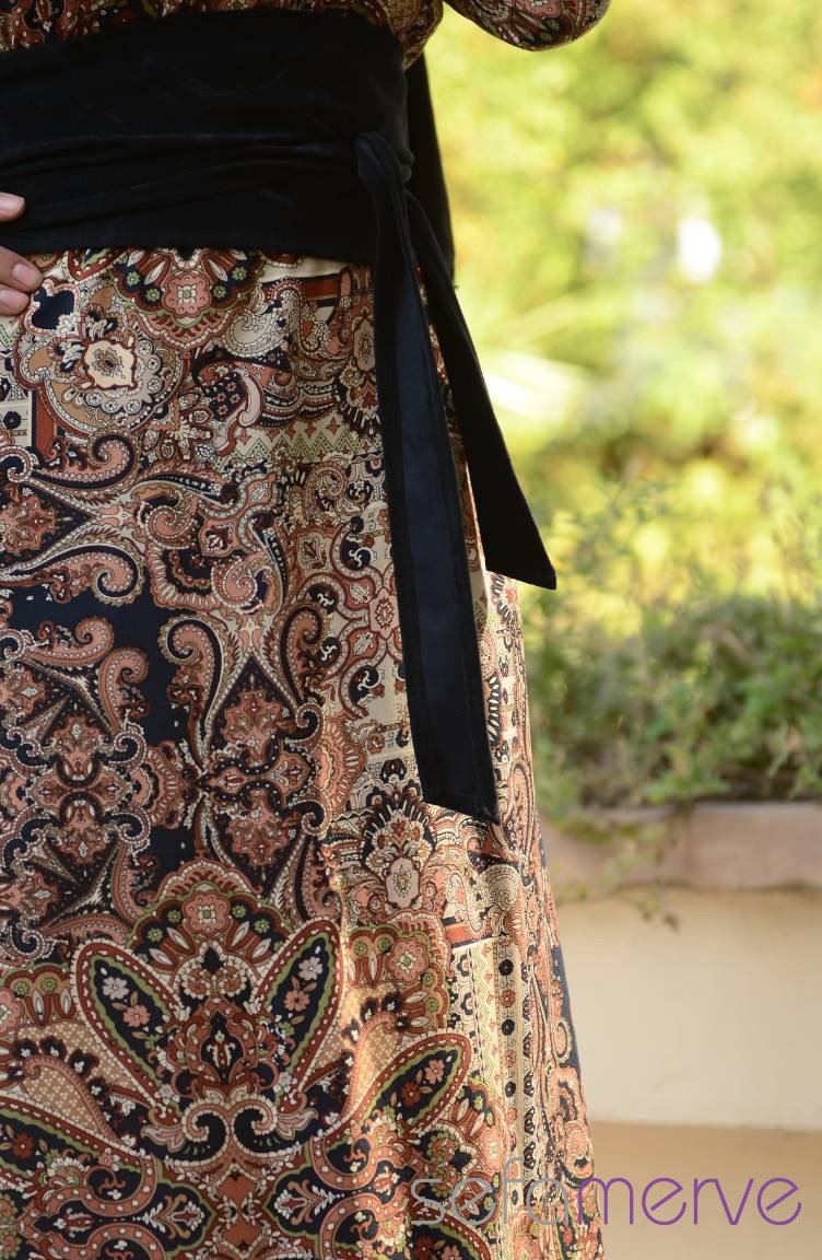 Kahverengi renktedir. Çizgilidir. Kemerli. Uzun kolludur. Mevsimlik. Mankenin giydiği beden ölçüsü'dür.