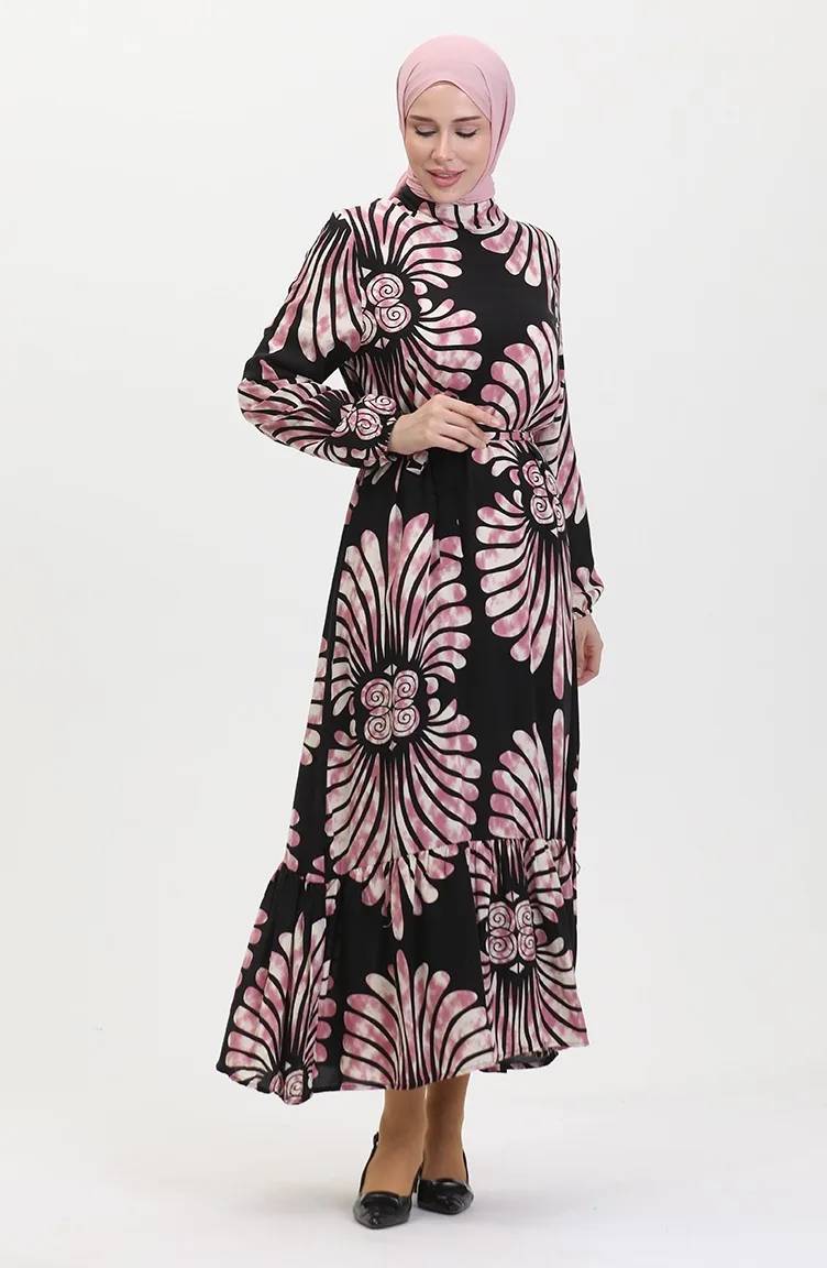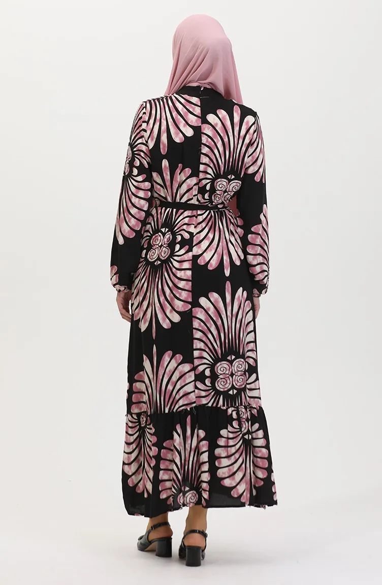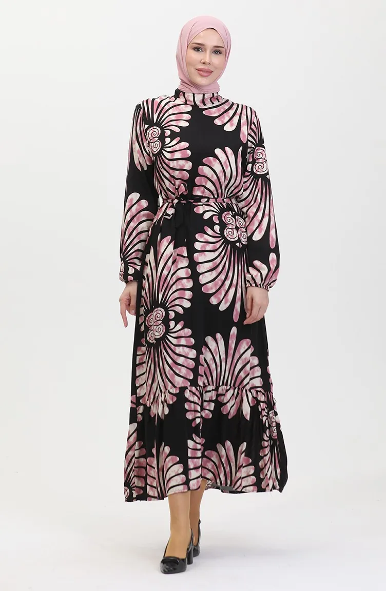 Eteği Fırfırlı Kemerli Elbise 50171-05 Gül Kurusu