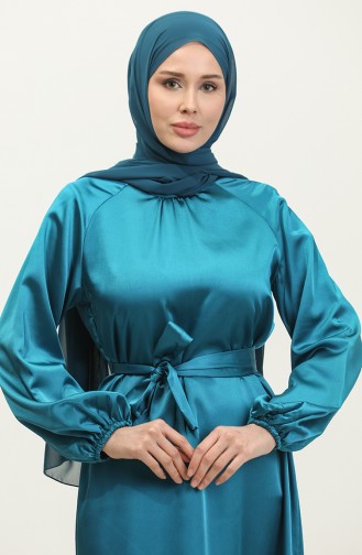 Eteği Volanlı Kuşaklı Saten Elbise 2023113-02 Petrol